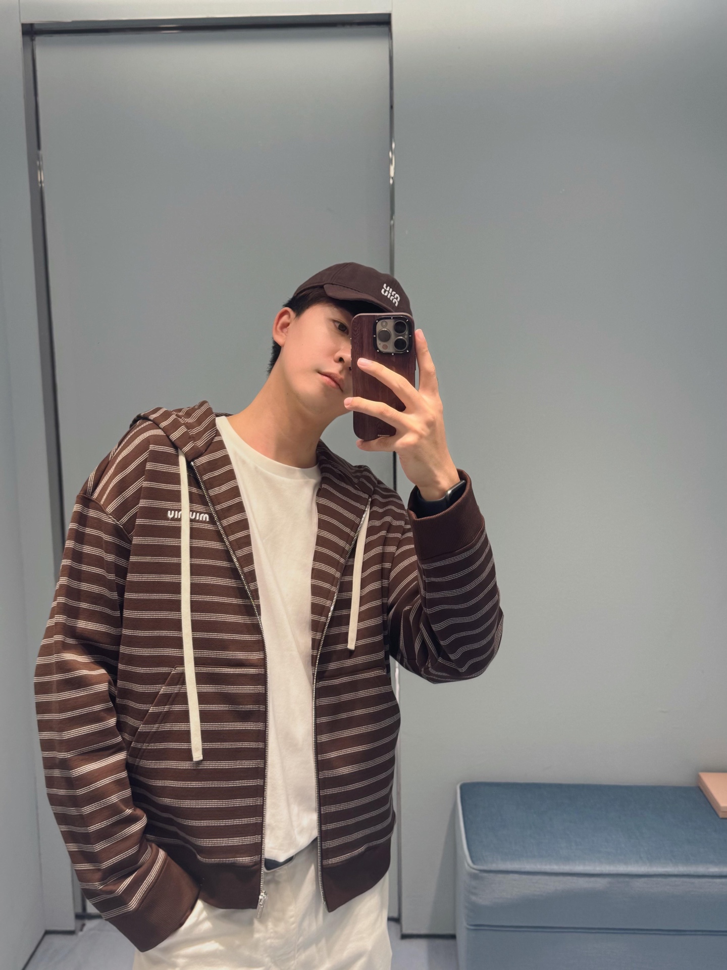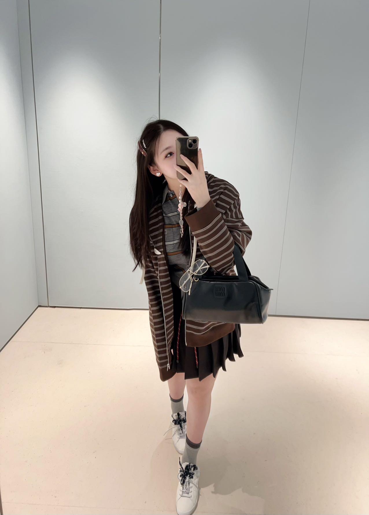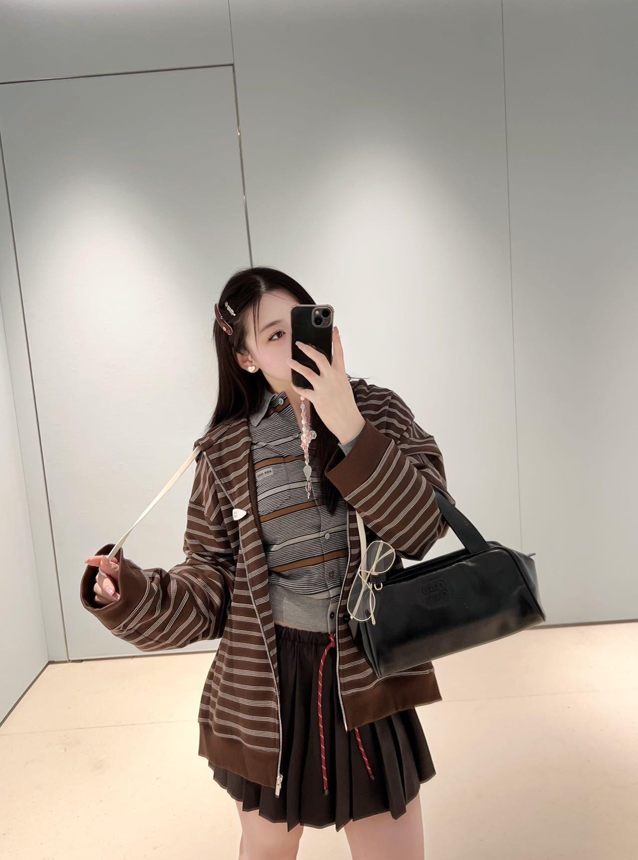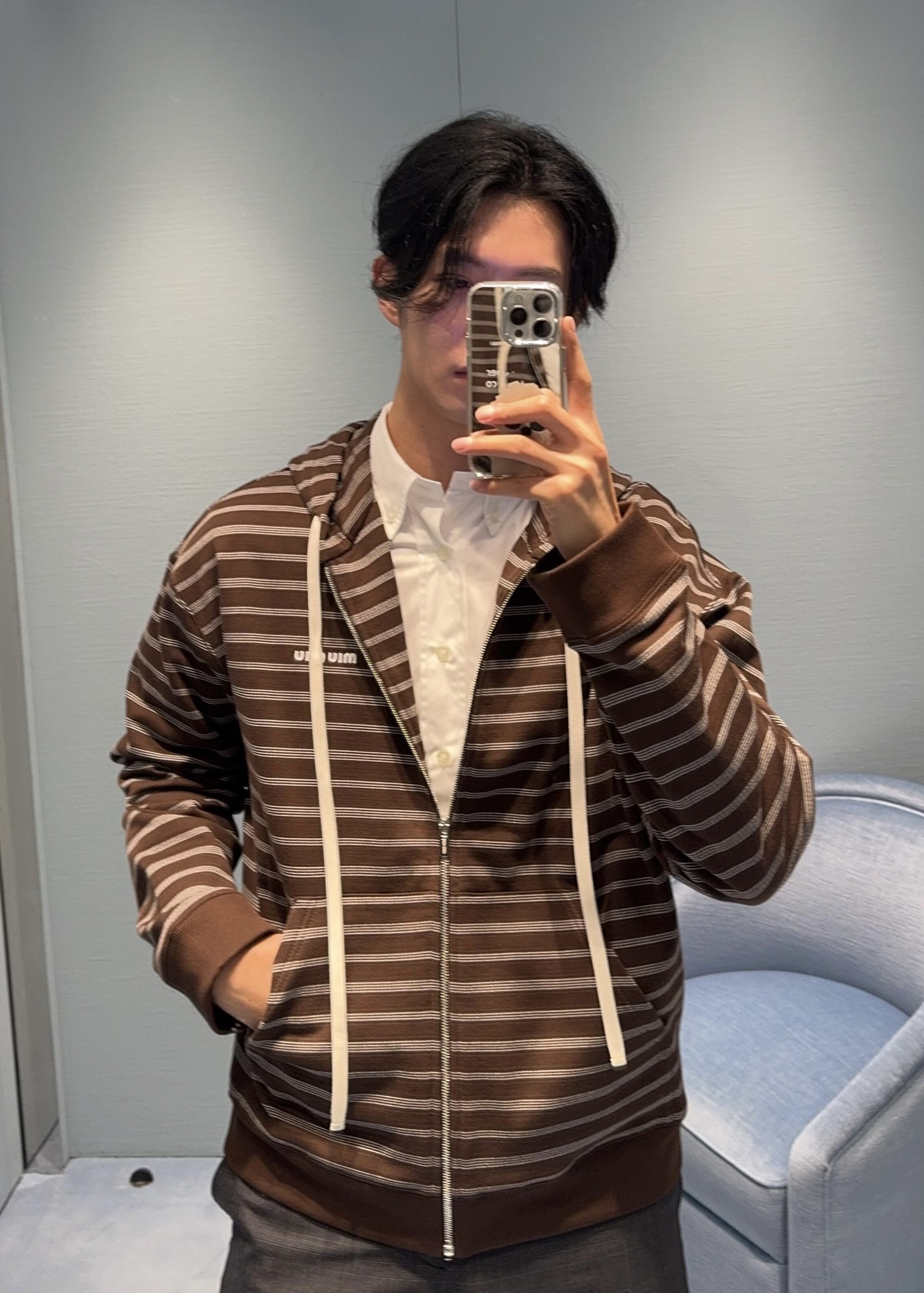 缪缪 25fw早秋新款 咖色条纹棉质拉链连帽卫衣外套(DQJ*MM)