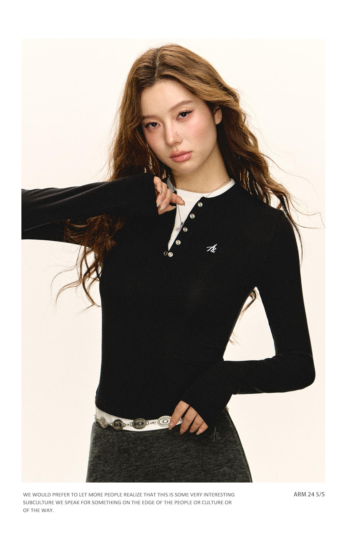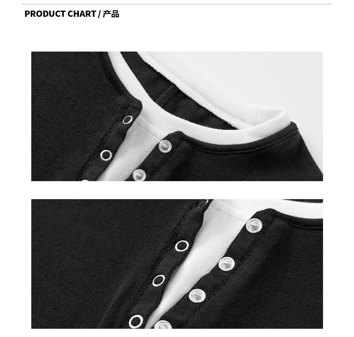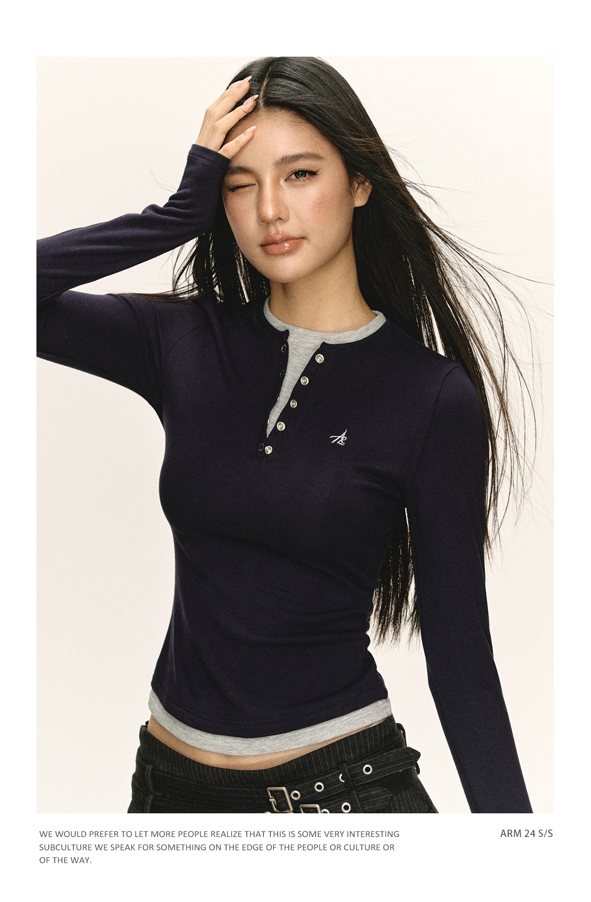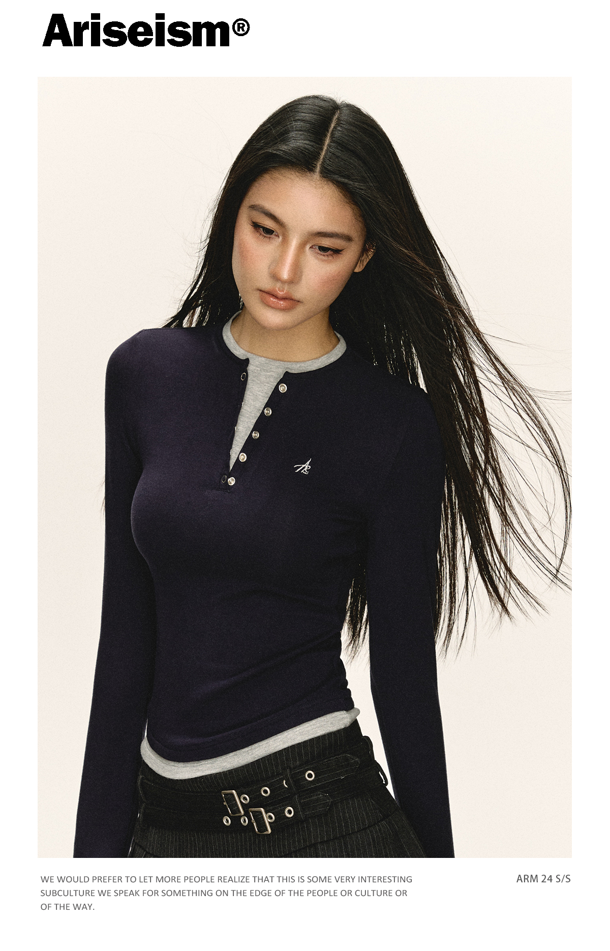 Ariseism 美式复古修身假两件长袖T恤女春季新款内搭打底上衣