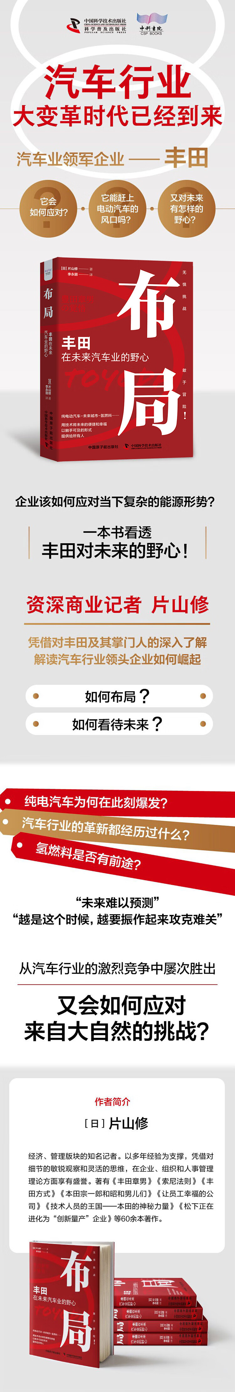 在汽车行业大变局的时刻,本书围绕丰田章男本人及他对丰田汽车发展趋势的应对进行了展开说明。比如从不看好电动汽车到主动开发电动汽车,又或者在日本能源有限的背景下,丰田汽车应该如何破局以及他想建造一座城市的野心,等等。本书有丰田章男在汽车业界的布局及其本人的思考。