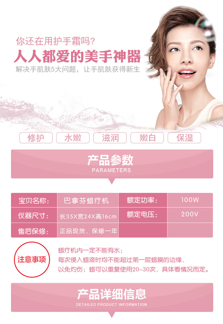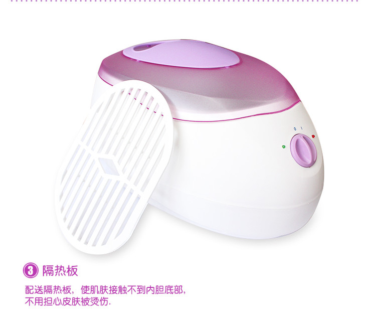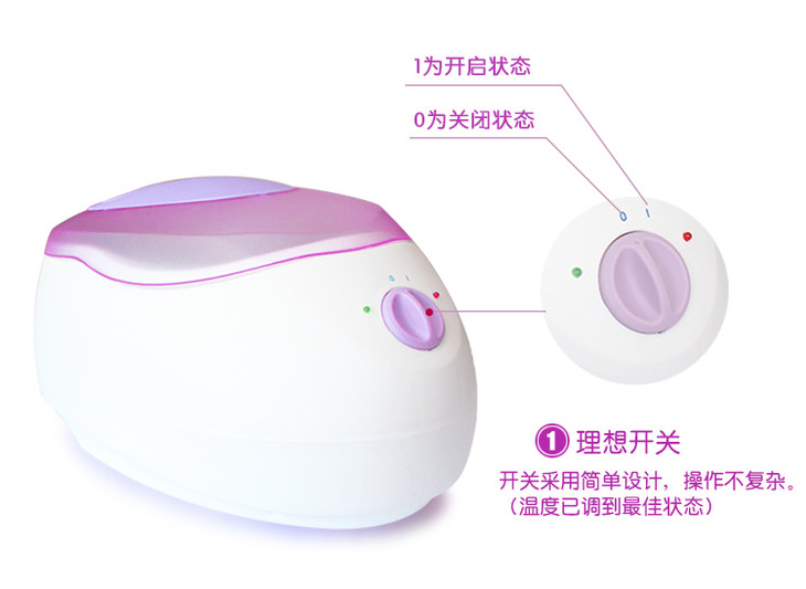 将融化的蜡液盛凉至65℃;在接受护理的手、足等部位,先按刷蜡法涂成蜡保护层,再连续地浸泡蜡液,直至能耐受蜡温时即可固定浸浴其中。此法能充分发挥蜡疗的各种综合性因子的护理作用,但不能用于躯干部。本款巴拿芬腊疗机不仅可用于对手、脚的护理,还可用于面部、甚至全身的护理保养。