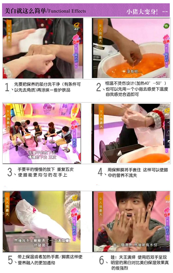 将蜡块切成小块,装进蜡疗机,蜡溶化后就可用刷子刷在面部或手部(手也可以直接放入蜡疗机取蜡)。刷好蜡之后,裹上保鲜纸,然后用本店的专用电热手套、手套裹住效果更佳(如果是脚部,可用家里的保鲜膜包住,再用毛巾裹一层就好了),等待20-30分钟后剥除蜡膜,涂上护手霜。操作时,温度不可过高,皮肤不应有烫的感觉,尤其是用于眼部时,温度不可过高 个人建议:眼部可不用蜡疗