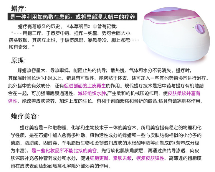 ①由于水的导热性比蜡大,用同样温度的水和蜡同时作用于皮肤时,就会因水滴而引起烫伤。所以蜡疗机内一定不能有水哦!