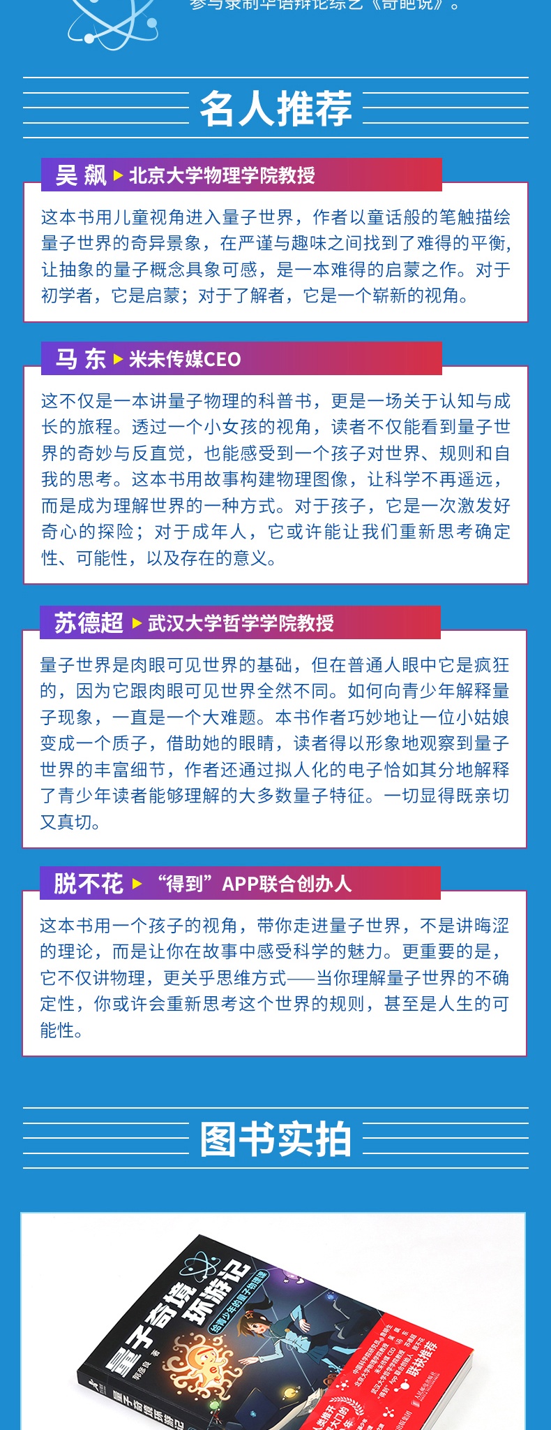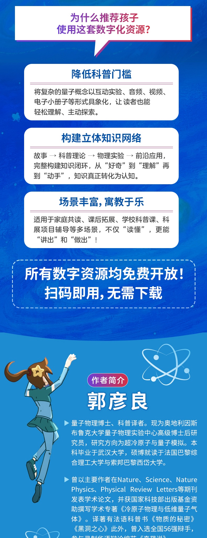 《量子奇境环游记:给青少年的量子物理课》是一本面向青少年的量子物理科普图书。本书通过一个充满奇幻色彩的故事,*读者进入神秘的量子世界。 故事的主人公圆子,在一次意外中进入了微观的量子世界,与一个自称“电子”的伙伴点点”共同经历了一系列奇妙的冒险。在书中圆子与点点一起探索了电场河、彩虹谷等地,见证了量子叠加态、量子涡旋等神奇现象,还观看了一场与众不同的原子足球赛。作者巧妙地将量子物理中的复杂概念,如波粒二象性、粒子的全同性等融入故事情节,使读者在跟随圆子的脚步历险的同时,自然而然地学到了量子物理的基础知识。