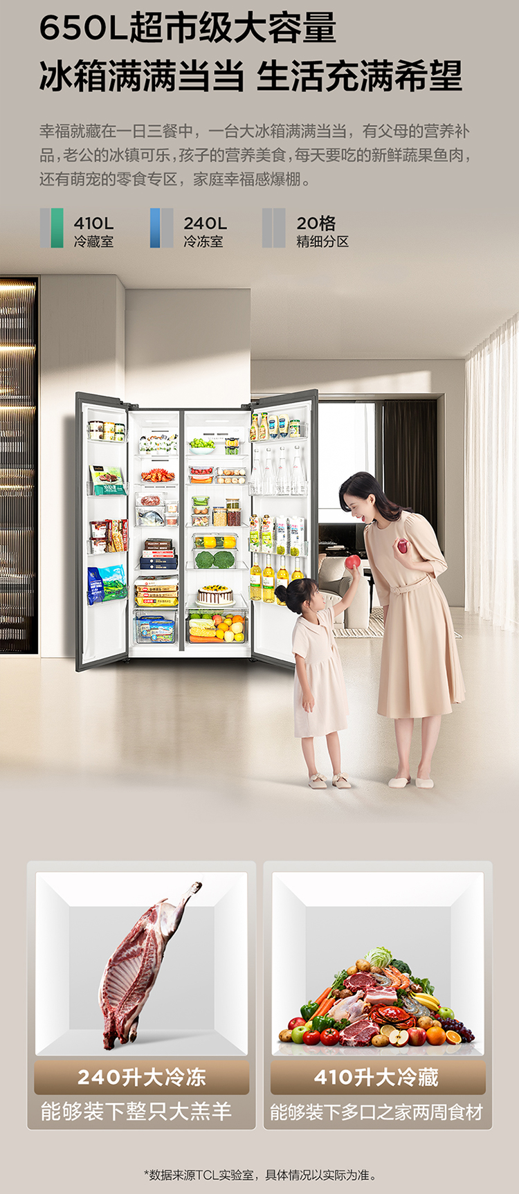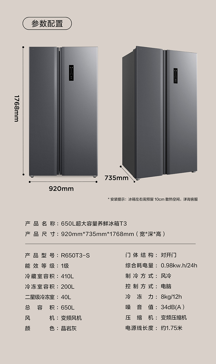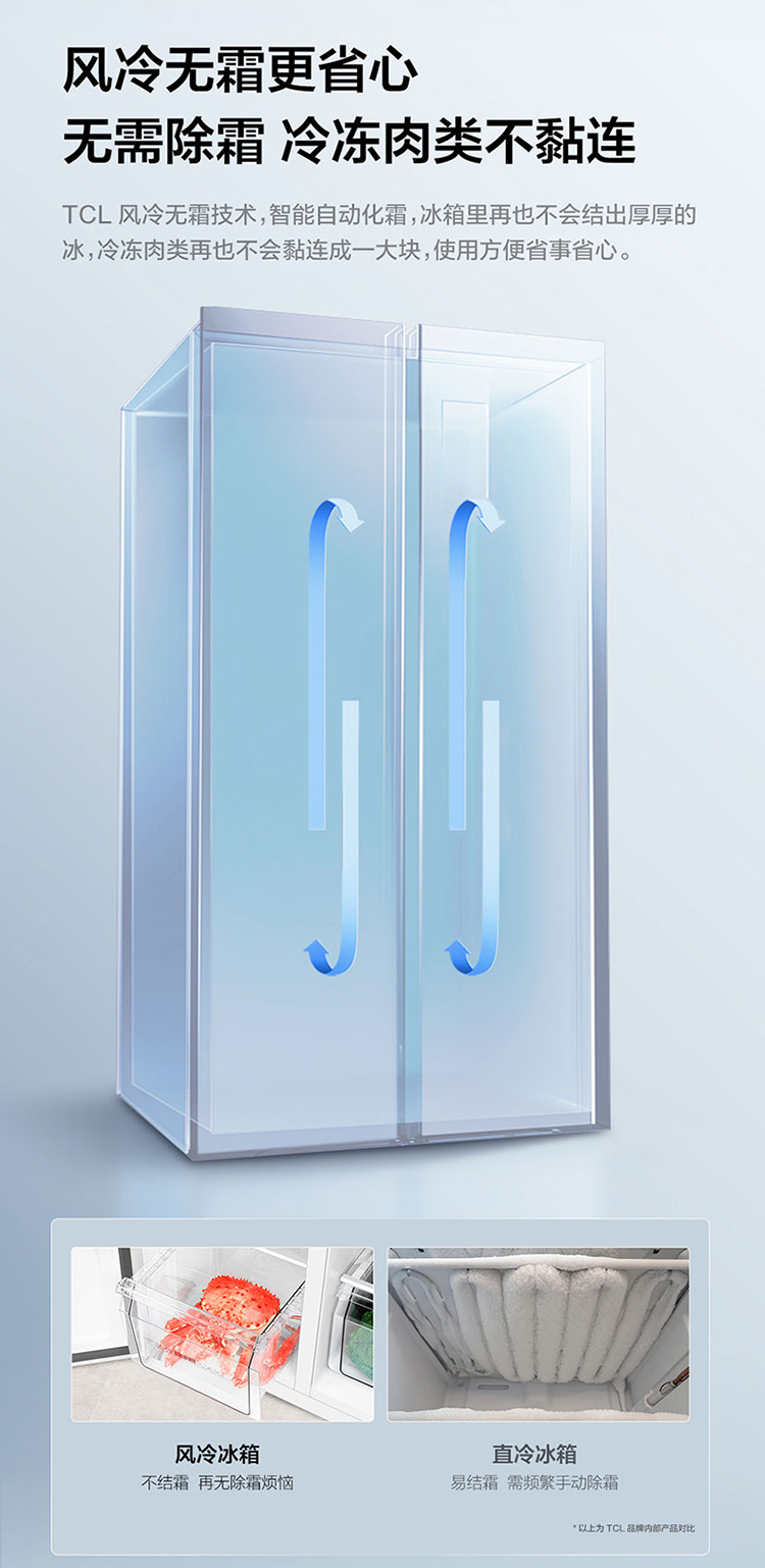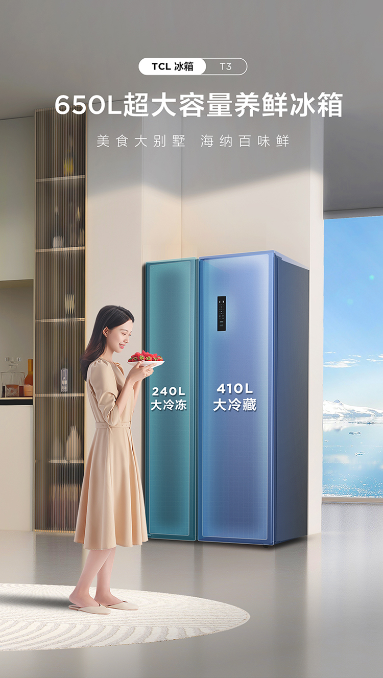 【TCL冰箱】TCL 650升对开门双开门大容量大冷冻冰箱 双变频一级能效 风冷无霜 R650T3-S