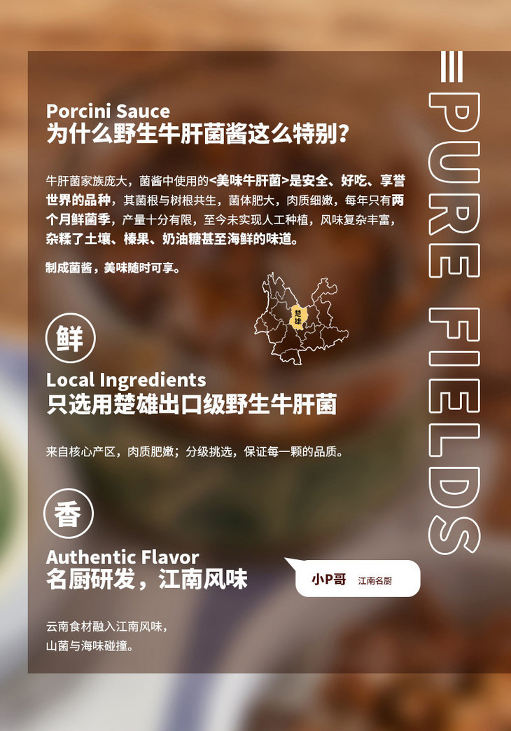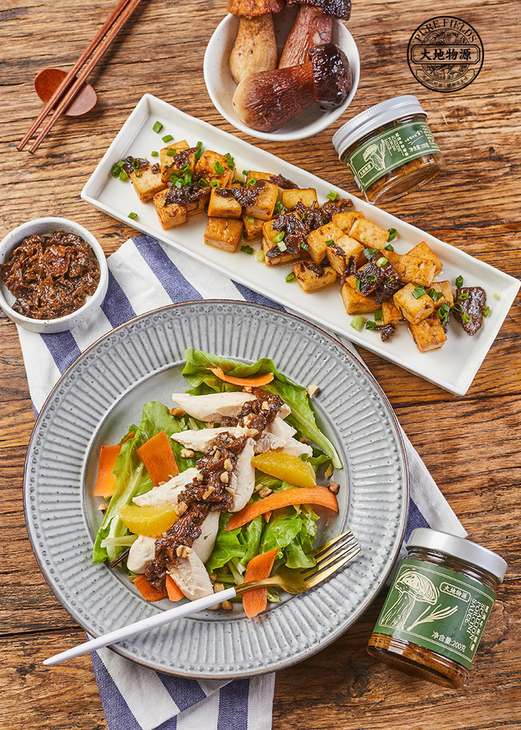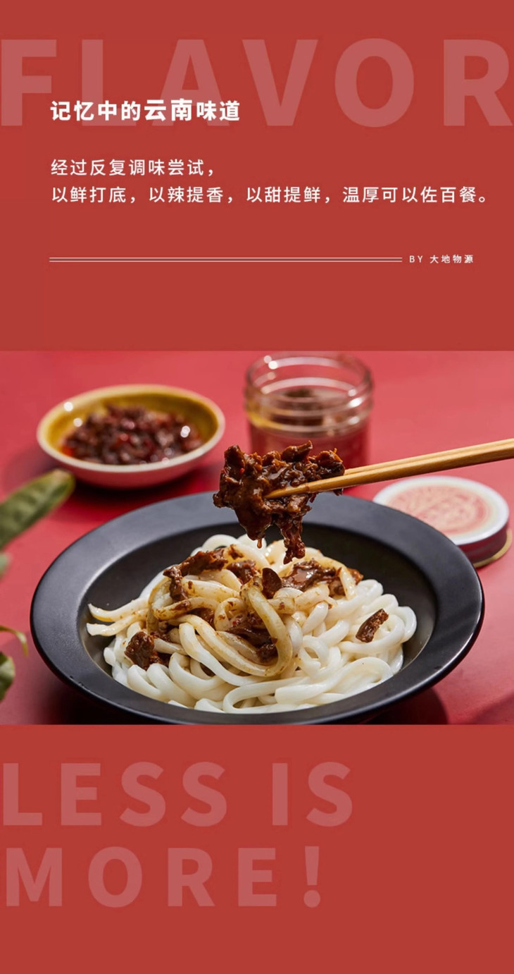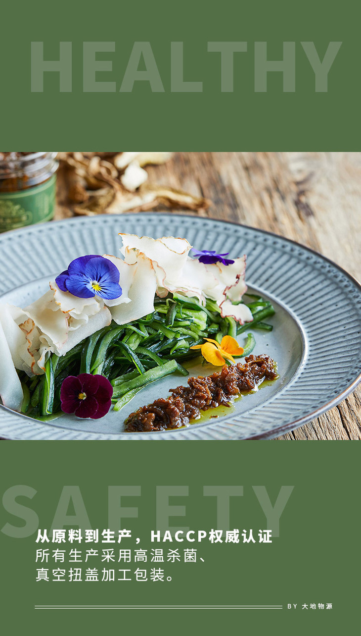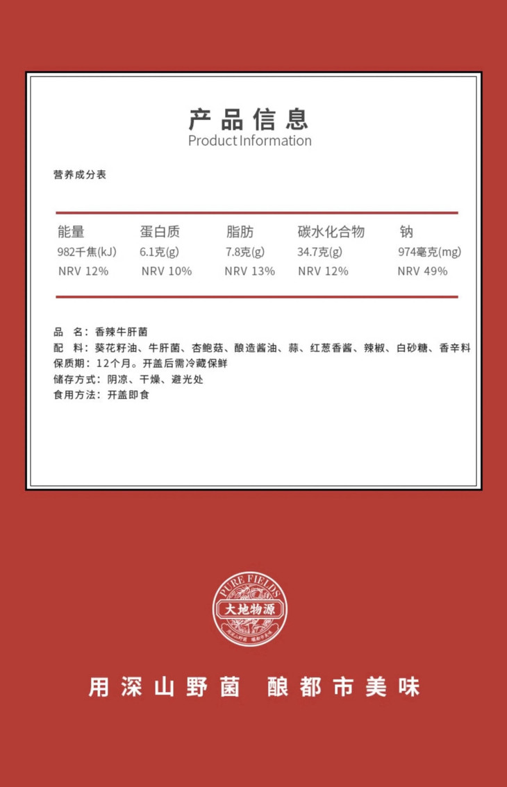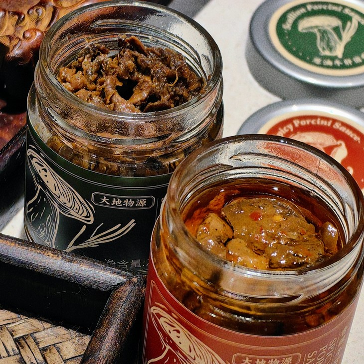 大地物源本身是做菌子进出口的,能搞定不少一手的菌子货源,用料不要太舍得!云南牛肝菌核心产区楚雄的菌子菌盖厚实,风味独特,出口级别野生牛肝菌,经过专人采摘,加上完整冷链运输,新鲜度爆表的菌子快速到达工厂,再经过人工挑选分拣肉质足够饱满的,才能开始制酱。制作时先挥发水分,再慢熬入味,让菌子保留脆嫩口感的同时,又充分吸收汁水的味道,可以说是在菌香和口感之间找到了很棒的平衡,才能吃出最迷人的土壤、榛果、奶油糖甚至贝类的风味!菌子本身够好、够鲜,所以能自信到不放味精、鸡精,连防腐剂都没有,配料表干净得仿佛自家做菜!
