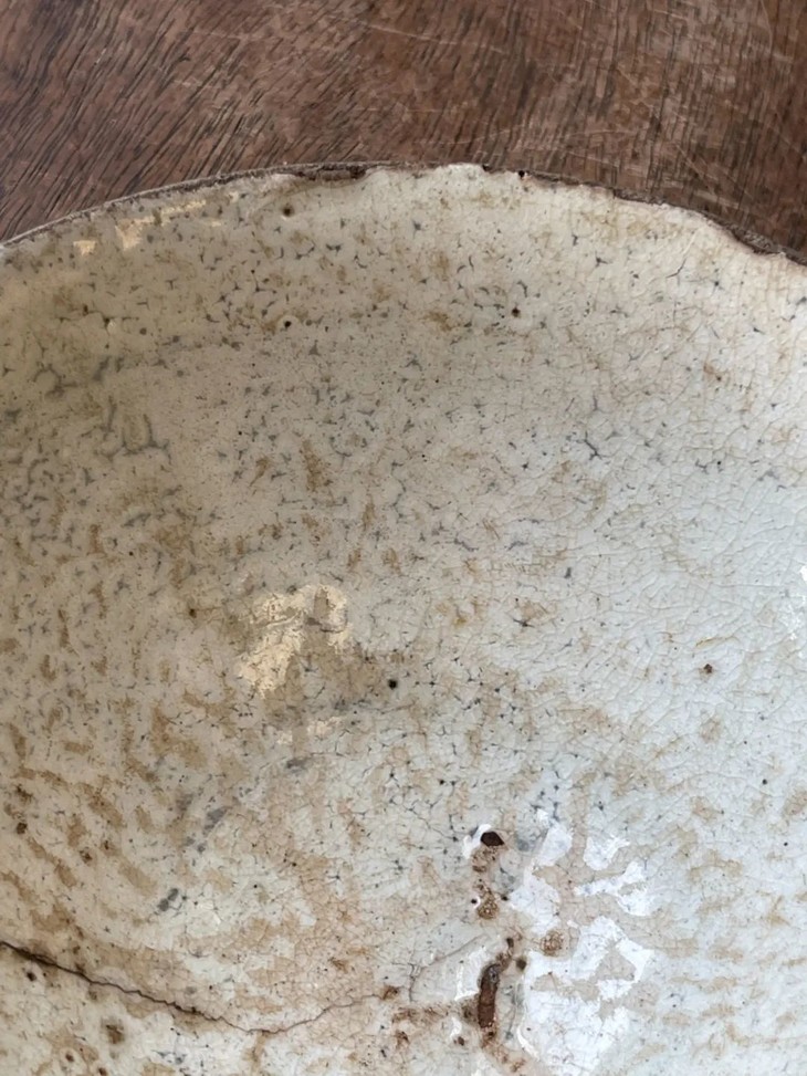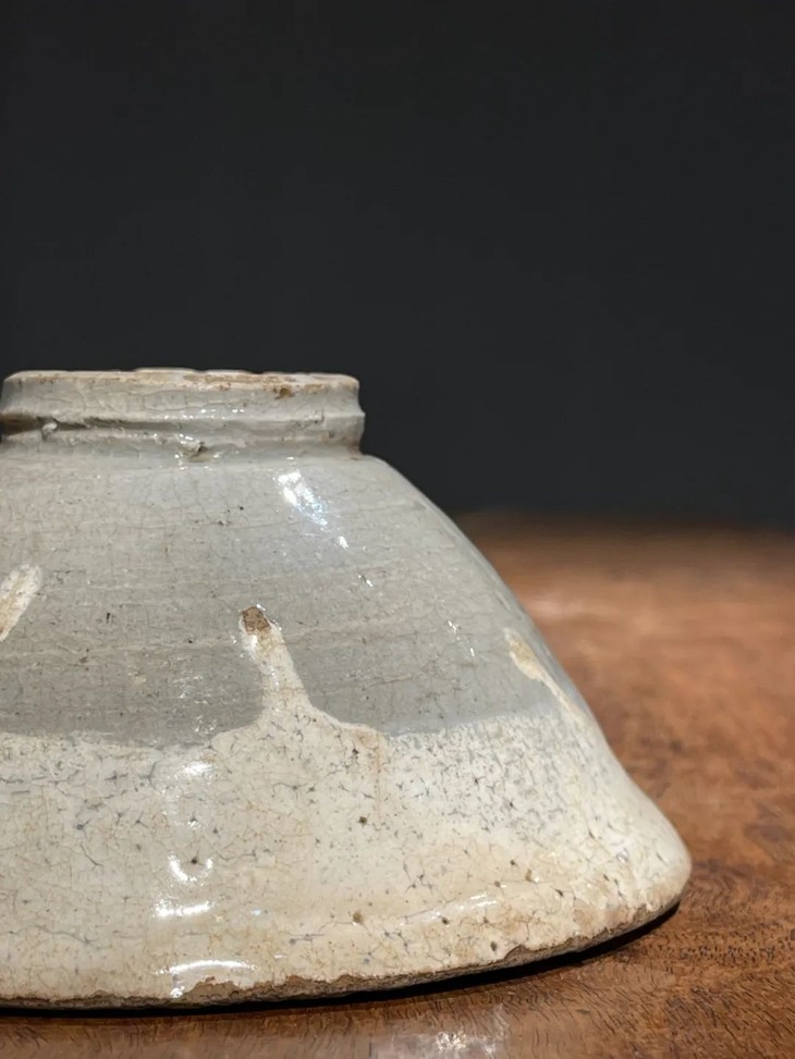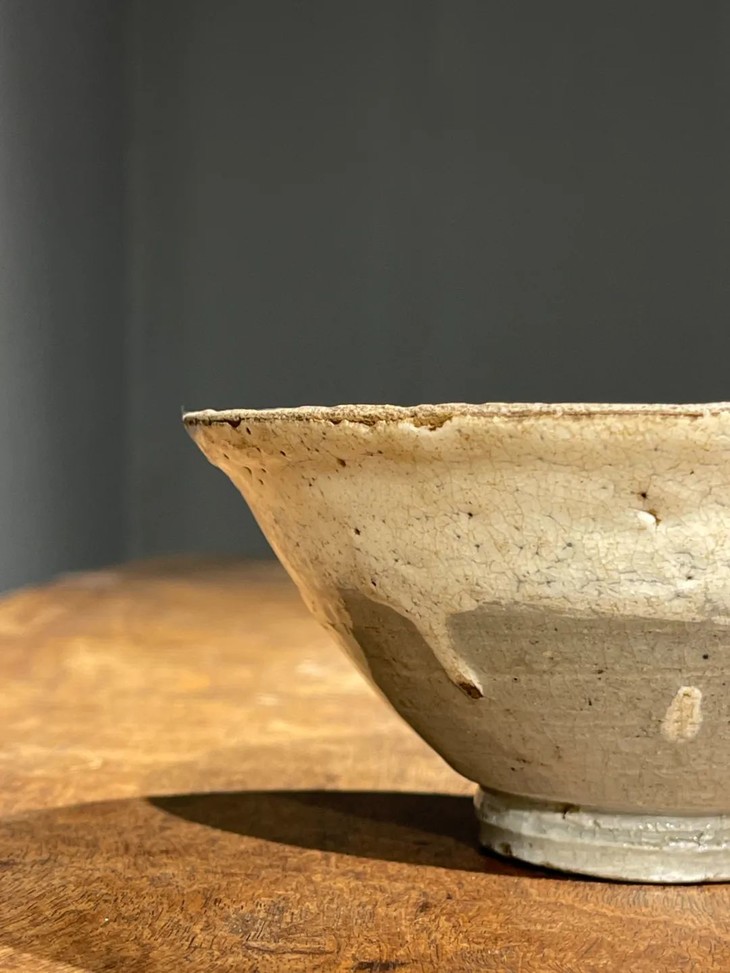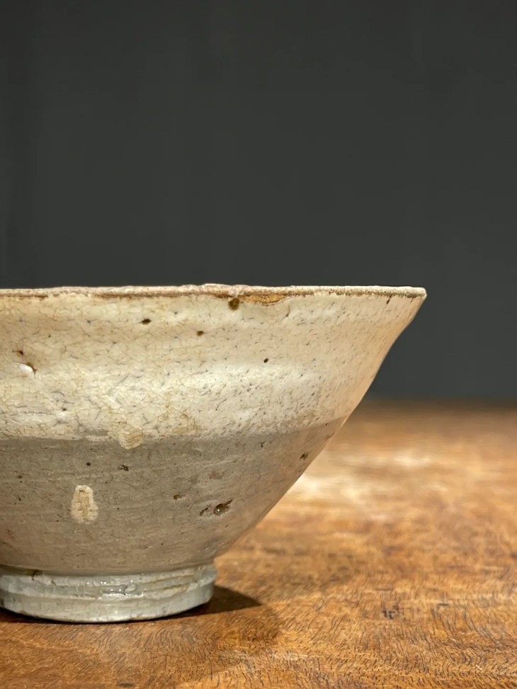 这是一件烧制于朝鲜半岛由历代日本茶人收藏的老茶碗,碗壁薄略撇口的斗笠形式典雅、气质出众。此斗笠碗上白化妆土与透明釉的制作方式源于中原河北地区的磁州窑,灰陶土胎罩上白色化妆土,覆盖透明釉后入窑烧制而成,此类陶瓷是朝鲜半岛除高丽青瓷外较著名的品类,当地称之为“粉青砂器“类陶瓷。对于日本古陶瓷工艺有涉猎的朋友应该都知道,日本陶艺中常用的“刷毛目“与“粉引”之陶瓷装饰手法正是来自粉青砂器这类的朝鲜陶瓷。