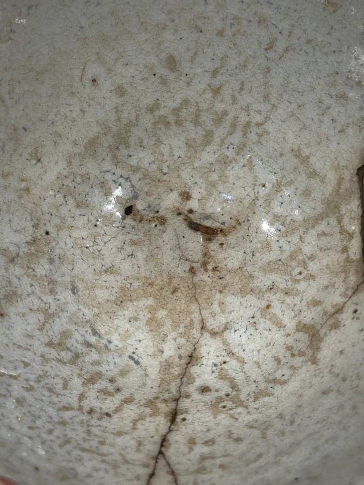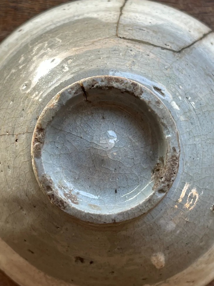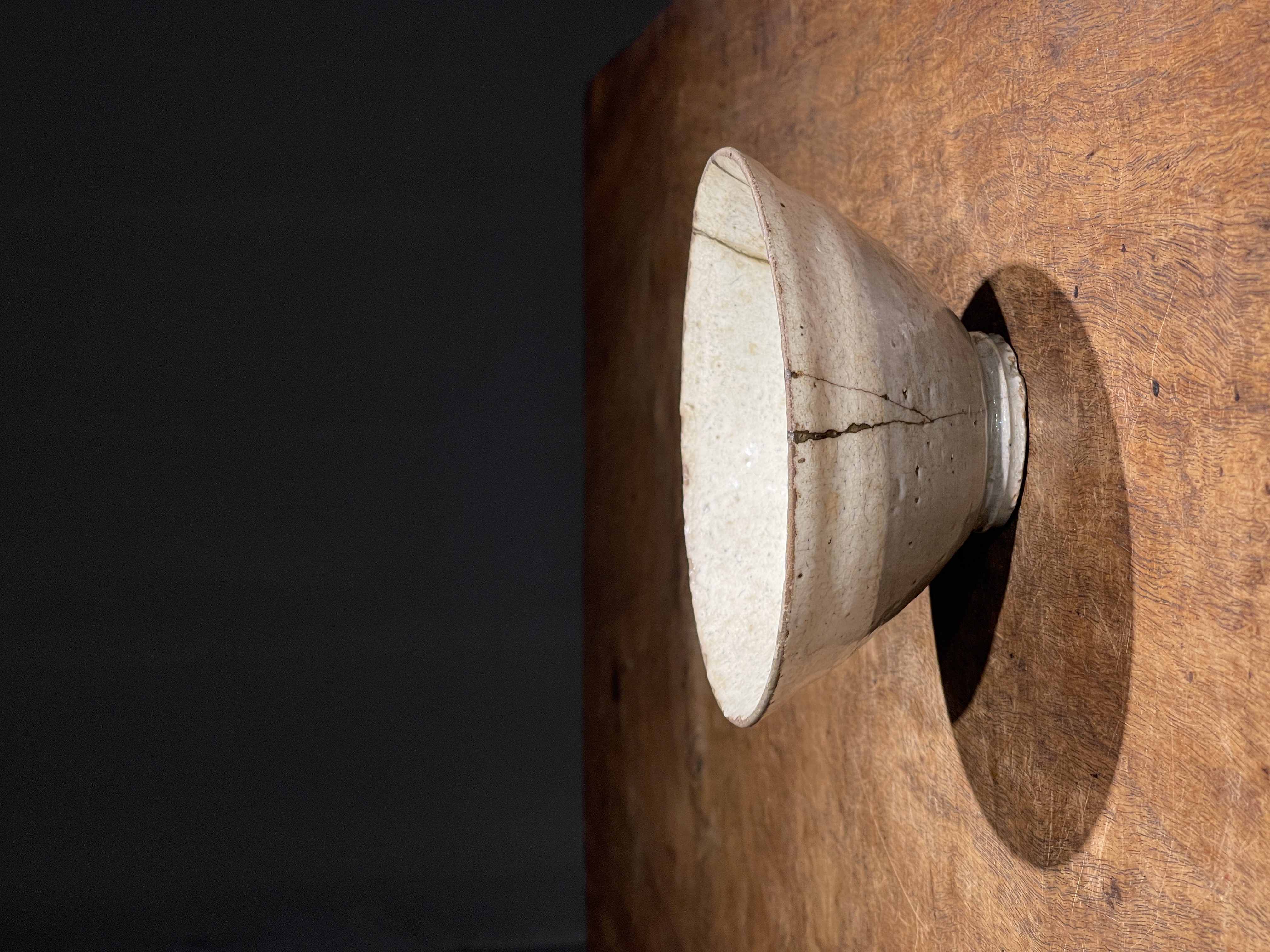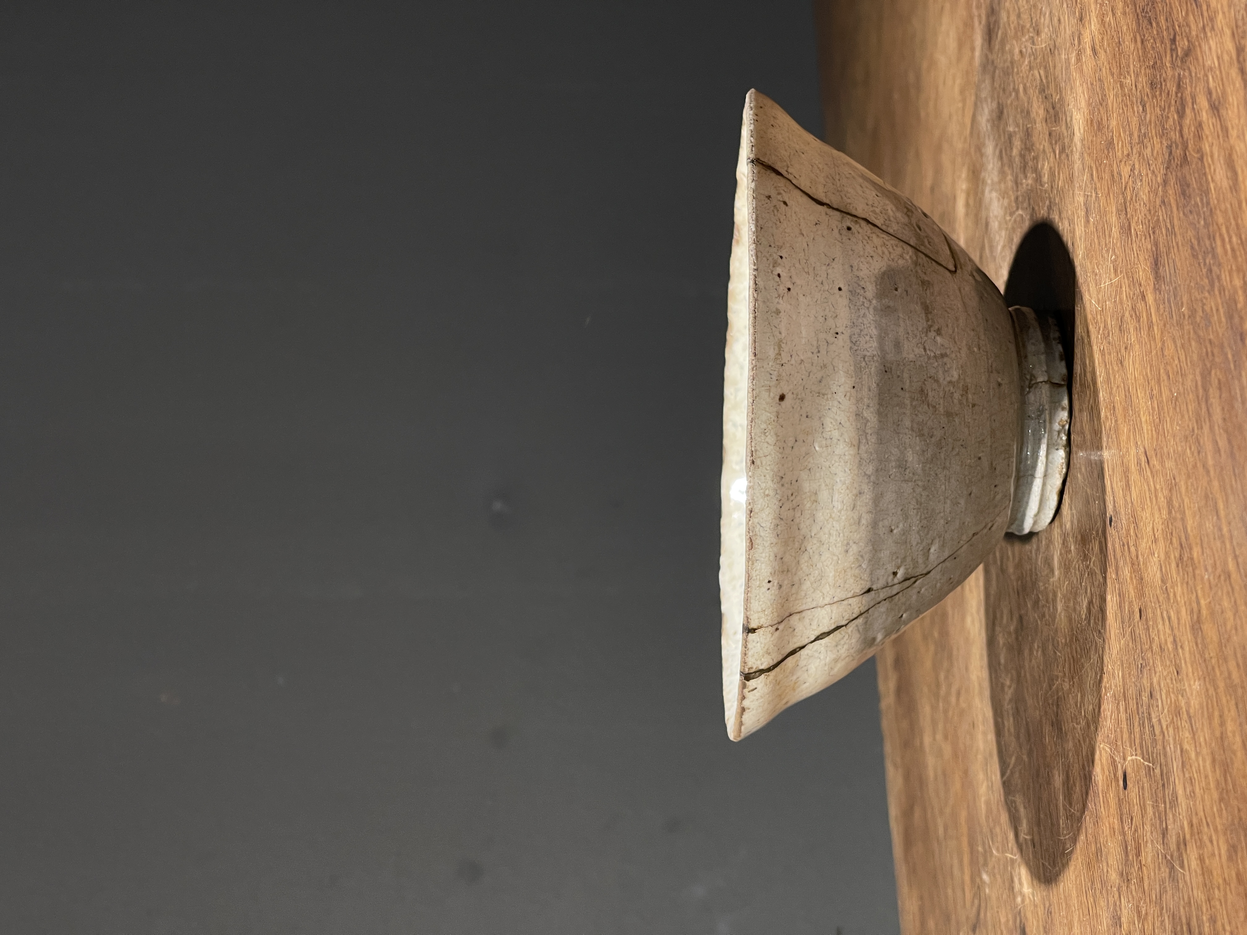 这是一件烧制于朝鲜半岛由历代日本茶人收藏的老茶碗,碗壁薄略撇口的斗笠形式典雅、气质出众。此斗笠碗上白化妆土与透明釉的制作方式源于中原河北地区的磁州窑,灰陶土胎罩上白色化妆土,覆盖透明釉后入窑烧制而成,此类陶瓷是朝鲜半岛除高丽青瓷外较著名的品类,当地称之为“粉青砂器“类陶瓷。对于日本古陶瓷工艺有涉猎的朋友应该都知道,日本陶艺中常用的“刷毛目“与“粉引”之陶瓷装饰手法正是来自粉青砂器这类的朝鲜陶瓷。
