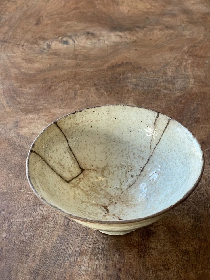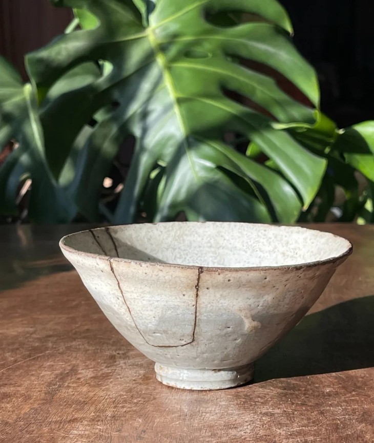 此件朝鲜粉引釉斗笠形茶碗,整体风格简约典雅,是流传于日本茶道圈的十六世纪朝鲜粉青砂器粉引釉典型器,因磕伤裂痕与断裂,经日本专业金缮修复技艺精心修补,具备历代日本茶人审美情趣的优雅及古朴之气质。