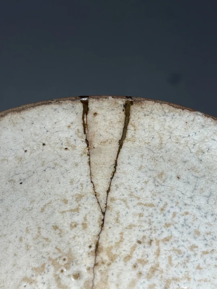 此朝鲜粉引釉斗笠形茶碗,如图所示,因磕伤裂痕与断裂,经日本专业金缮修复技艺精心修补,釉面除局部茶渍与使用磨痕外,釉面土蚀剥落斑釉面仍然保持亮丽,无其它损伤。