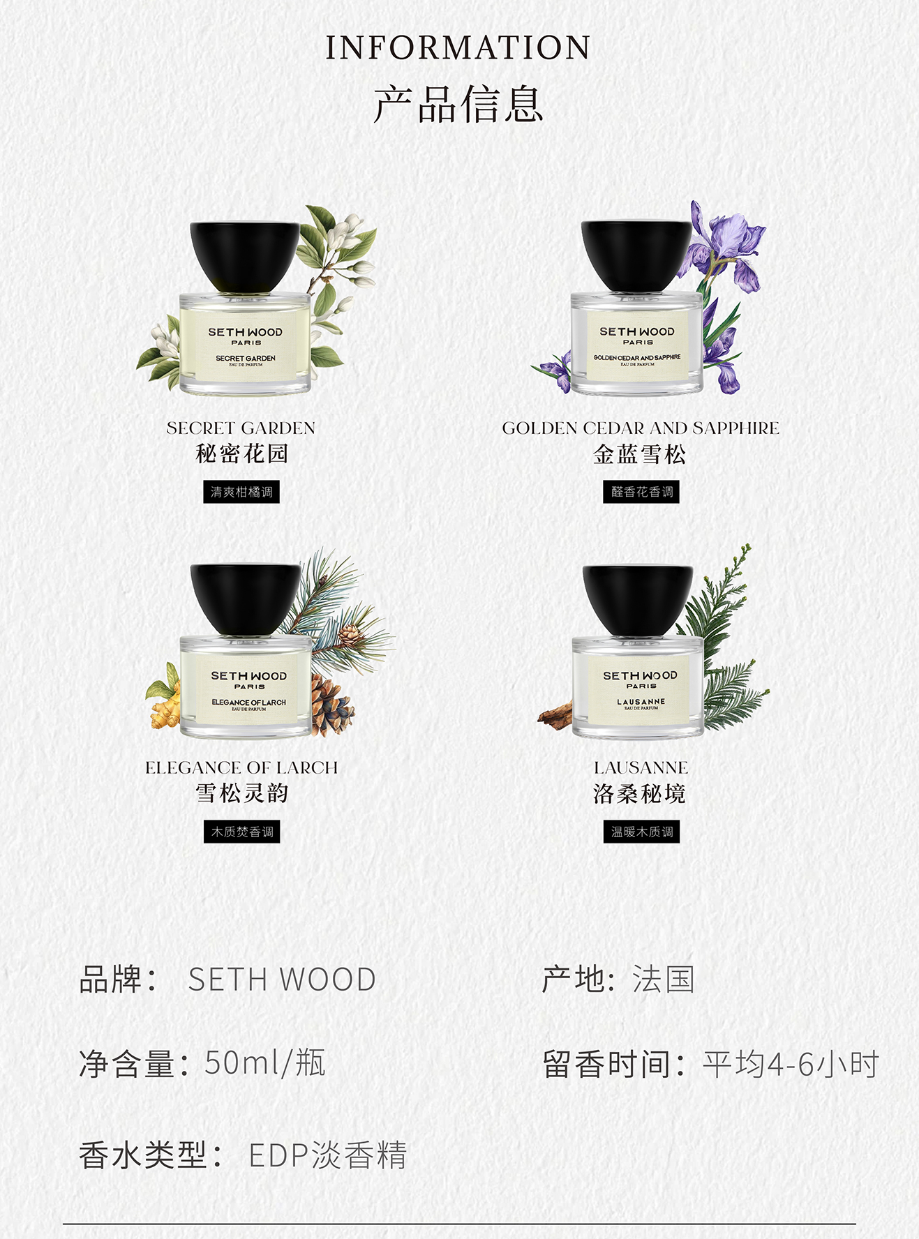 【品名】SETH WOOD塞斯伍德 记忆唤醒系列香水 法国原装进口 4种香型 50ml/瓶 【规格】 洛桑秘境50ml/瓶(温暖木质调) 秘密花园50ml/瓶(清爽柑橘调) 金蓝雪松50ml/瓶(醛香花香调) 雪松灵韵50ml/瓶(木质焚香调) 【产地】法国 【发货包装】独立包装 【发货地】浙江 【发货快递】中通、申通随机发 【补邮费地区】新疆、西藏、青海+15元 内蒙古、宁夏、甘肃、海南+10元 【发货时效】48-72小时,周末节假日顺延 |