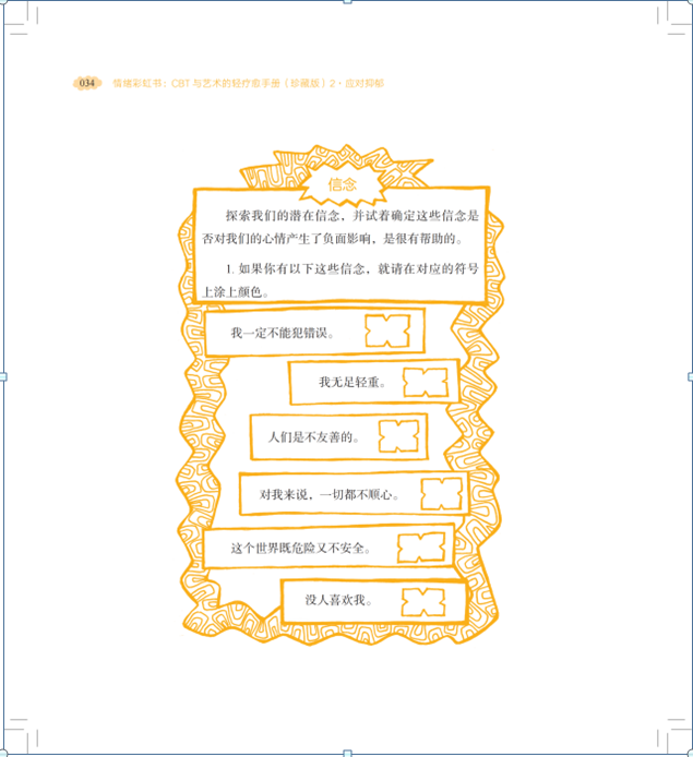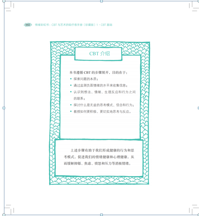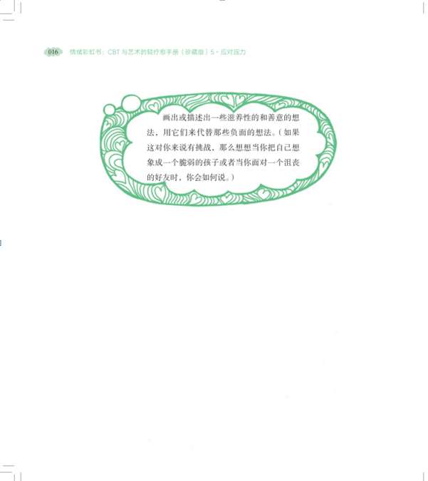 此外,本书也可以作为专业心理治疗师的辅助工具,结合CBT技术,通过互动性练习更加有效地挑战和改变来访者无益的思维方式,加速治疗进程。独特的艺术疗愈设计可能会给来访者带来灵感和全新的启示,也特别适合陷入思维困境或者在语言表述上有困难的来访者。
