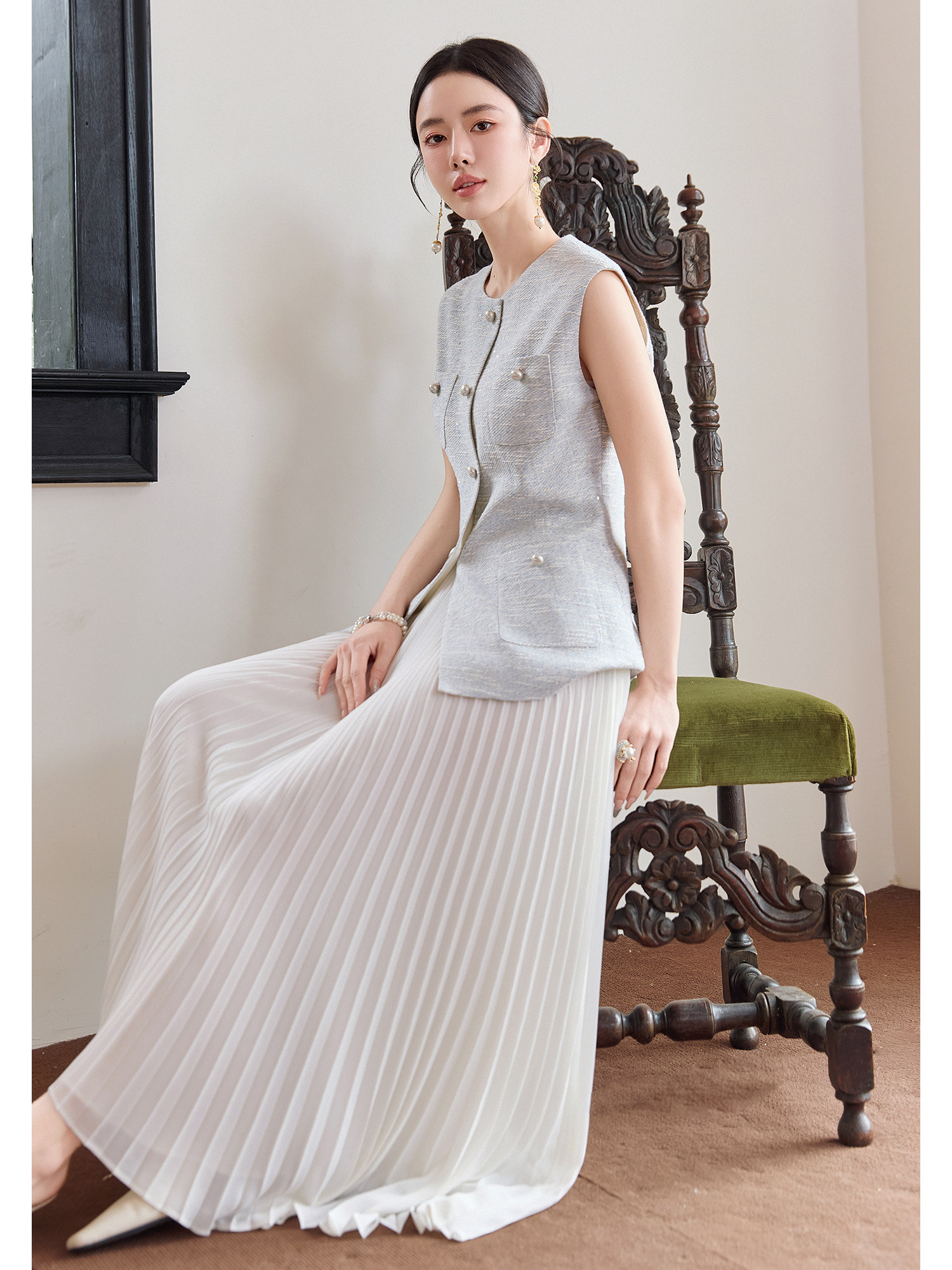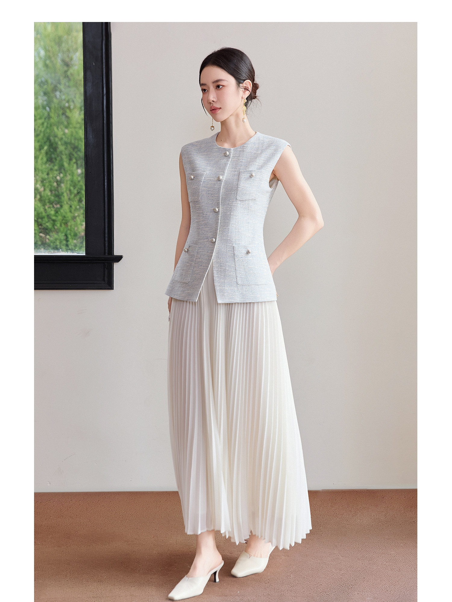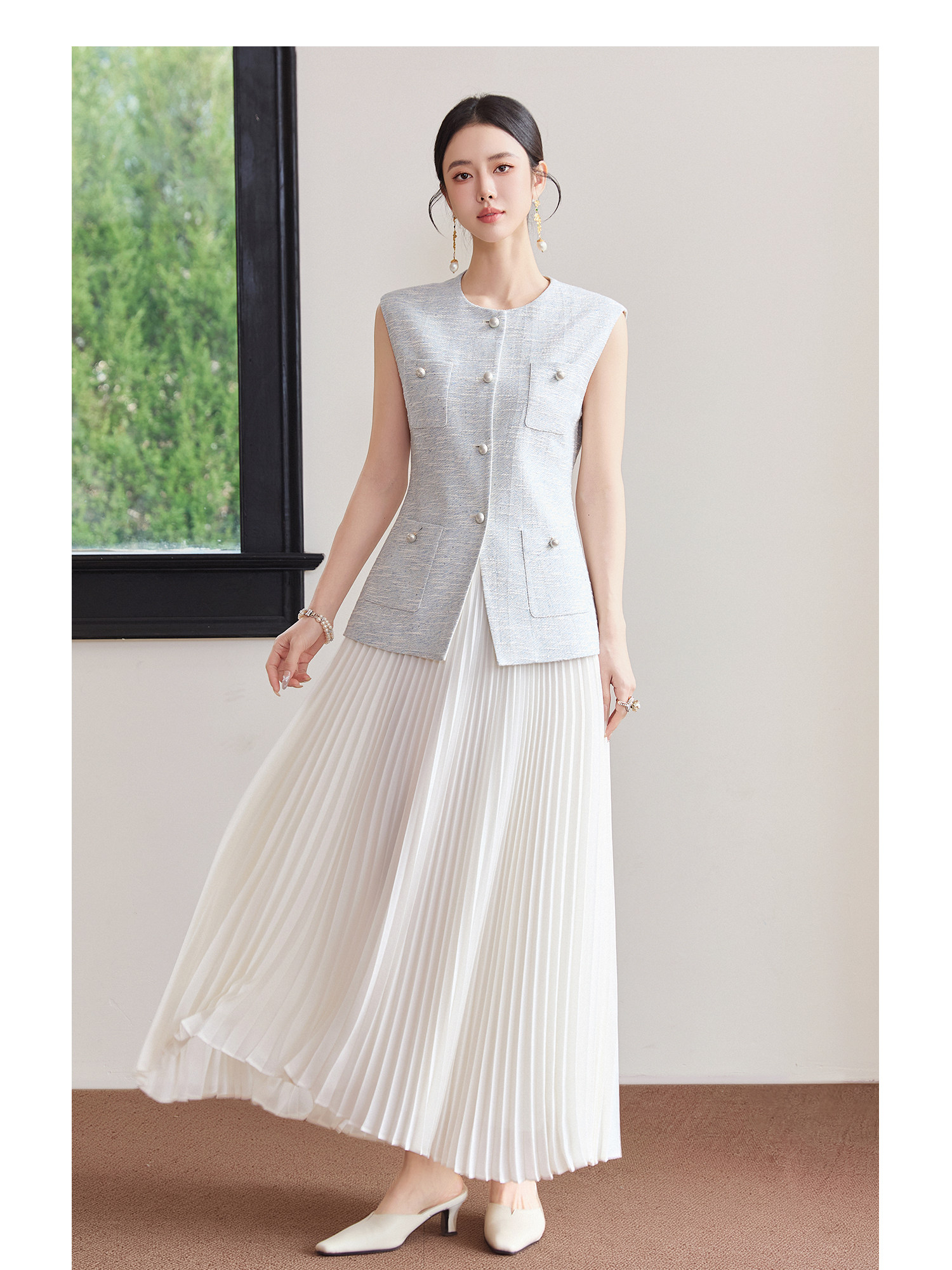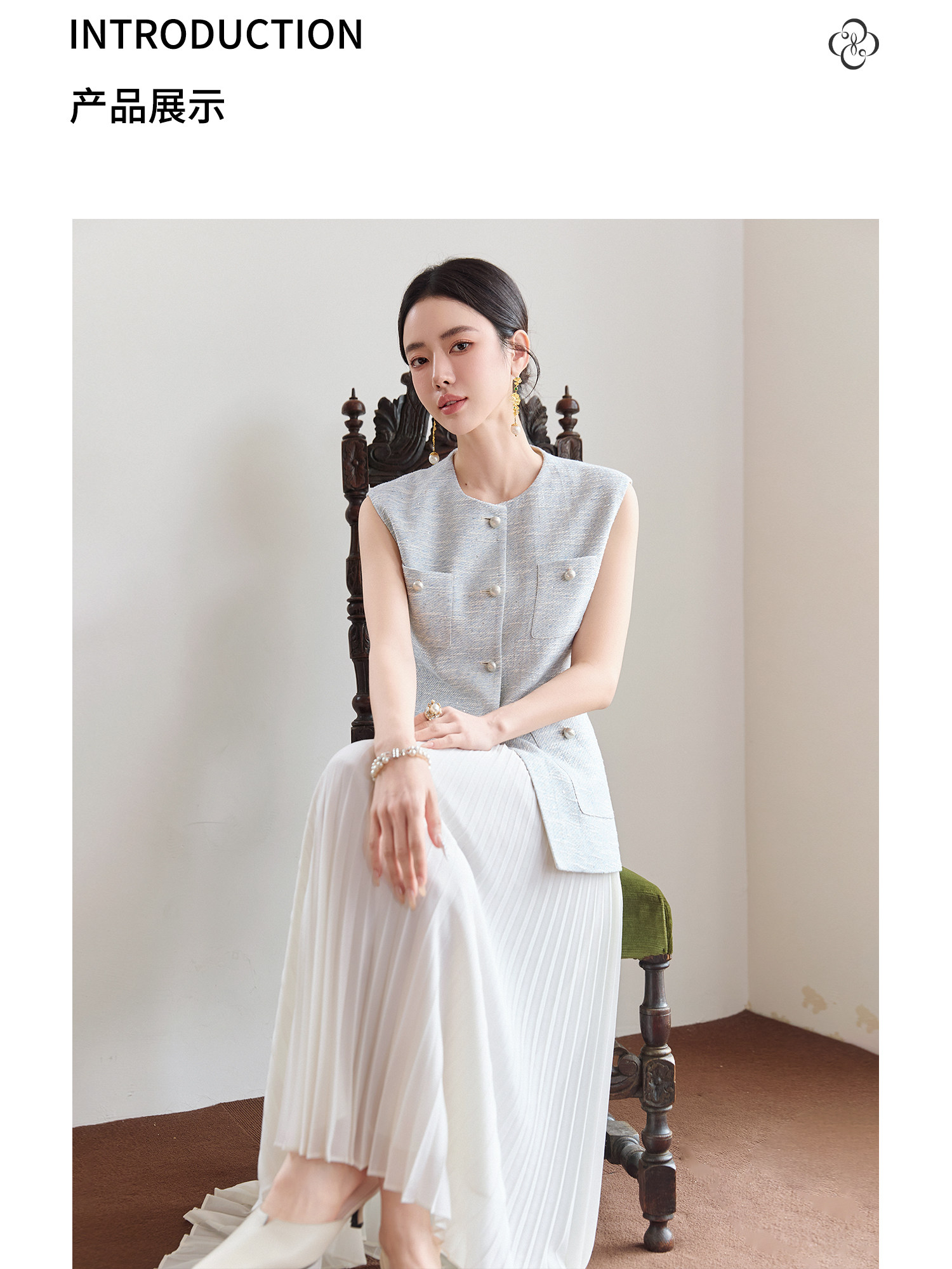 AD小香风套装女夏2026新款轻奢高级感洋气马甲白色压褶裙子两件套