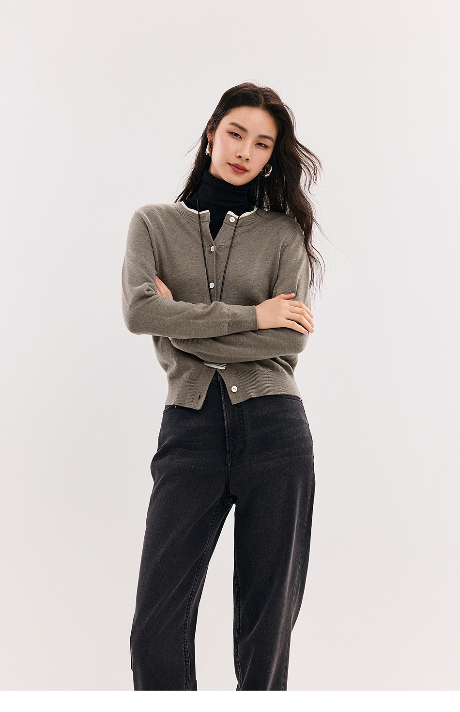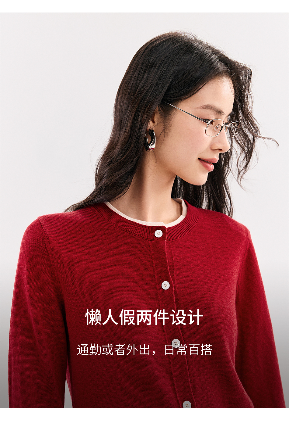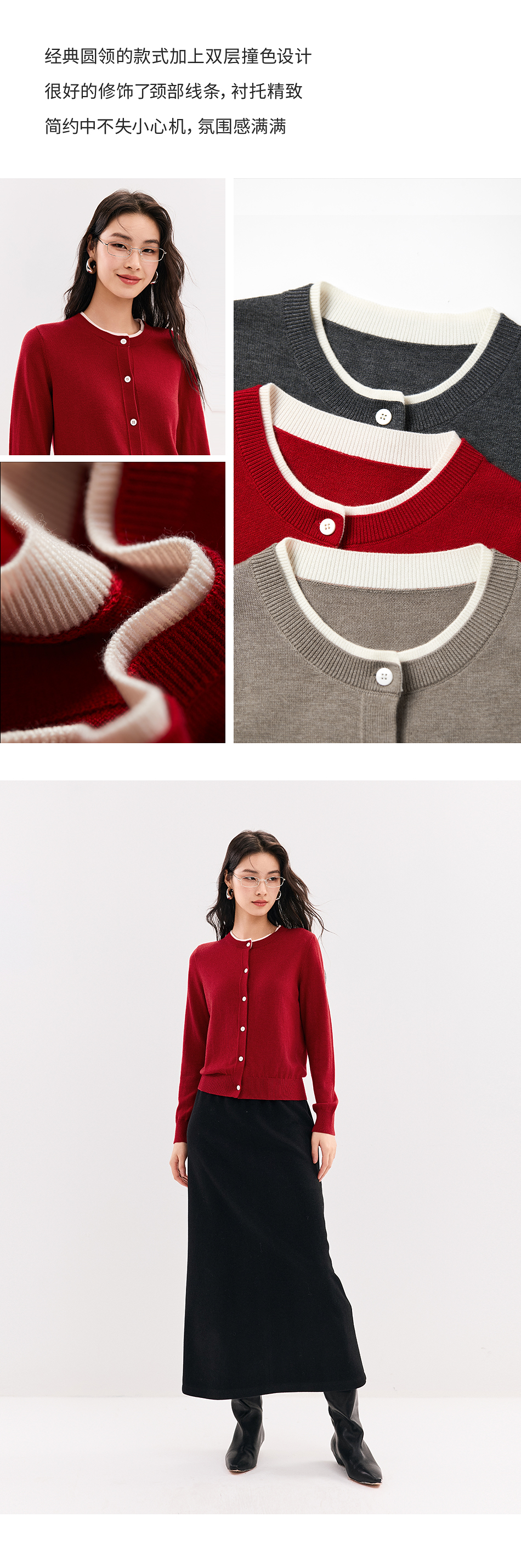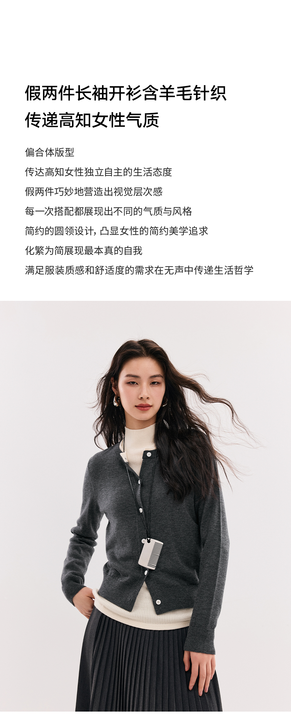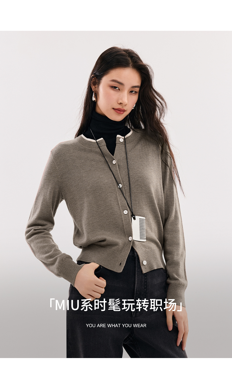 棉仓356605025-撞色边假两件长袖开衫 MIU系含羊毛针织衫简约正肩早秋外套
