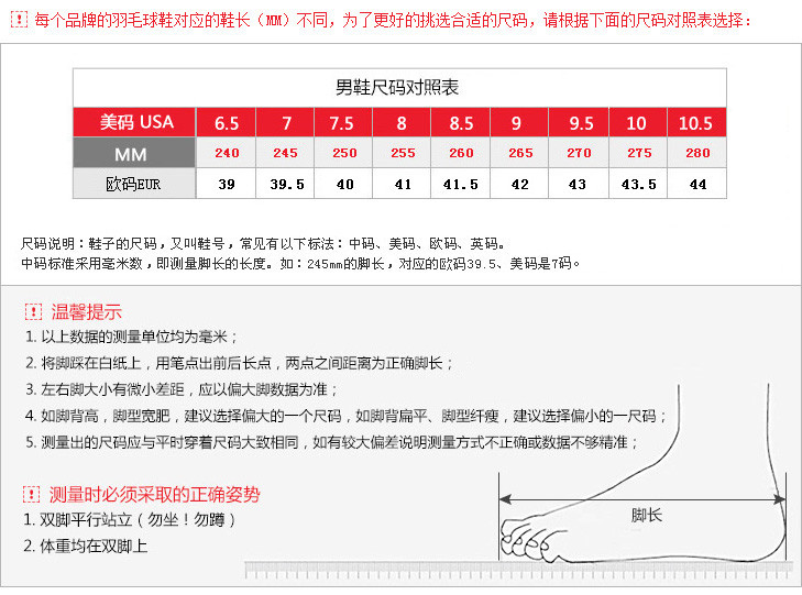 每个品牌的羽毛球鞋对应的鞋长(MM)都不同,为了更好的挑选合适的尺码,请根据下面的尺码对照表选择:
