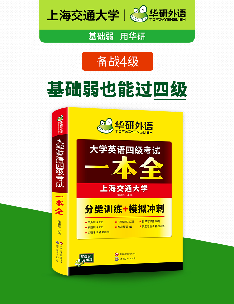 2. 题量丰富,含8套听力训练 + 32篇阅读训练 + 40篇翻译与写作训练 + 6套真题,适合基础弱学生做题提升;