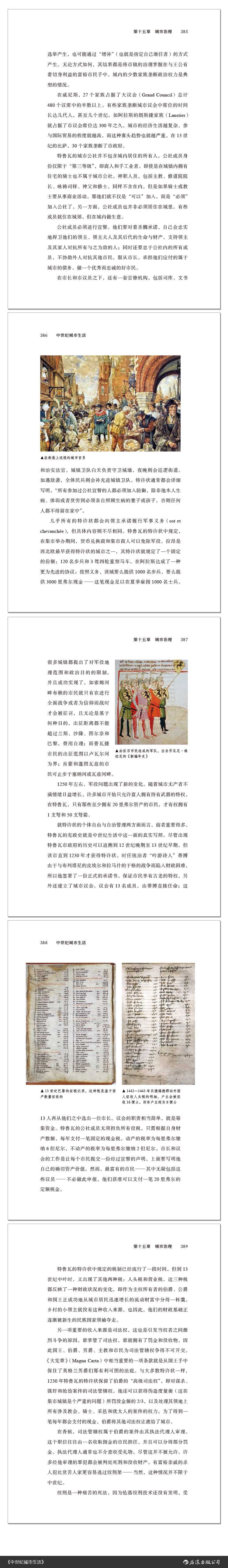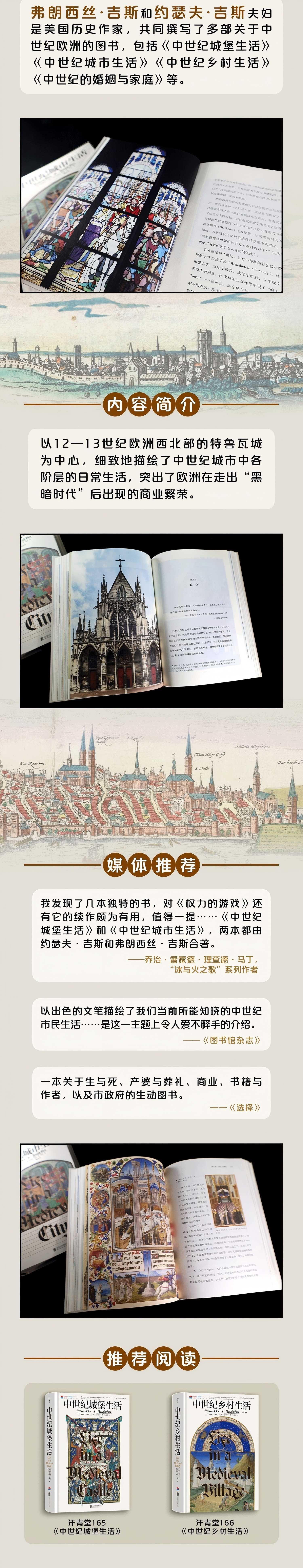 《中世纪城市生活》以1213世纪欧洲西北部的特鲁瓦城为中心,细致地描绘了中世纪城市中各阶层的日常生活,突出了欧洲在走出;黑暗时代后出现的商业繁荣。