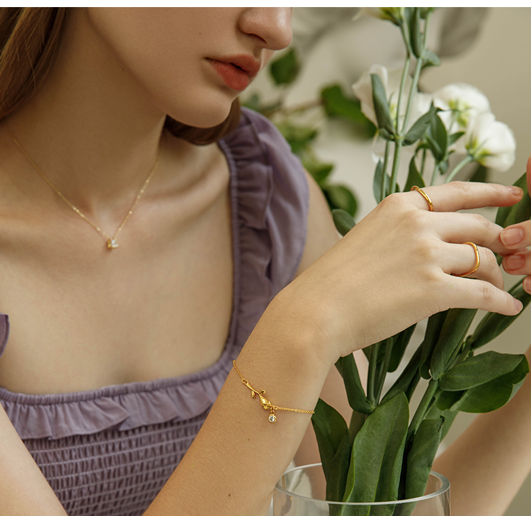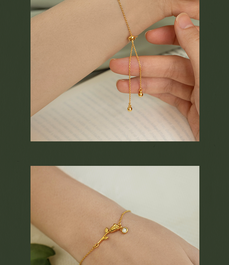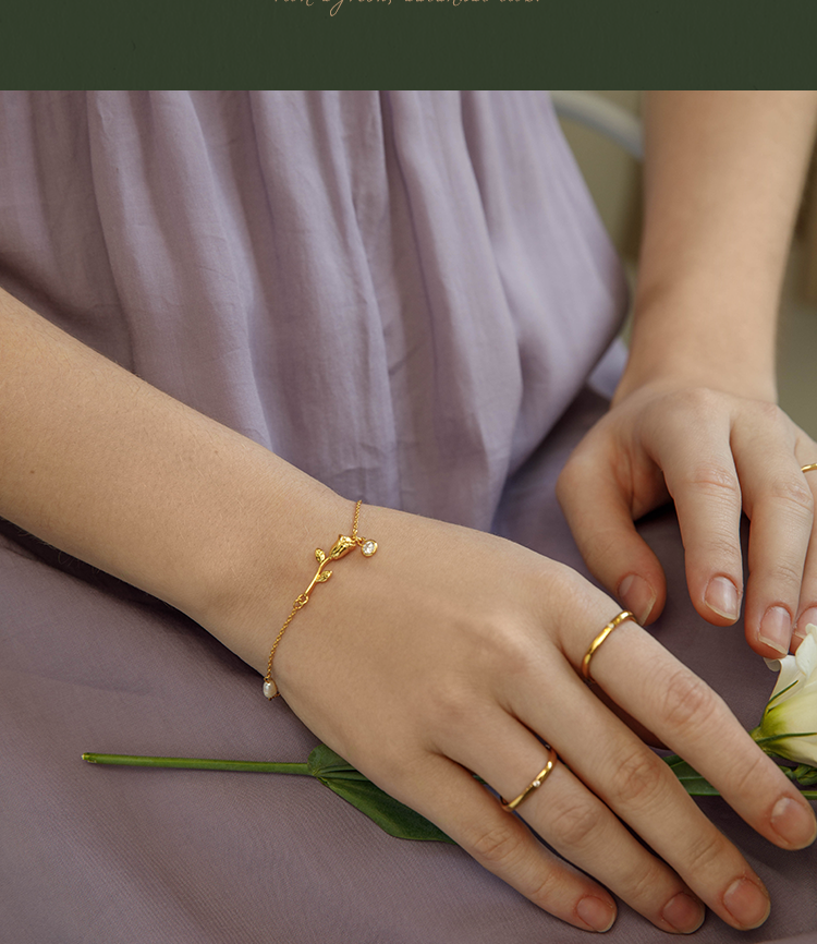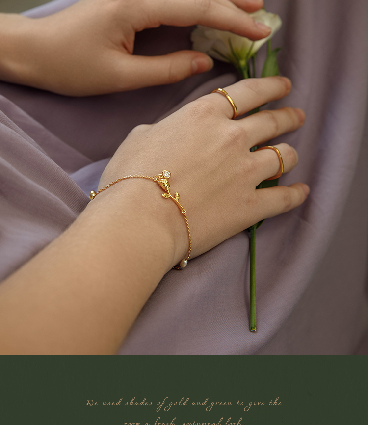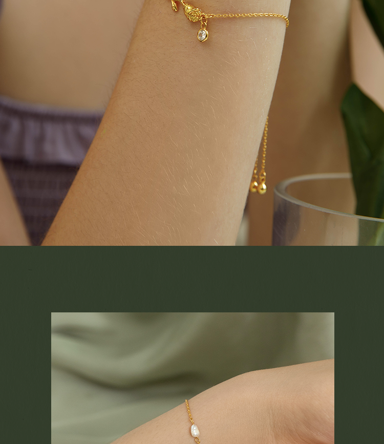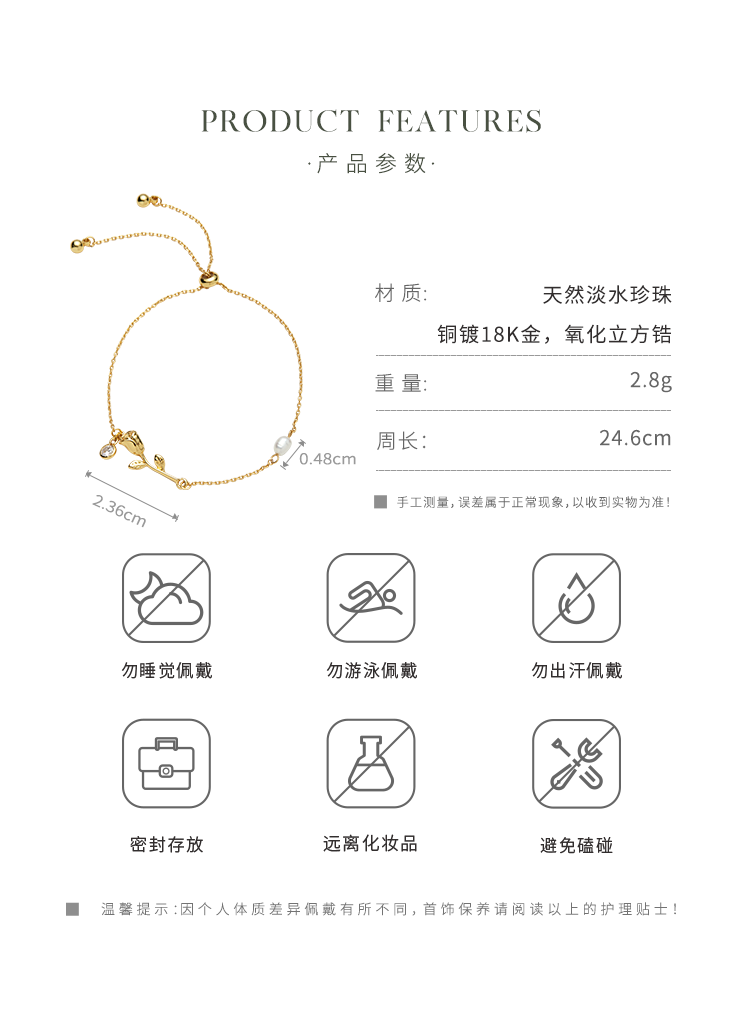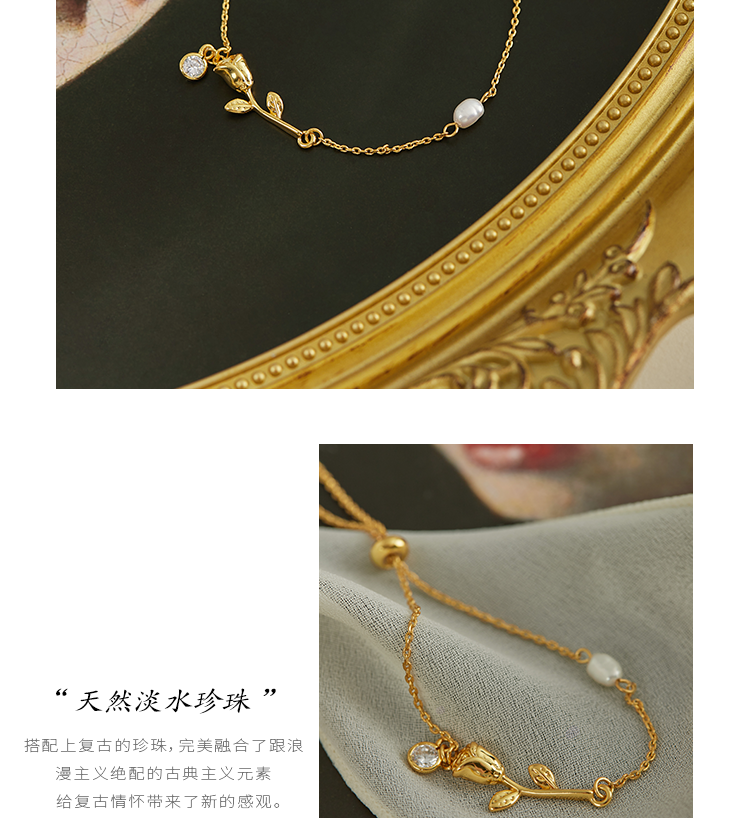 【包邮】Oflye潮流饰品 天然珍珠抽拉式手链女金属玫瑰吊坠锆石镶嵌气质饰品