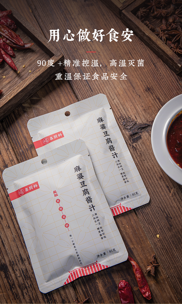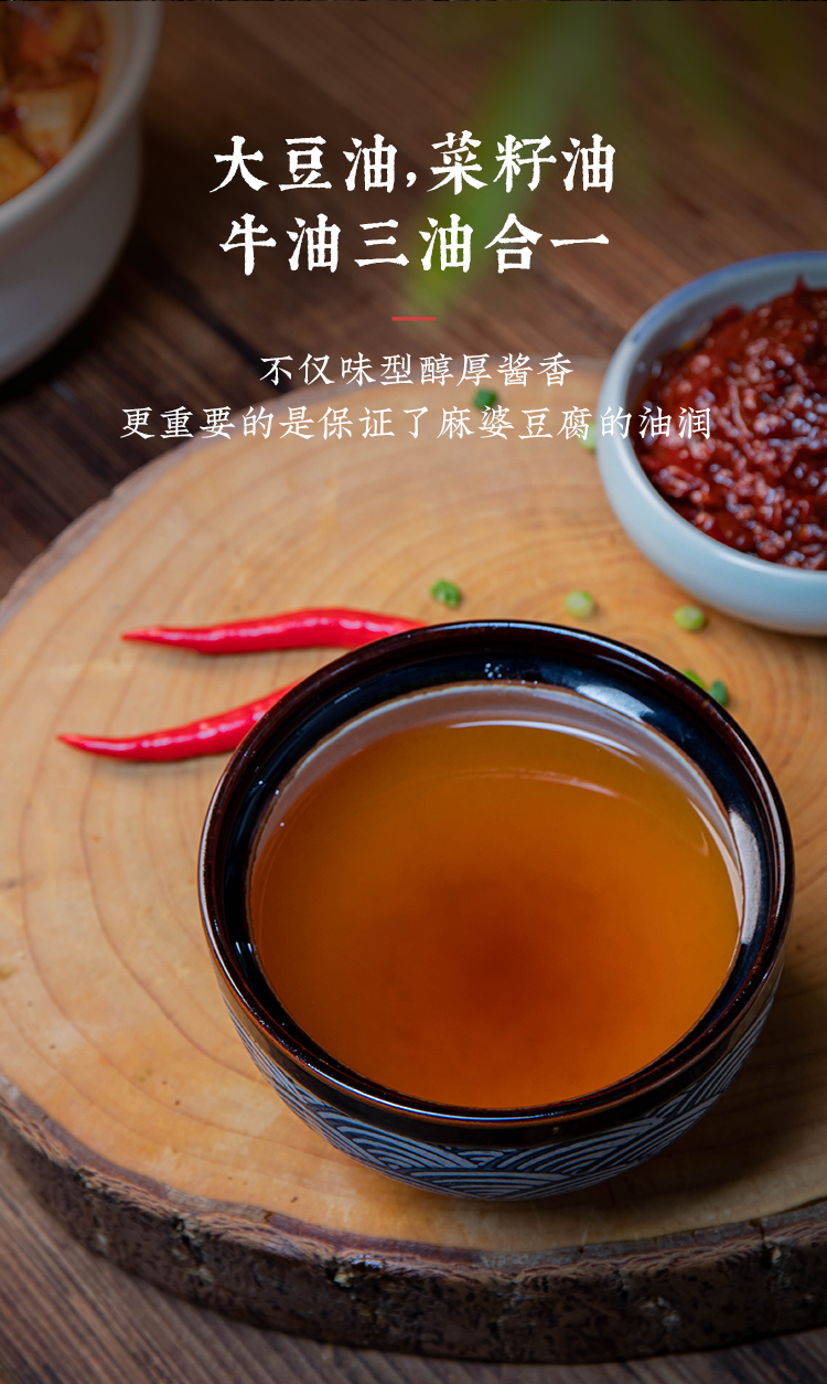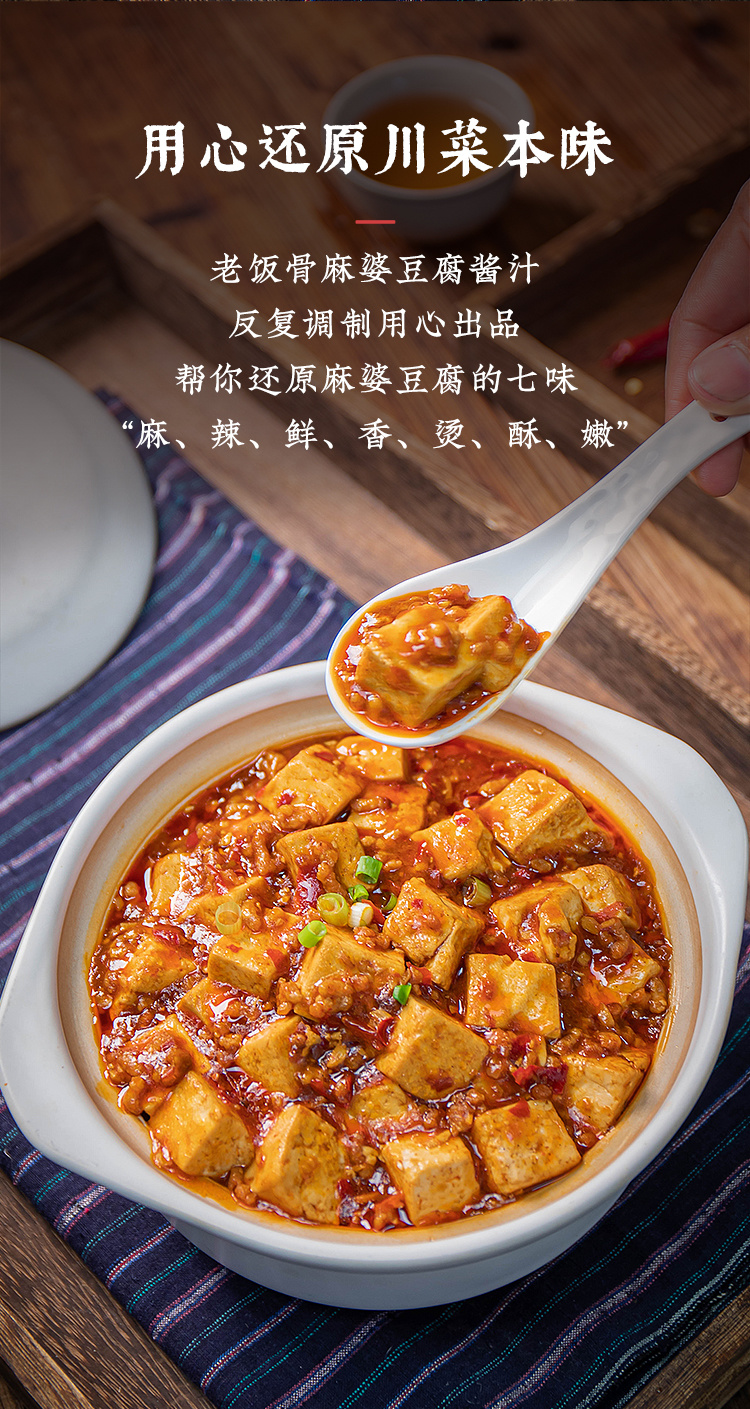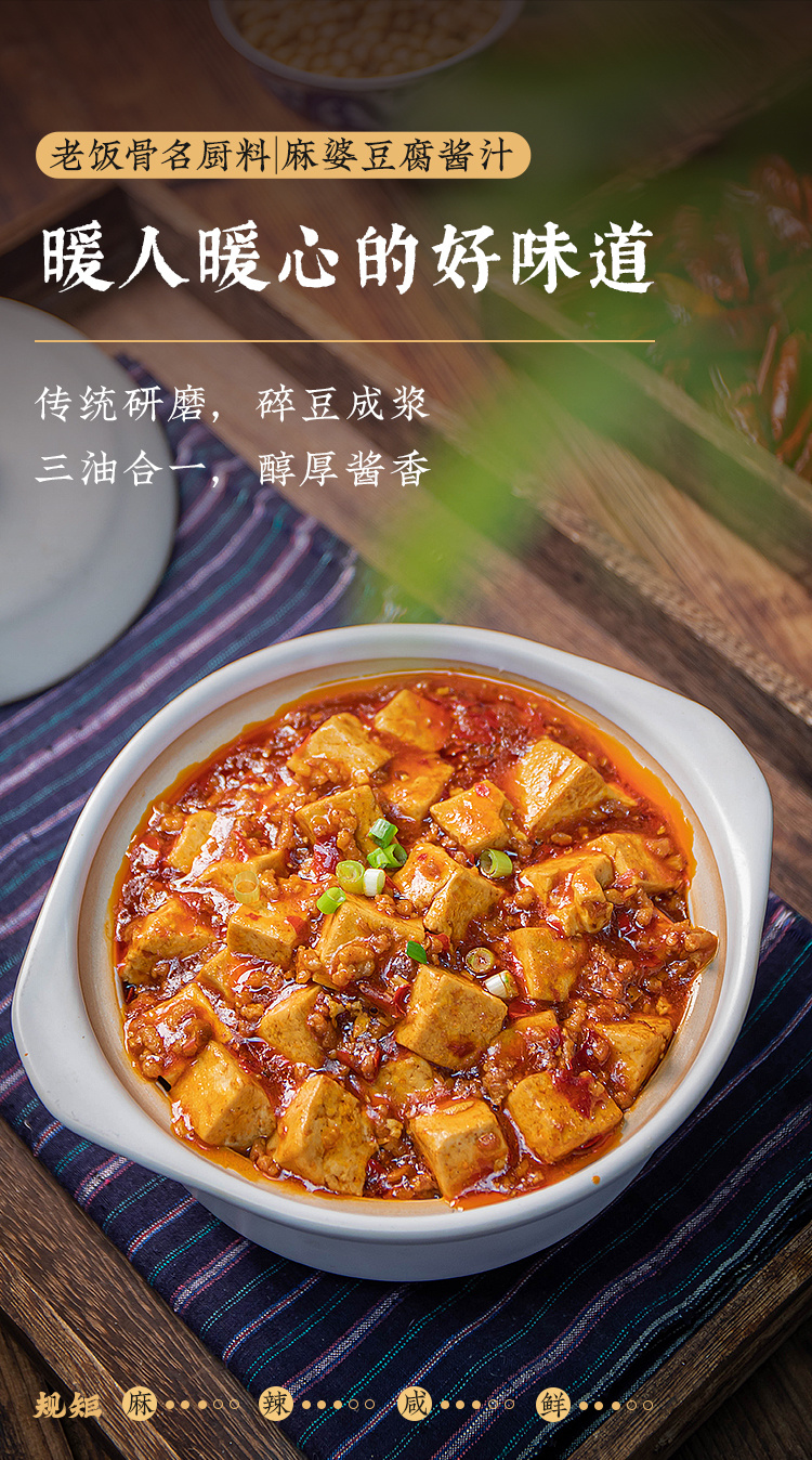 老饭骨通过反复试味调制,用心还原麻婆豆腐的麻、辣、鲜、香、烫、酥、嫩这七味。采用三成油温慢火煨制,恒温熬煮长达58分钟,随后通过90度高温精准控温,实现灭菌同时萃取极致酱香。而其核心灵魂在于精选郫县红油豆瓣,通过老饭骨们使用传统研磨工艺,深度研碎蚕豆成浆,熬制成酱,确保酱香浓郁且口感细腻,既保留了豆瓣酱的纯正风味,又让味道充分释放。