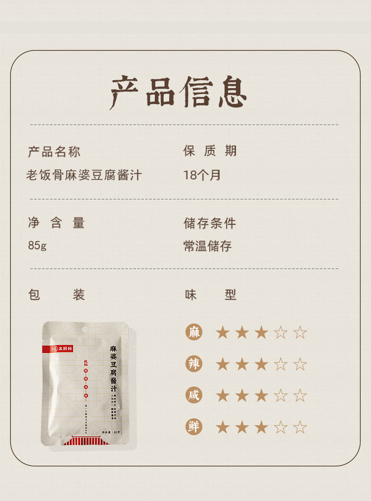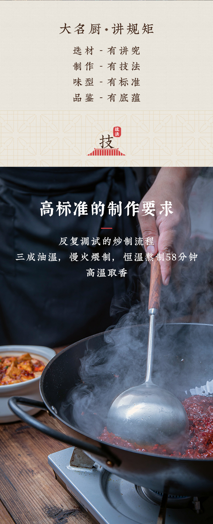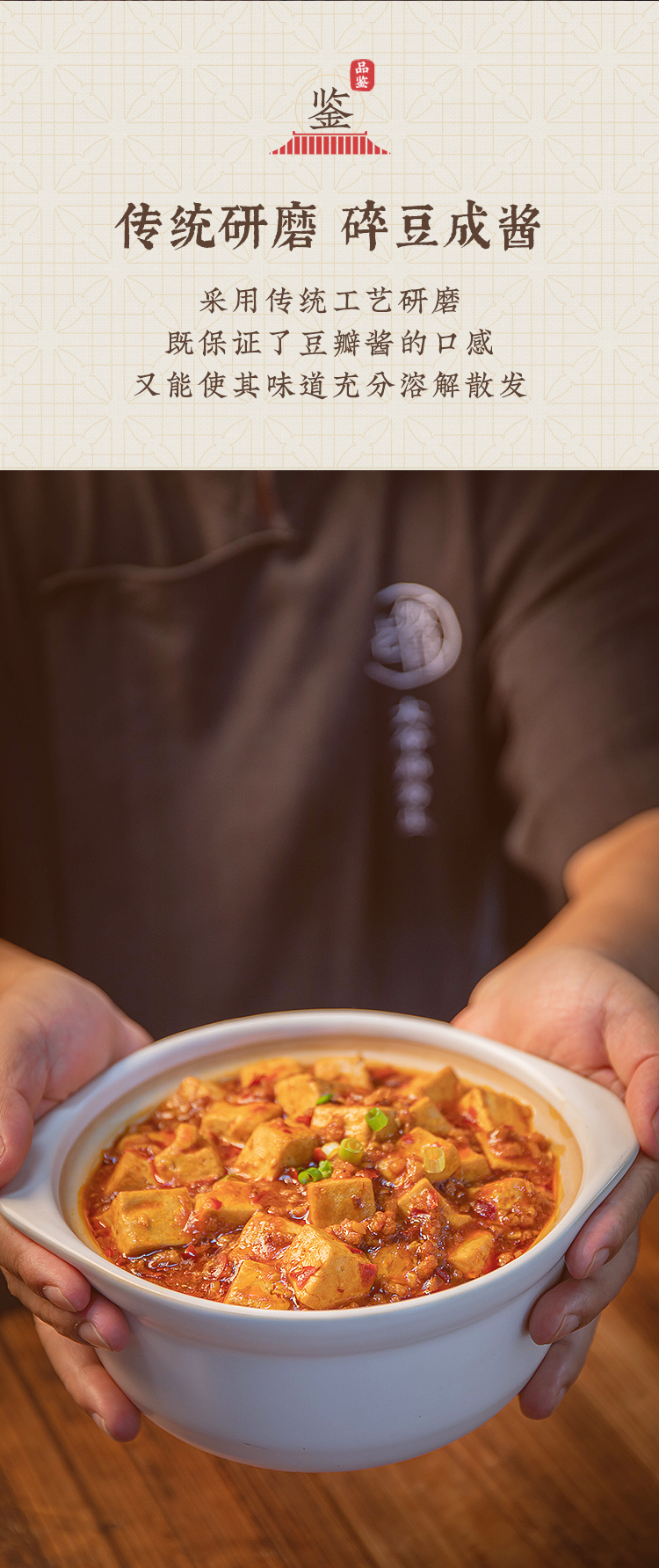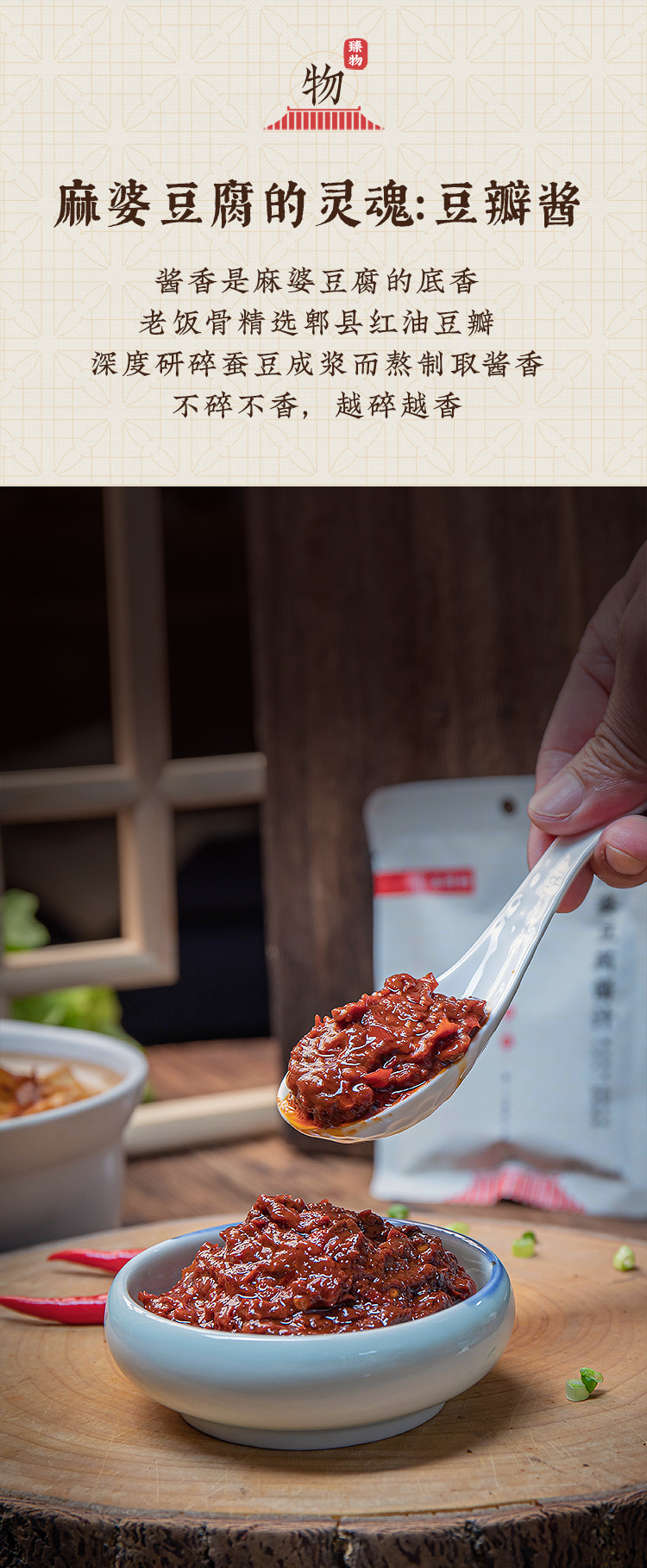 老饭骨通过反复试味调制,用心还原麻婆豆腐的麻、辣、鲜、香、烫、酥、嫩这七味。采用三成油温慢火煨制,恒温熬煮长达58分钟,随后通过90度高温精准控温,实现灭菌同时萃取极致酱香。而其核心灵魂在于精选郫县红油豆瓣,通过老饭骨们使用传统研磨工艺,深度研碎蚕豆成浆,熬制成酱,确保酱香浓郁且口感细腻,既保留了豆瓣酱的纯正风味,又让味道充分释放。