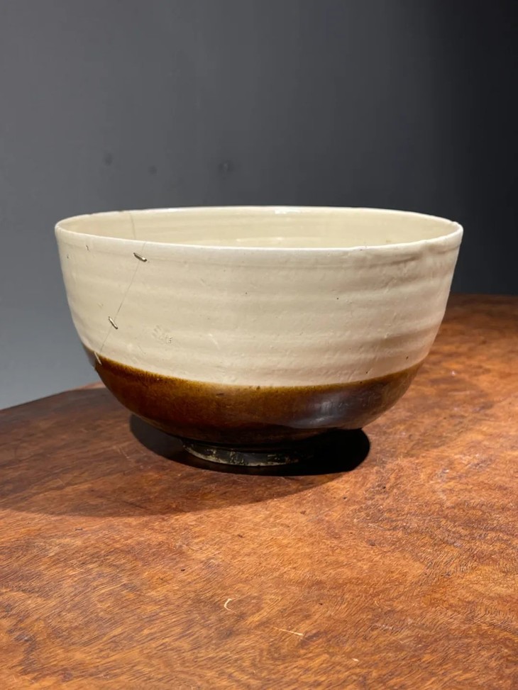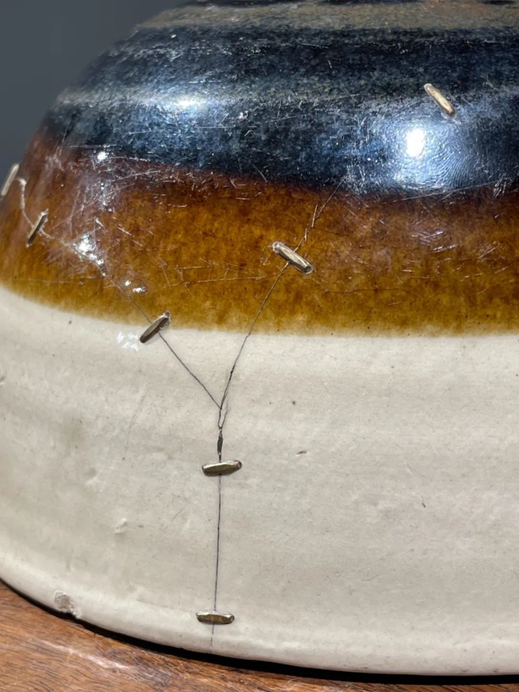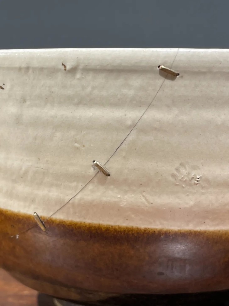此磁州窑白褐双色佛钵式大碗,磁州窑特有的白化妆土与褐黑釉双色构图简约大方,碗型型优雅端庄,简约朴实,流畅自然,下方圈足器底露淡灰胎,快刀修胚痕迹处处可见,细裂痕,以金属锔钉加固,曾添大钵优雅气质。依其胎、釉与造型之气质。