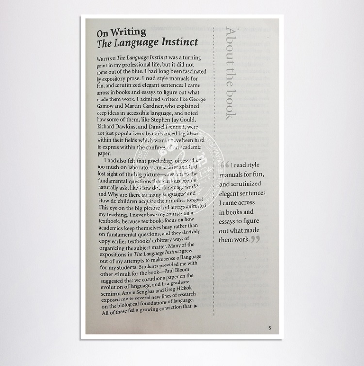 The Language Instinct《语言本能》是加拿大-美国实验心理学家、认知科学家和科普作家史蒂芬·平克(Steven Pinker)的成名之作,同时奠定了他在语言学界的地位。《语言本能》远远不止是一本语言学著作,平克从语言学的议题出发,矛头却直指心理机制的进化论解释。凭借此书,平克终于完成了从语言学家到进化心理学家的华丽转身。本书适合英语专业学生、以及对语言学、心理学及英语学习感兴趣的书迷朋友们细细品读。