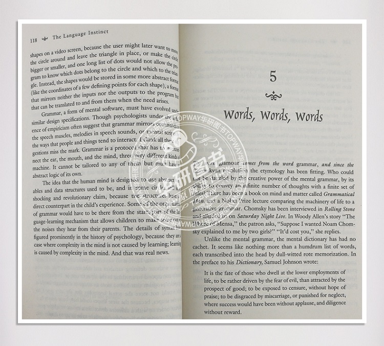 The Language Instinctis written by Steven Pinker for a general audience. Pinker argues that humans are born with an innate capacity for language. He deals sympathetically with Noam Chomsky's claim that all human language shows evidence of a universal grammar, but dissents from Chomsky's skepticism that evolutionary theory can explain the human language instinct. 媒体推荐: “Absorbing. He makes a persuasive, entertaining case for his thesis.” ---Time “A remarkably engaging book.” ---Scientific American “Pinker writes with acid verve.” ---Atlantic Monthly “A remarkably engaging book. The book is packed tight with observations, experimental results, insight and forceful arguments based on what we all know of language but never analyze. This reader finds Professor Pinker’s genuinely instructive volume funny as well, a delightful member of that rare genre headed by that classicLife on the Mississippi.” ---Scientific American