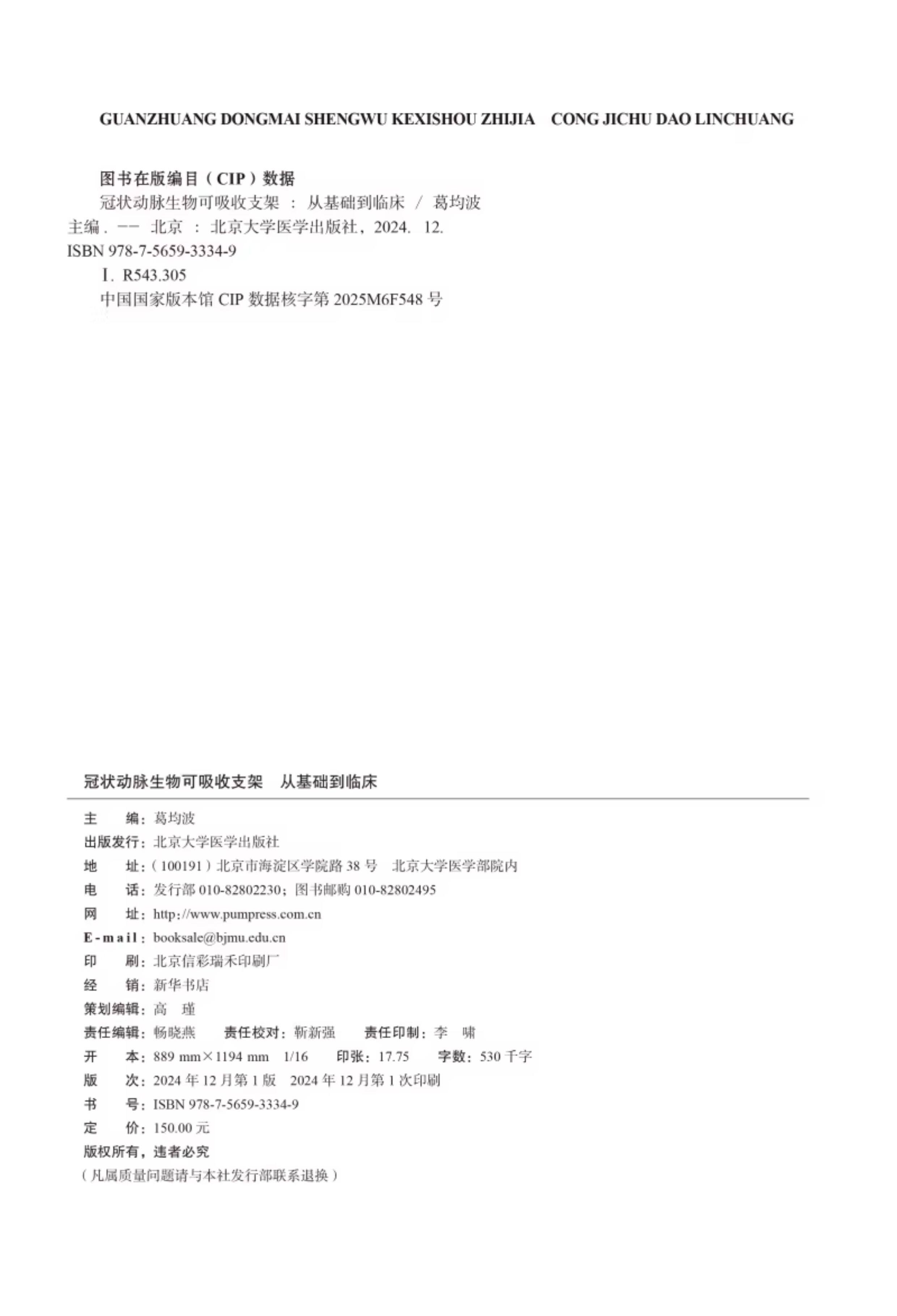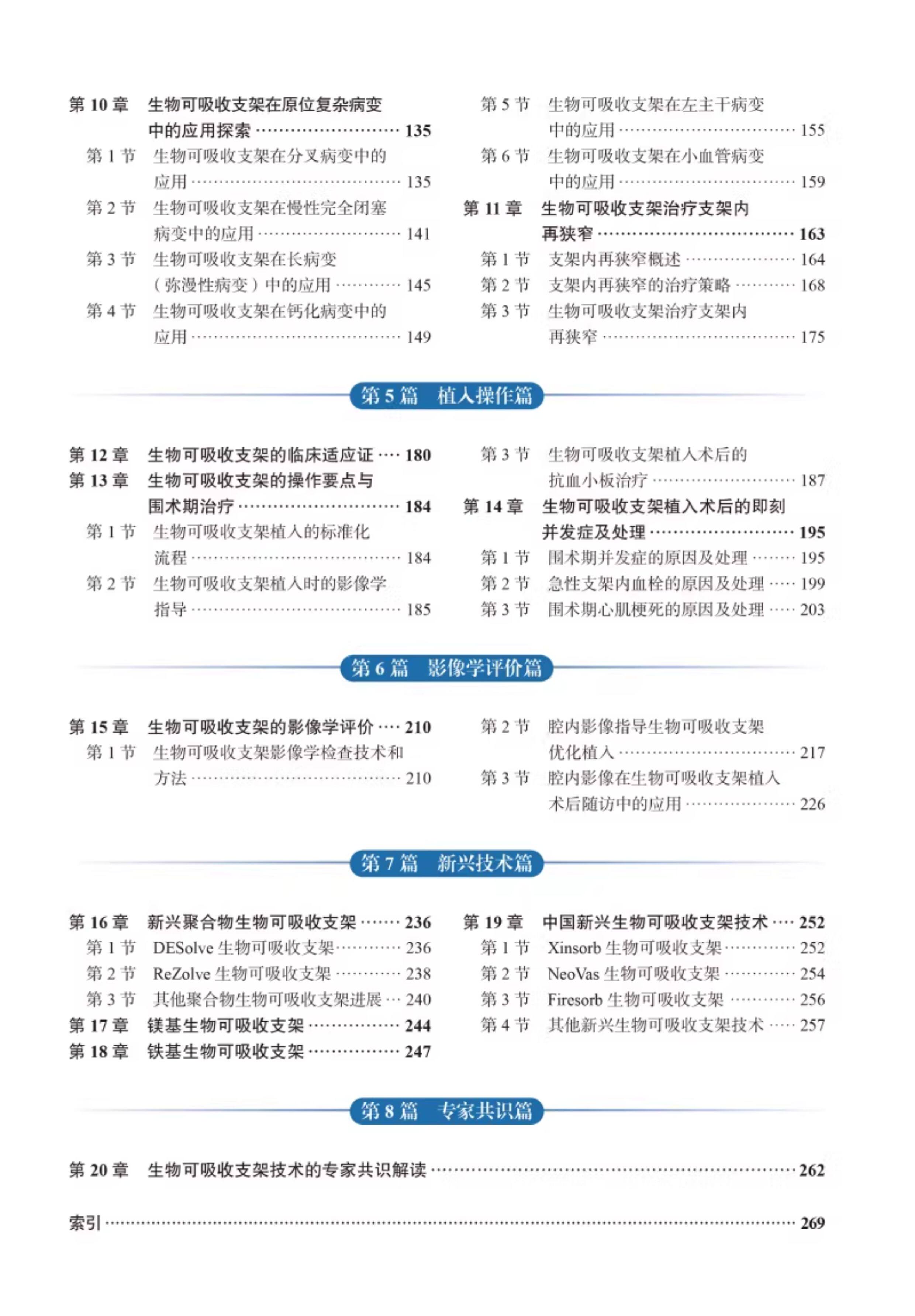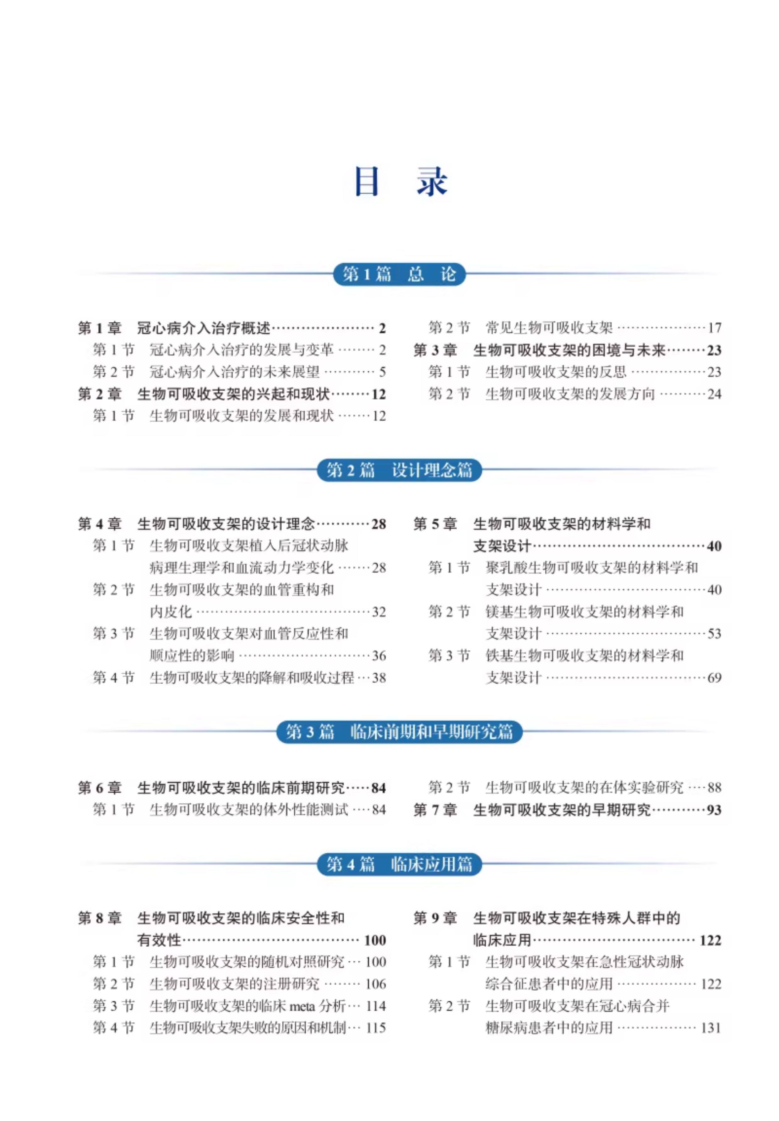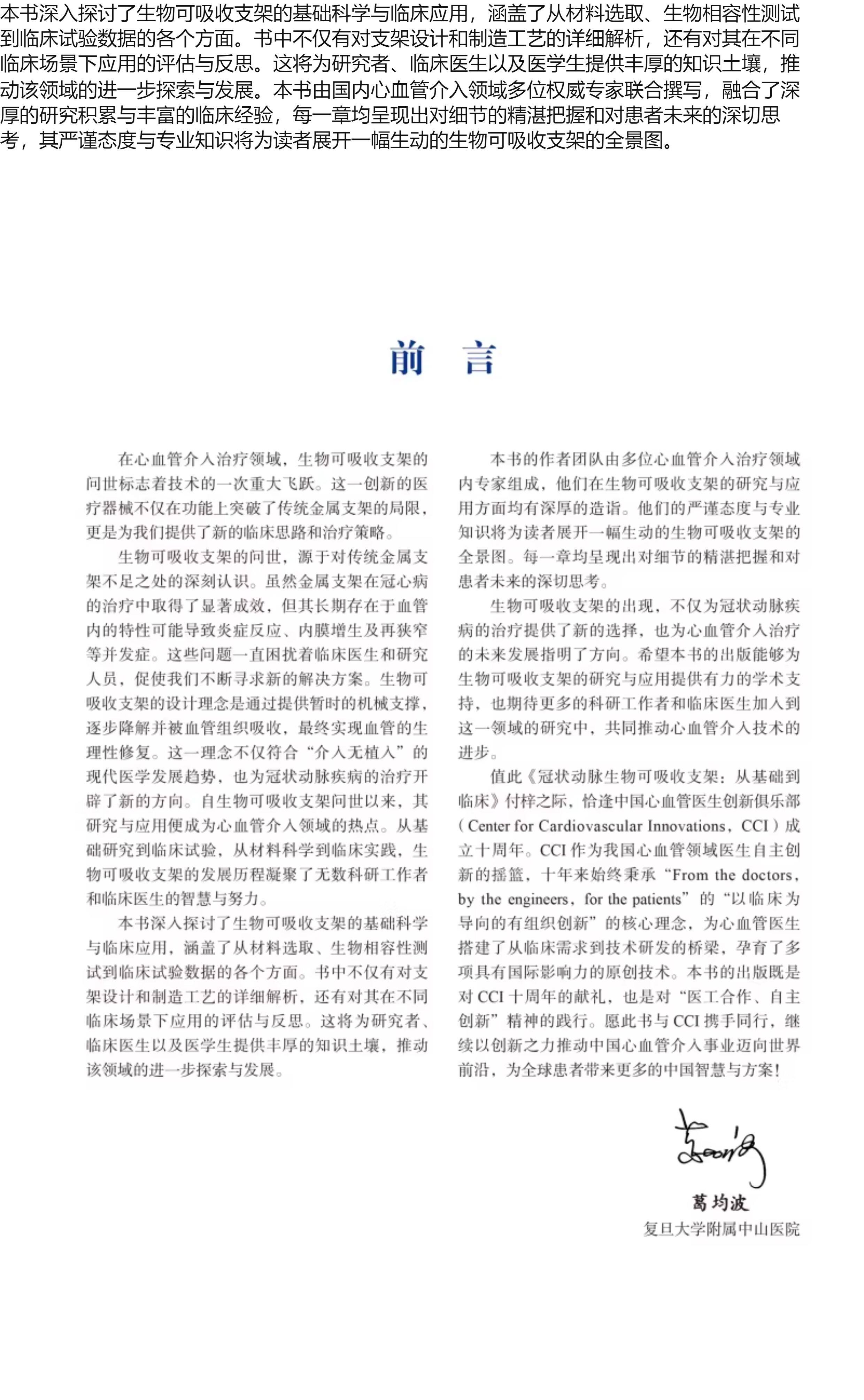 本书深入探讨了生物可吸收支架的基础科学与临床应用,涵盖了从材料选取、生物相容性测试到临床试验数据的各个方面。书中不仅有对支架设计和制造工艺的详细解析,还有对其在不同临床场景下应用的评估与反思。这将为研究者、临床医生以及医学生提供丰厚的知识土壤,推动该领域的进一步探索与发展。本书由国内心血管介入领域多位权威专家联合撰写,融合了深厚的研究积累与丰富的临床经验,每一章均呈现出对细节的精湛把握和对患者未来的深切思考,其严谨态度与专业知识将为读者展开一幅生动的生物可吸收支架的全景图。