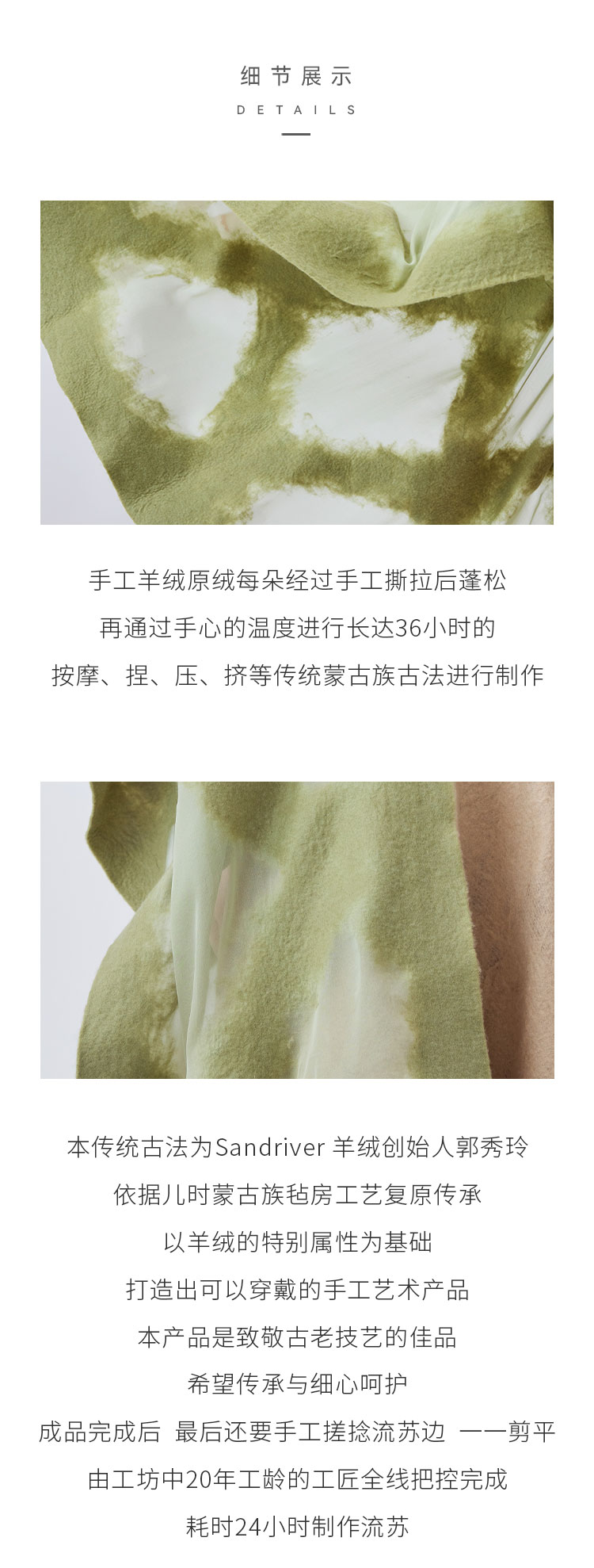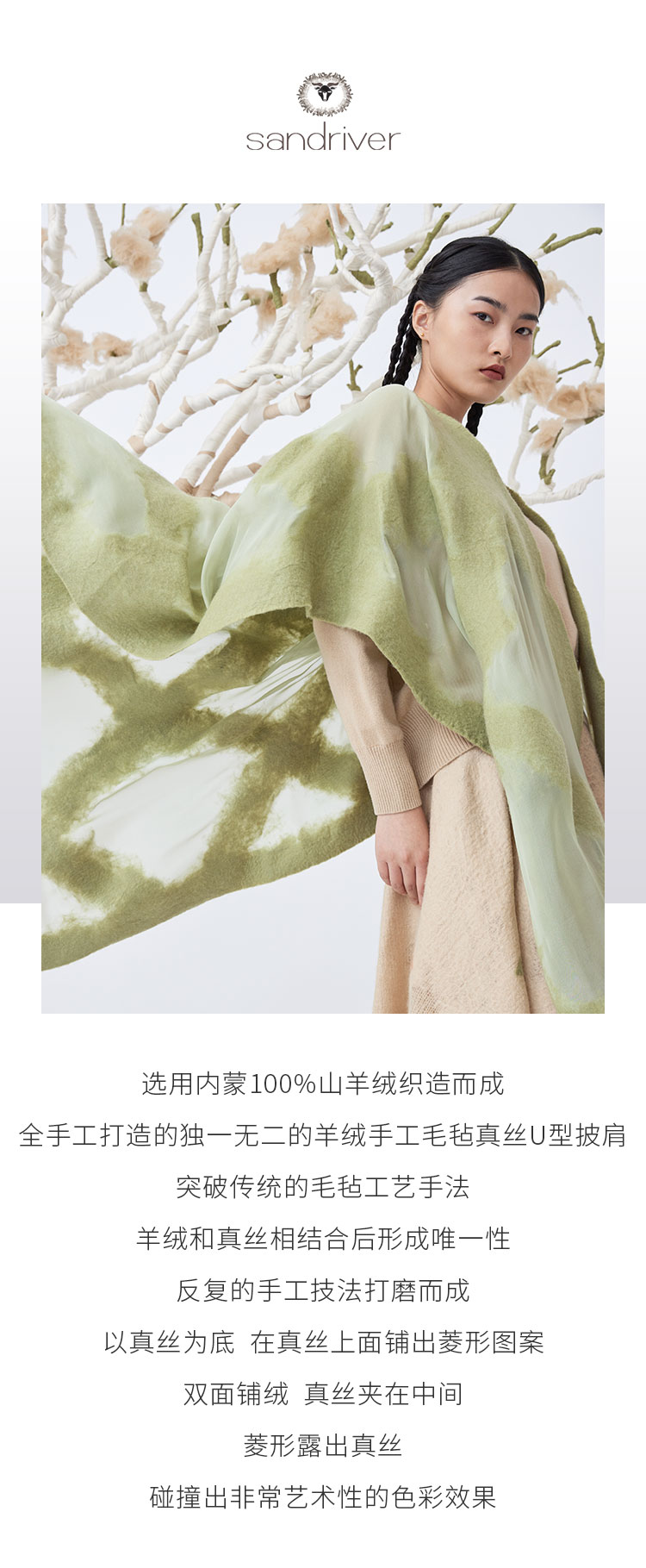 历年在巴黎时装周亮相,享誉世界的艺术羊绒品牌[Sandriver 沙涓]由羊绒布道者郭秀玲女士创立。阿拉善自有牧场纯种羔羊绒,日本国宝设计师小筱顺子,上海自有基地精工细作。承载羊绒情怀,坚持匠人品质。