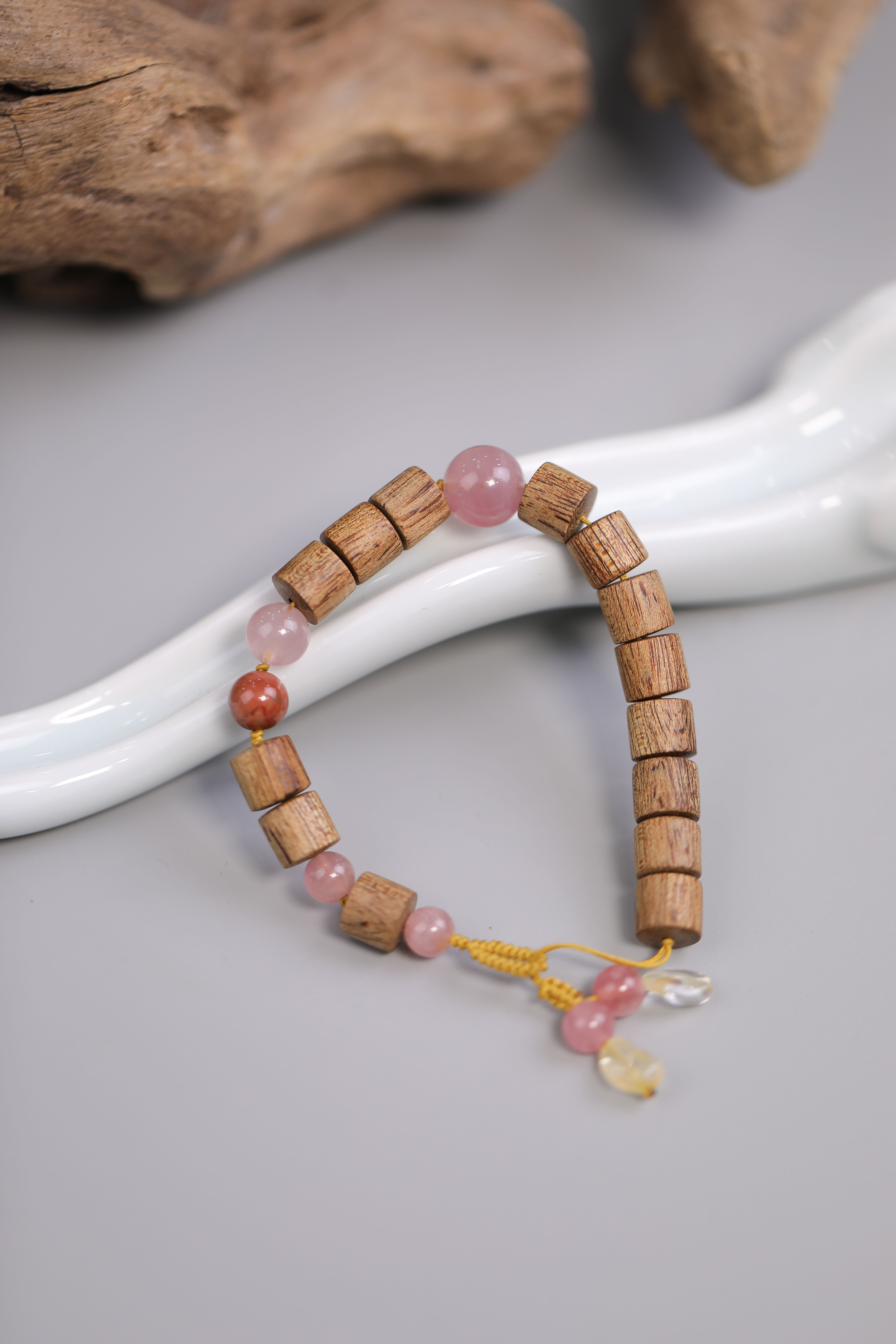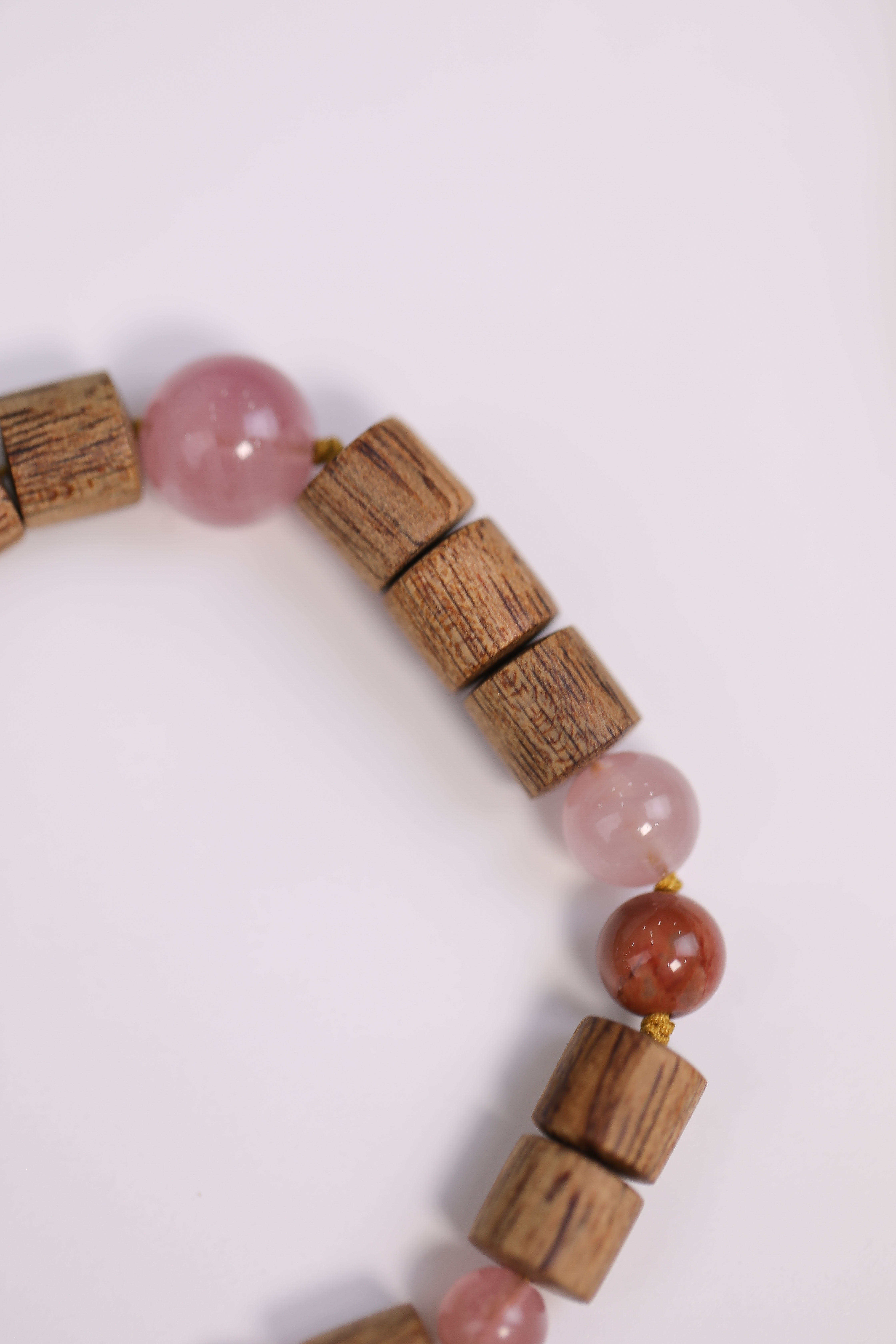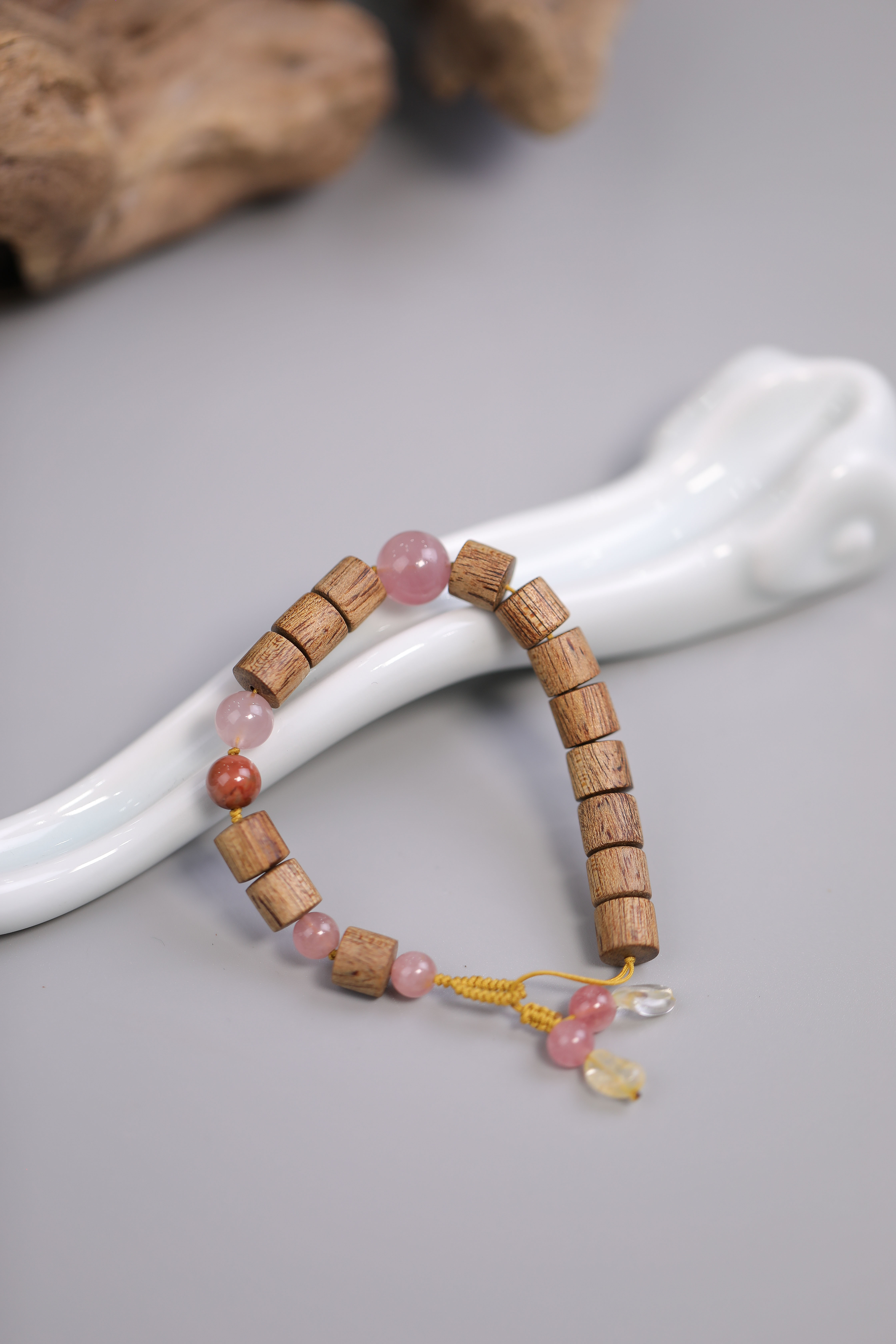 以柬埔寨沉香桶珠为核心,搭配6颗粉水晶,其中一颗最大,如同点睛之笔,散发柔和的光泽。