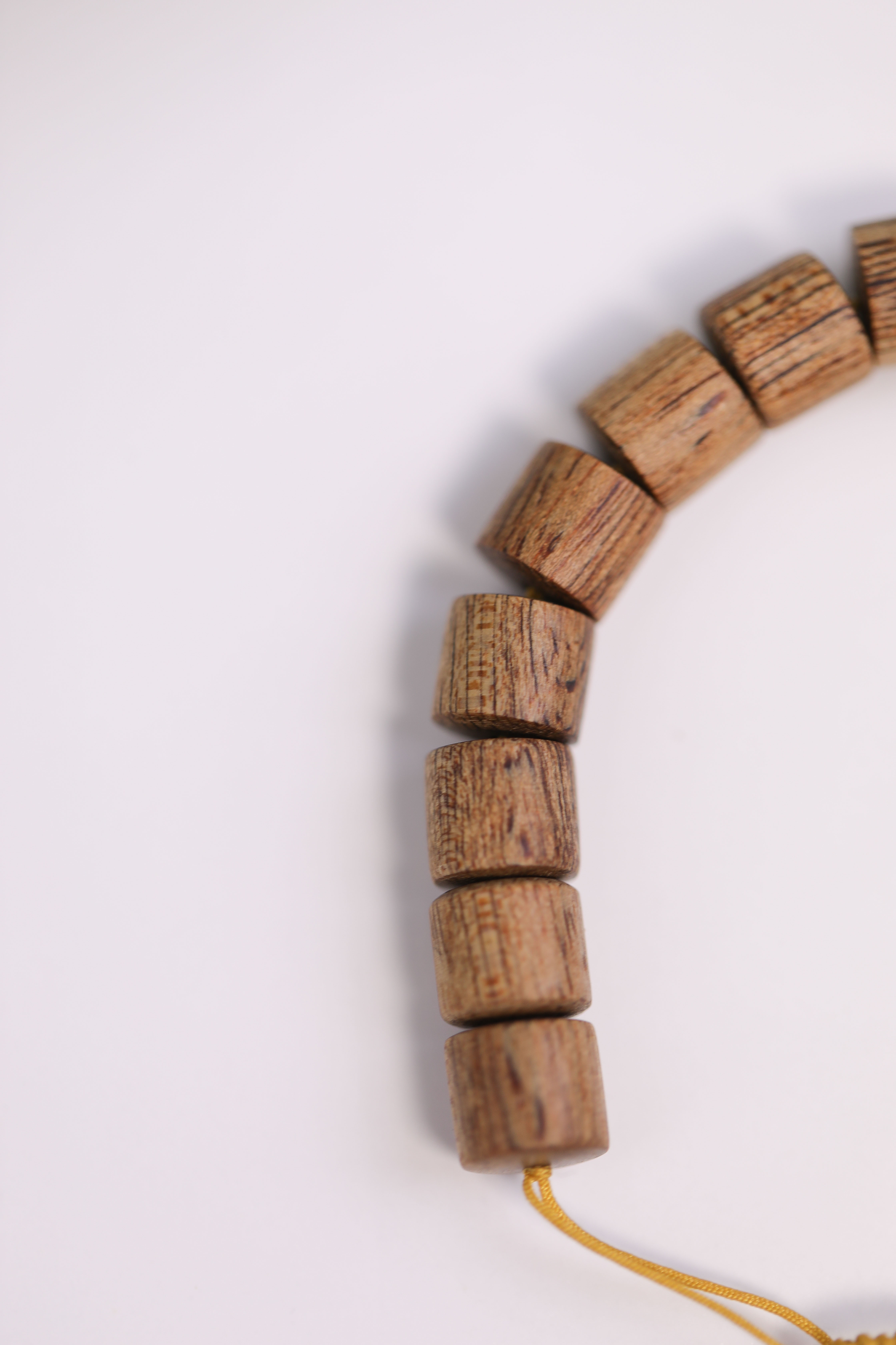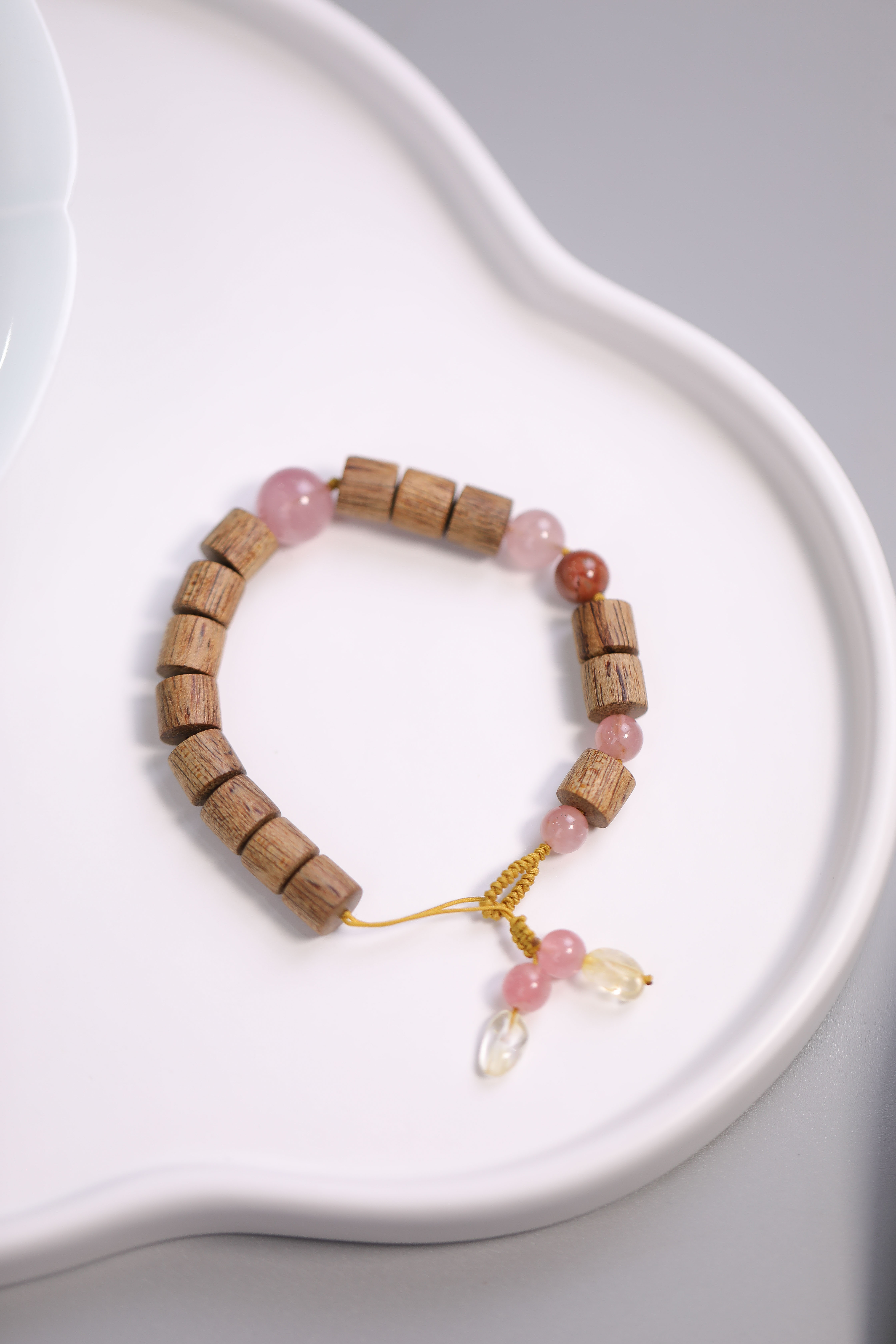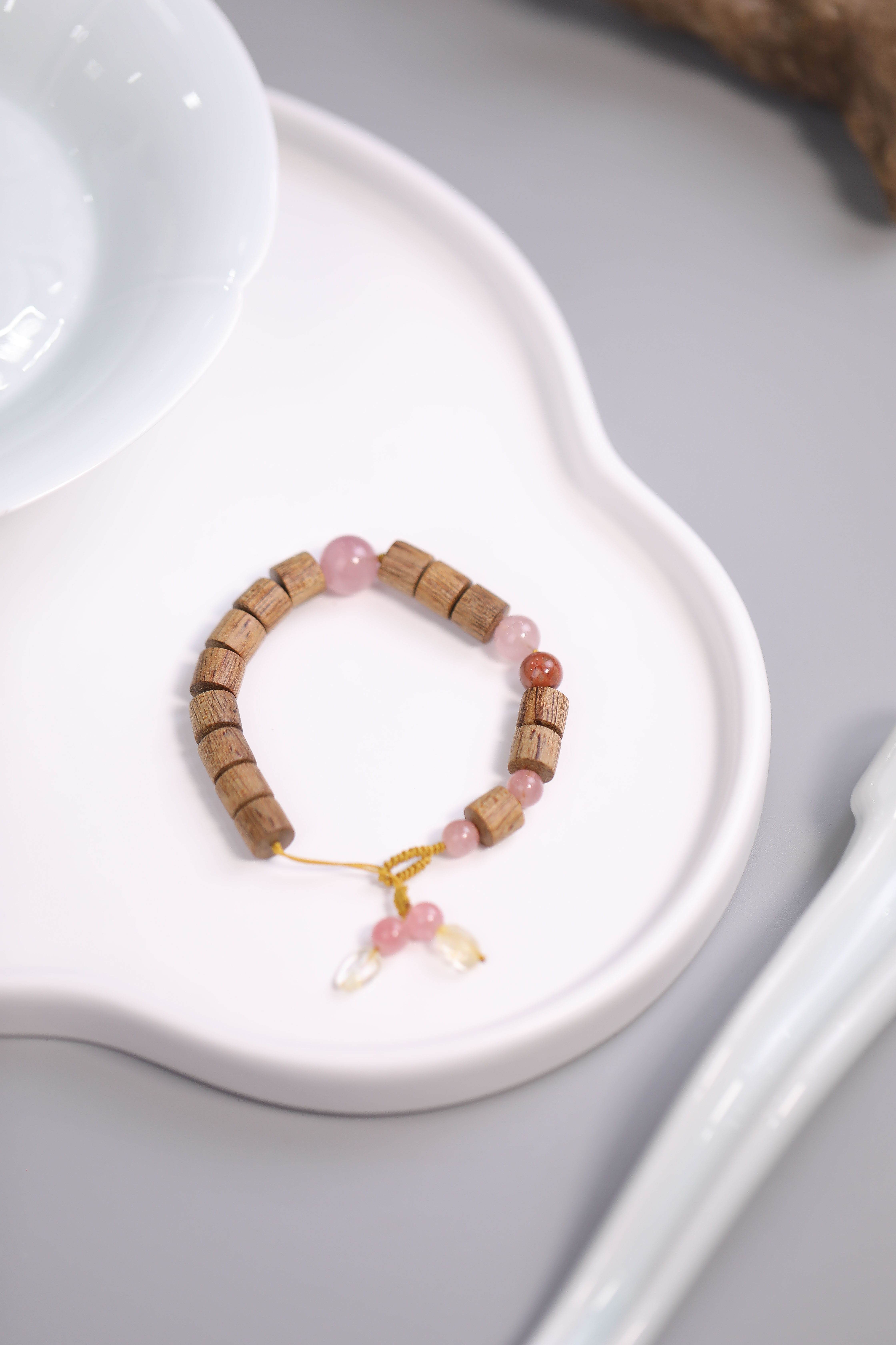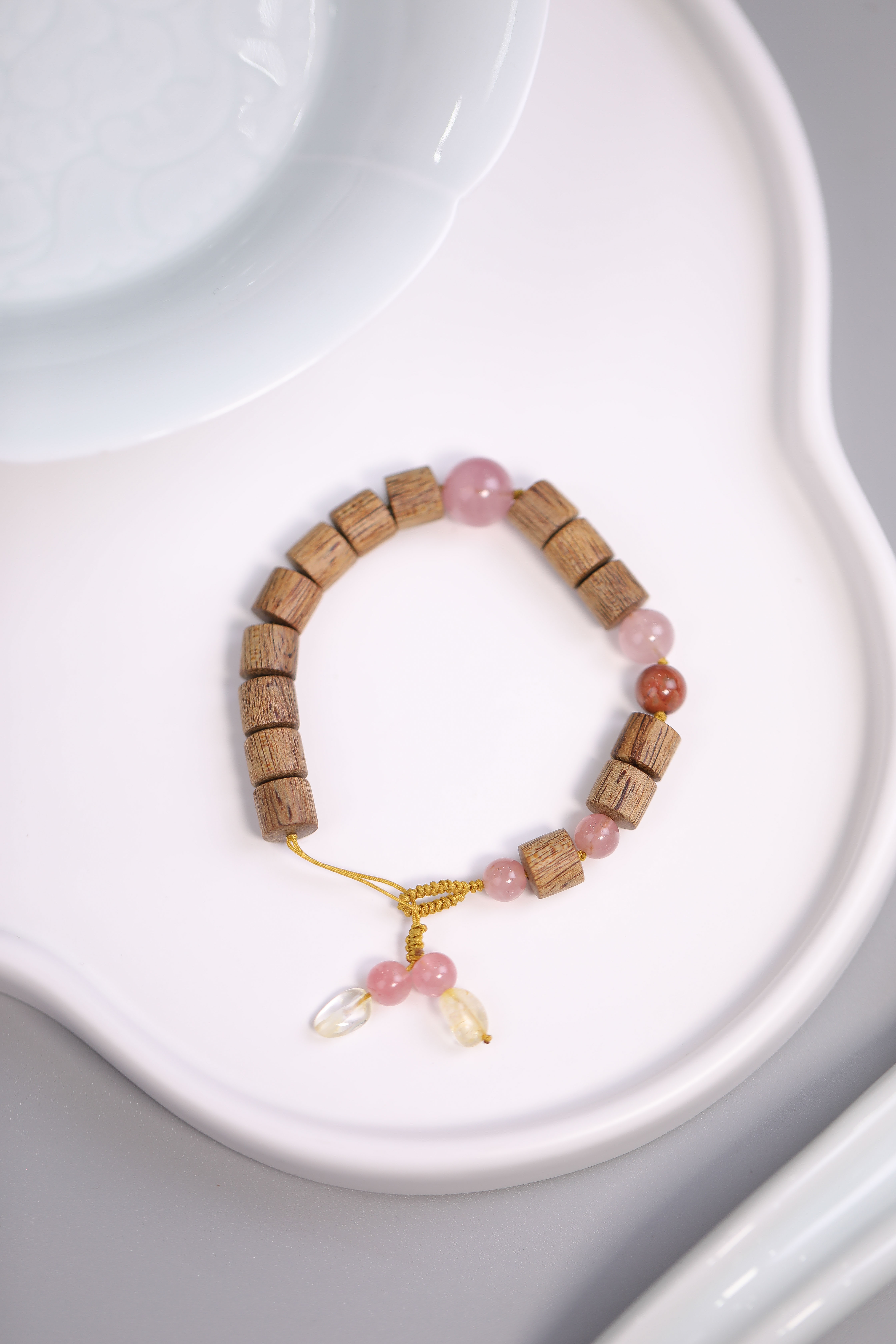 以柬埔寨沉香桶珠为核心,搭配6颗粉水晶,其中一颗最大,如同点睛之笔,散发柔和的光泽。