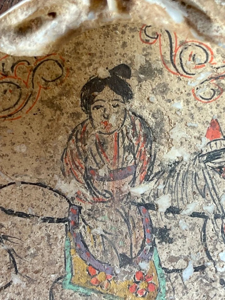 此天然贝壳彩绘仕女图盖盒选材独特、制作严谨,彩绘古意盎然,时代痕迹清晰可见,是一件原汁原味的文人赏玩精品,保留至今,除了彩绘细微剥落以及贝壳表面磨损痕迹外,基本保存完好。