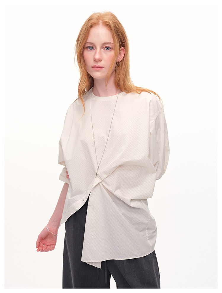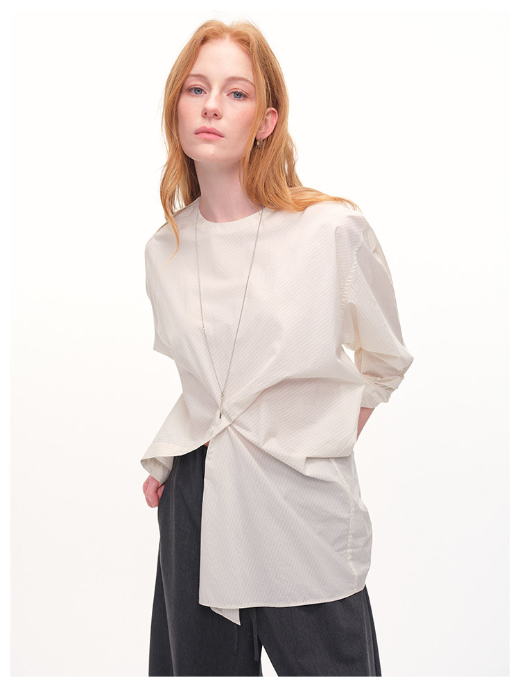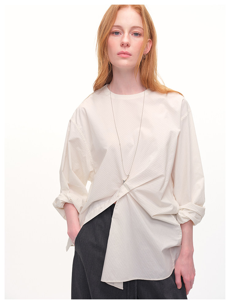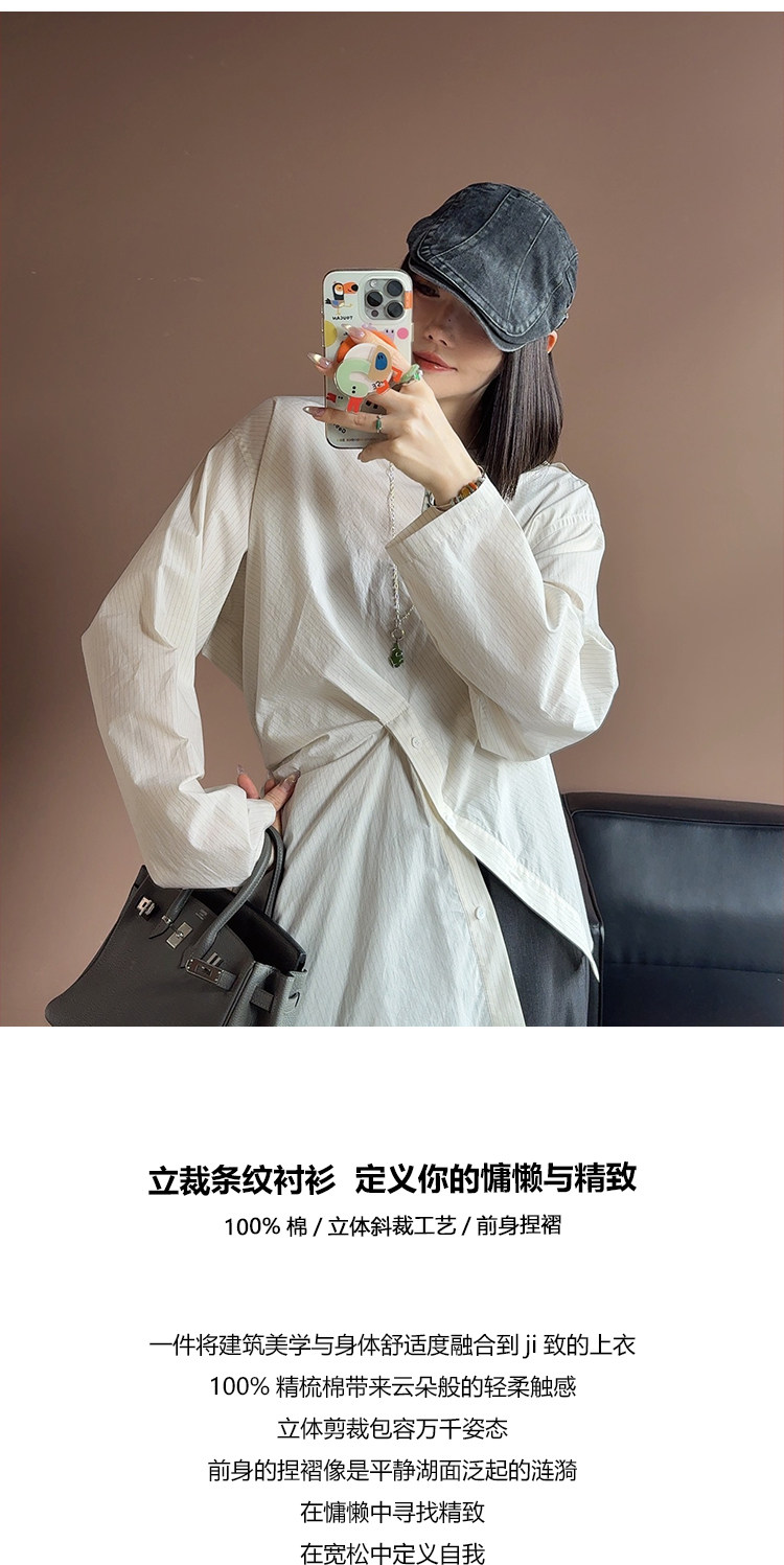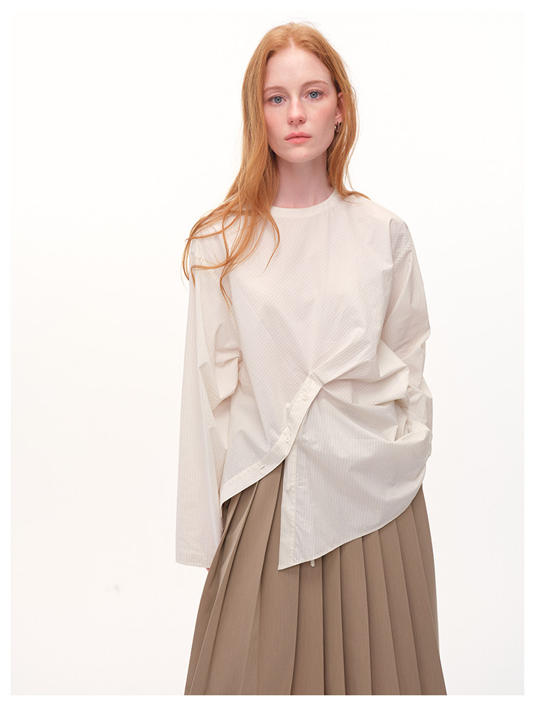 UMILAB|错位时空*原创异形立体斜裁 100%精梳棉捏褶圆领条纹衬衫H1330V
