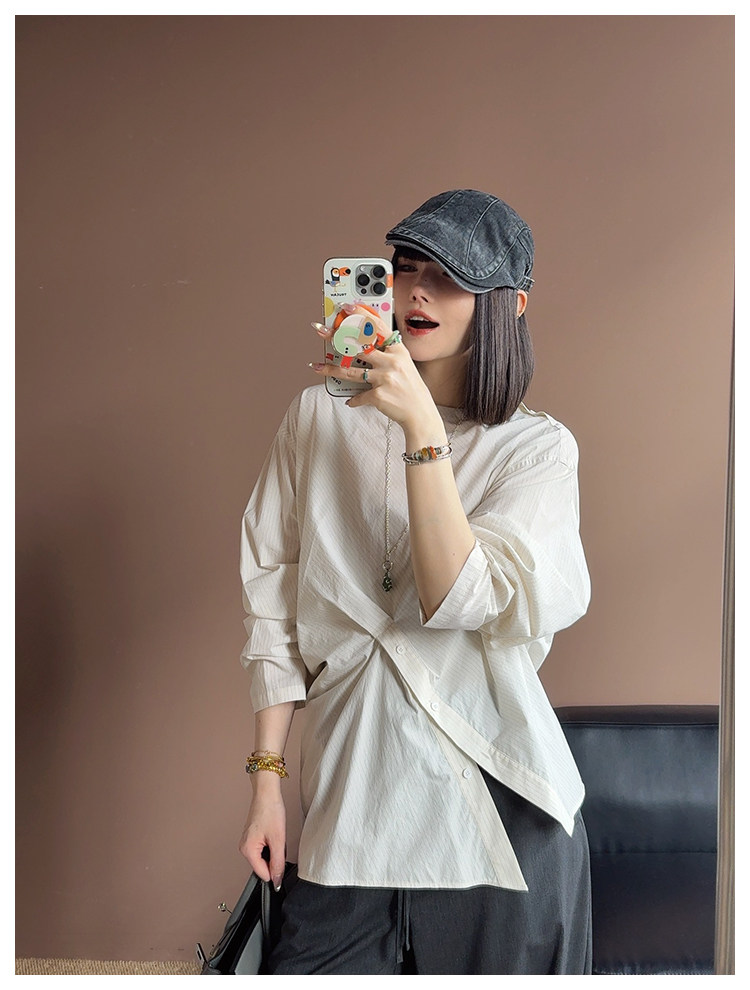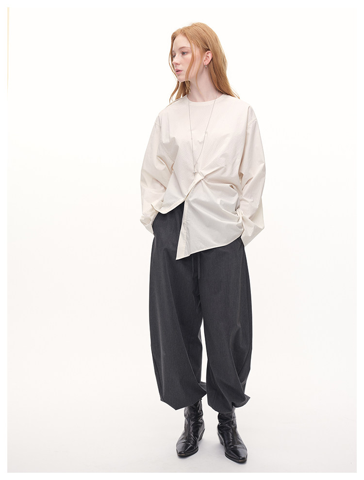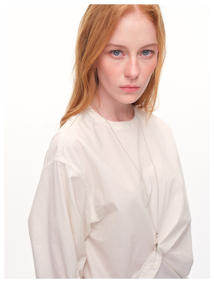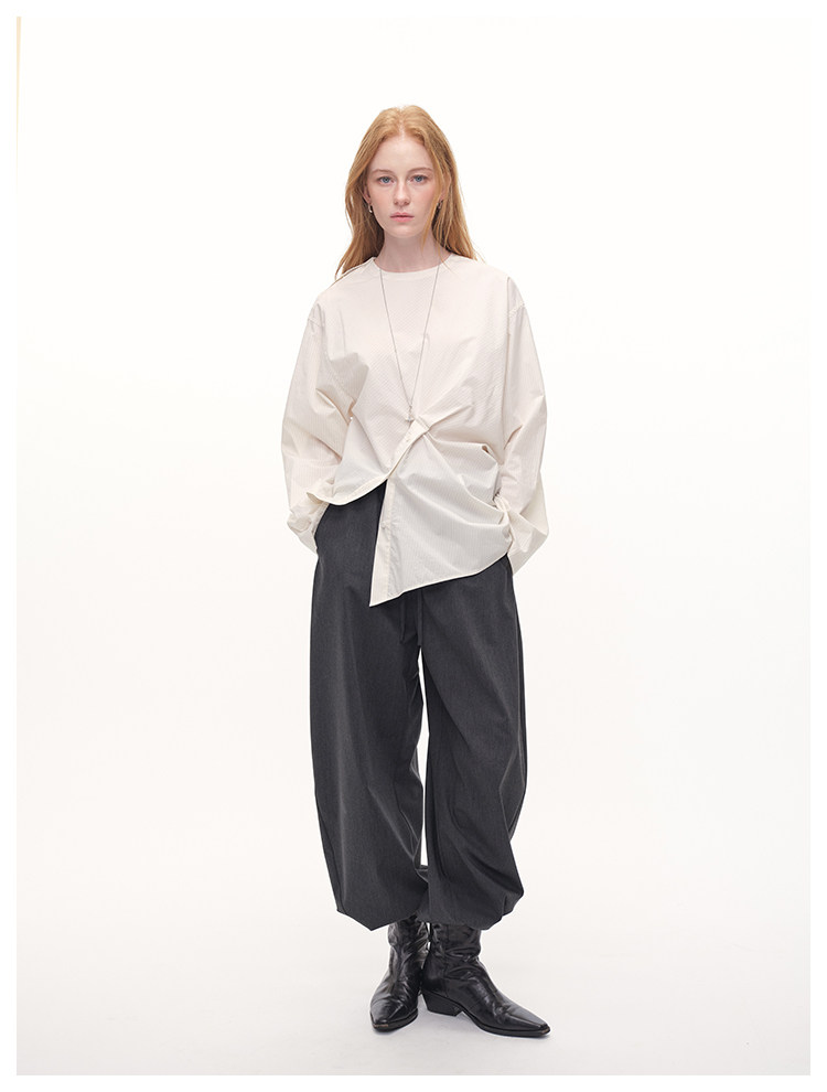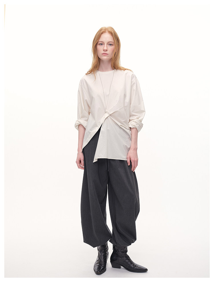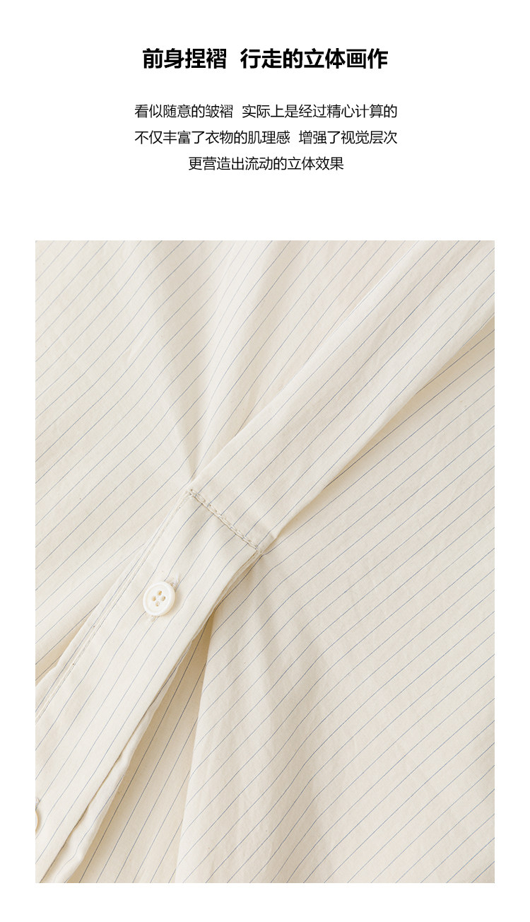 UMILAB|错位时空*原创异形立体斜裁 100%精梳棉捏褶圆领条纹衬衫H1330V