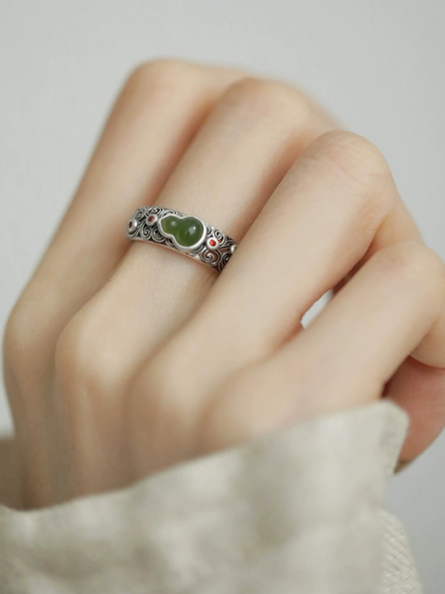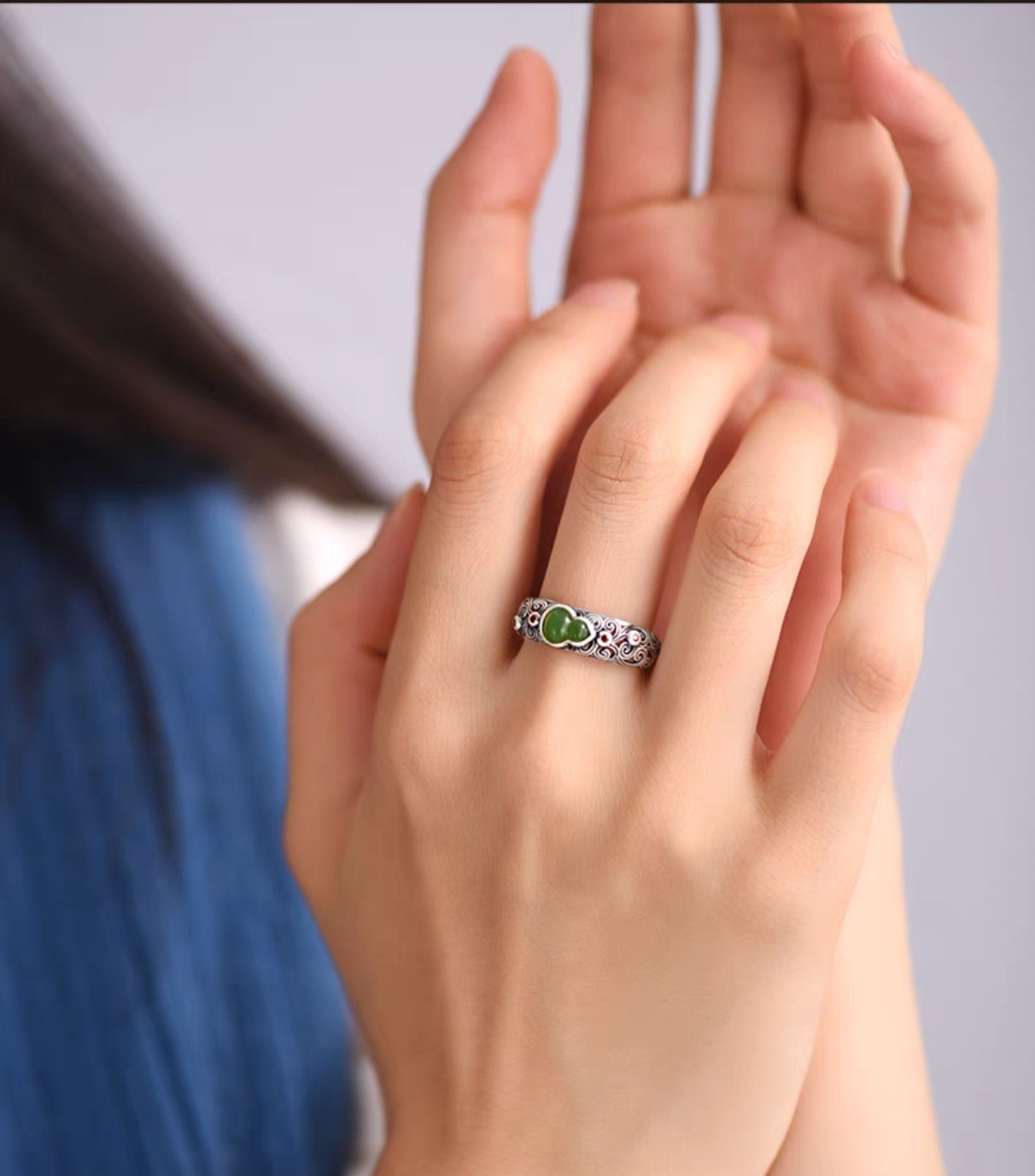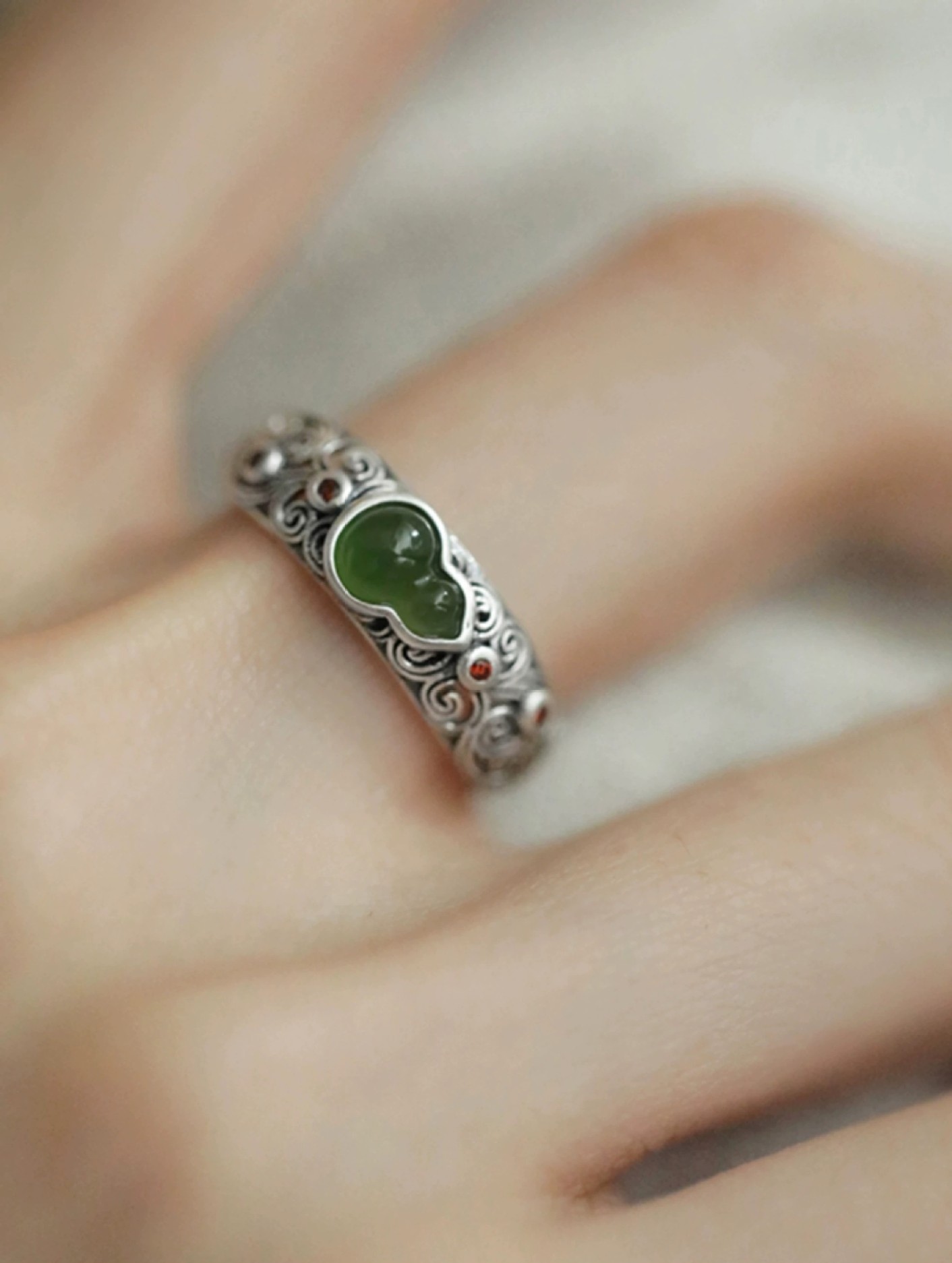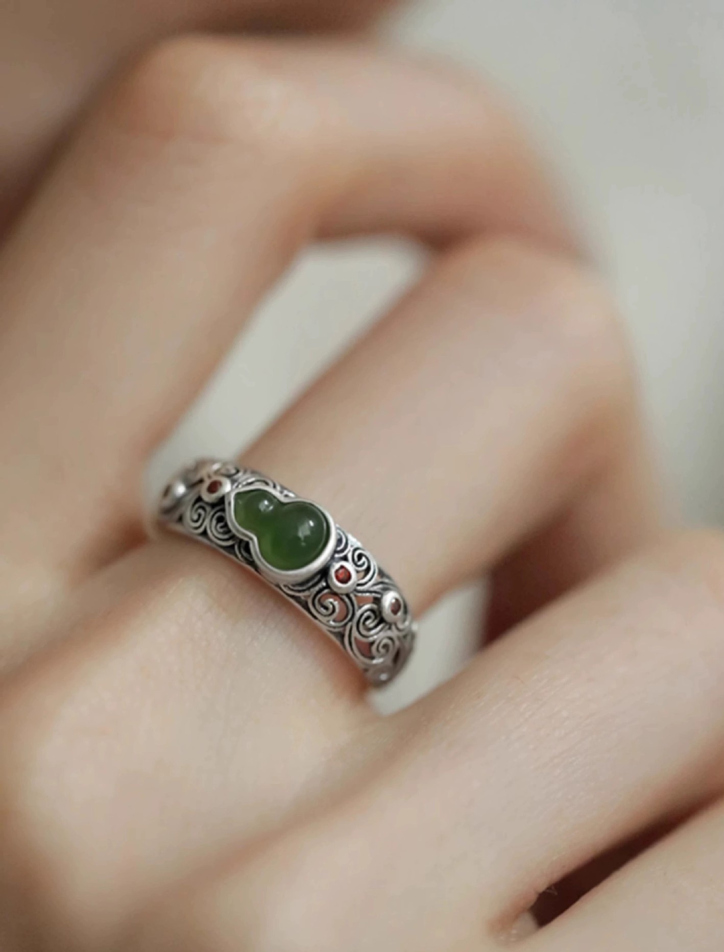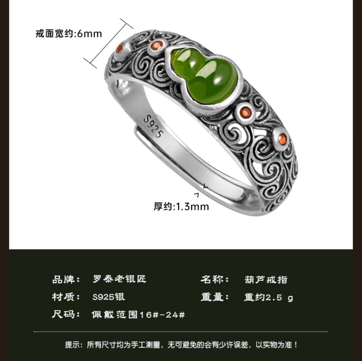 设计师手工制作镂空祥云平安葫芦戒指,葫芦是和田玉石,通体925银,镶嵌了红锆石,国风设计,平安葫芦寓意好。