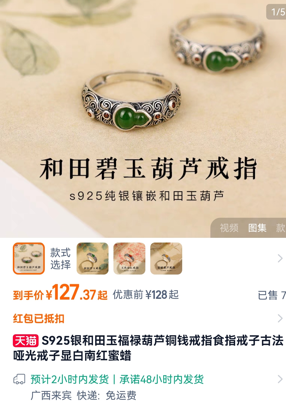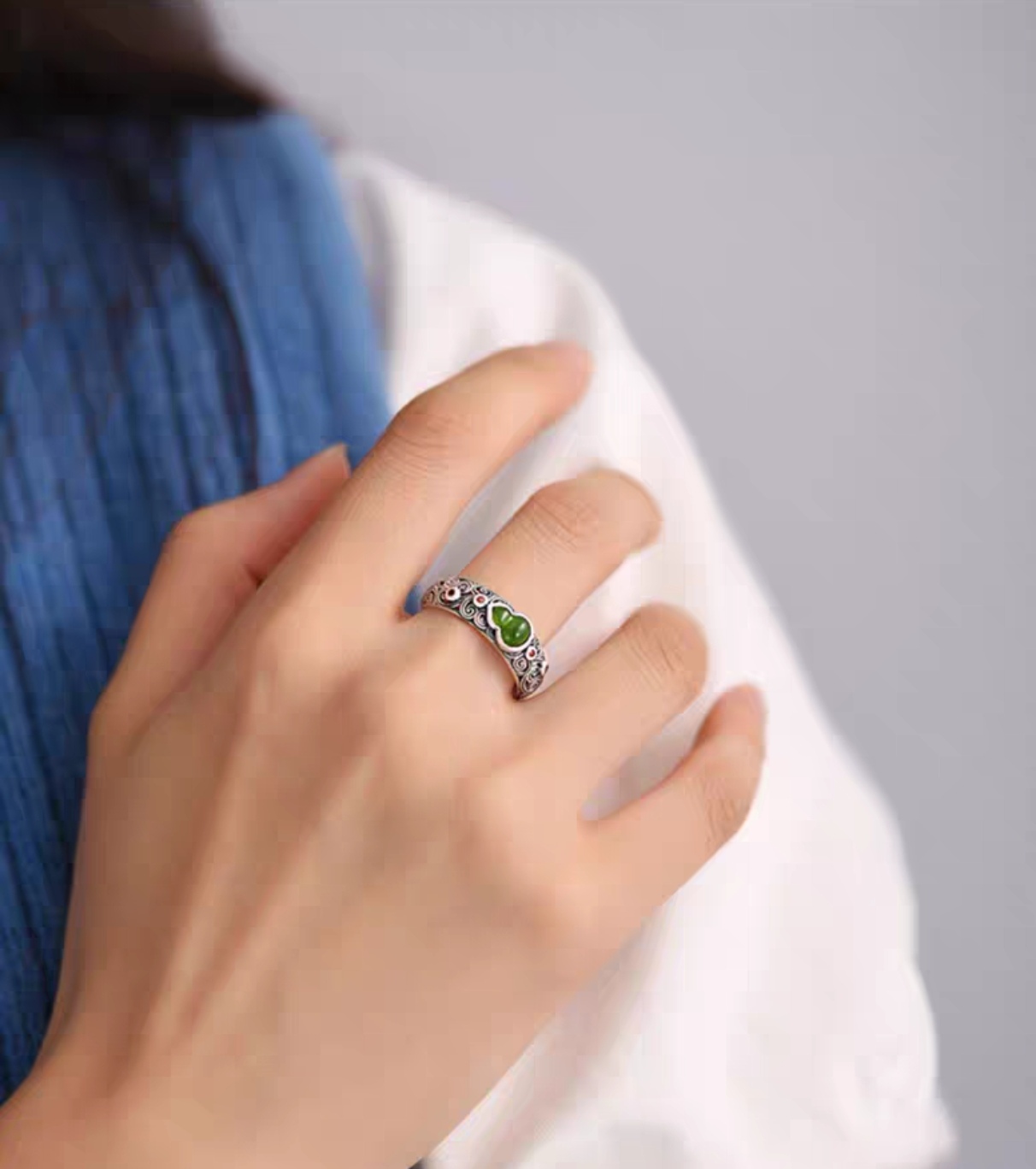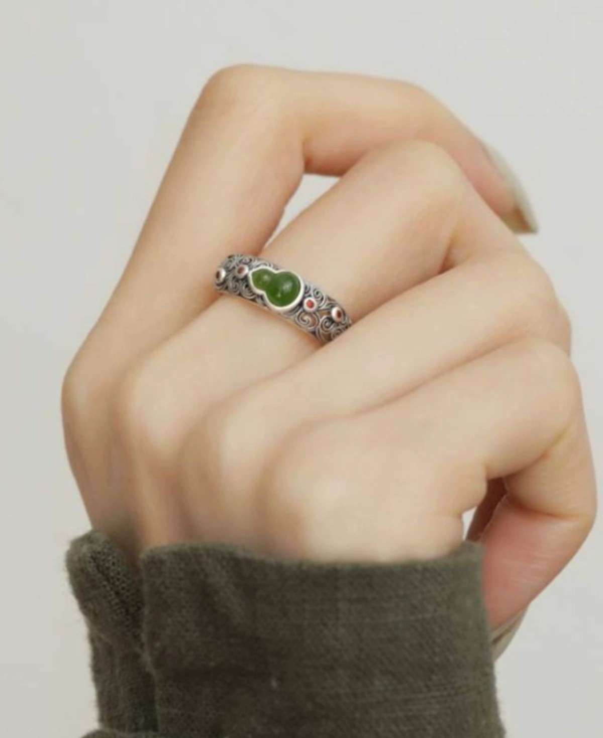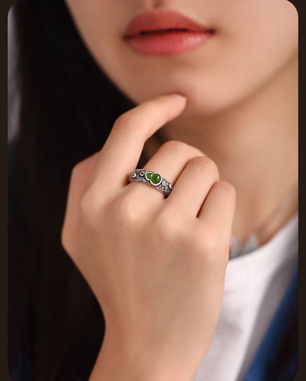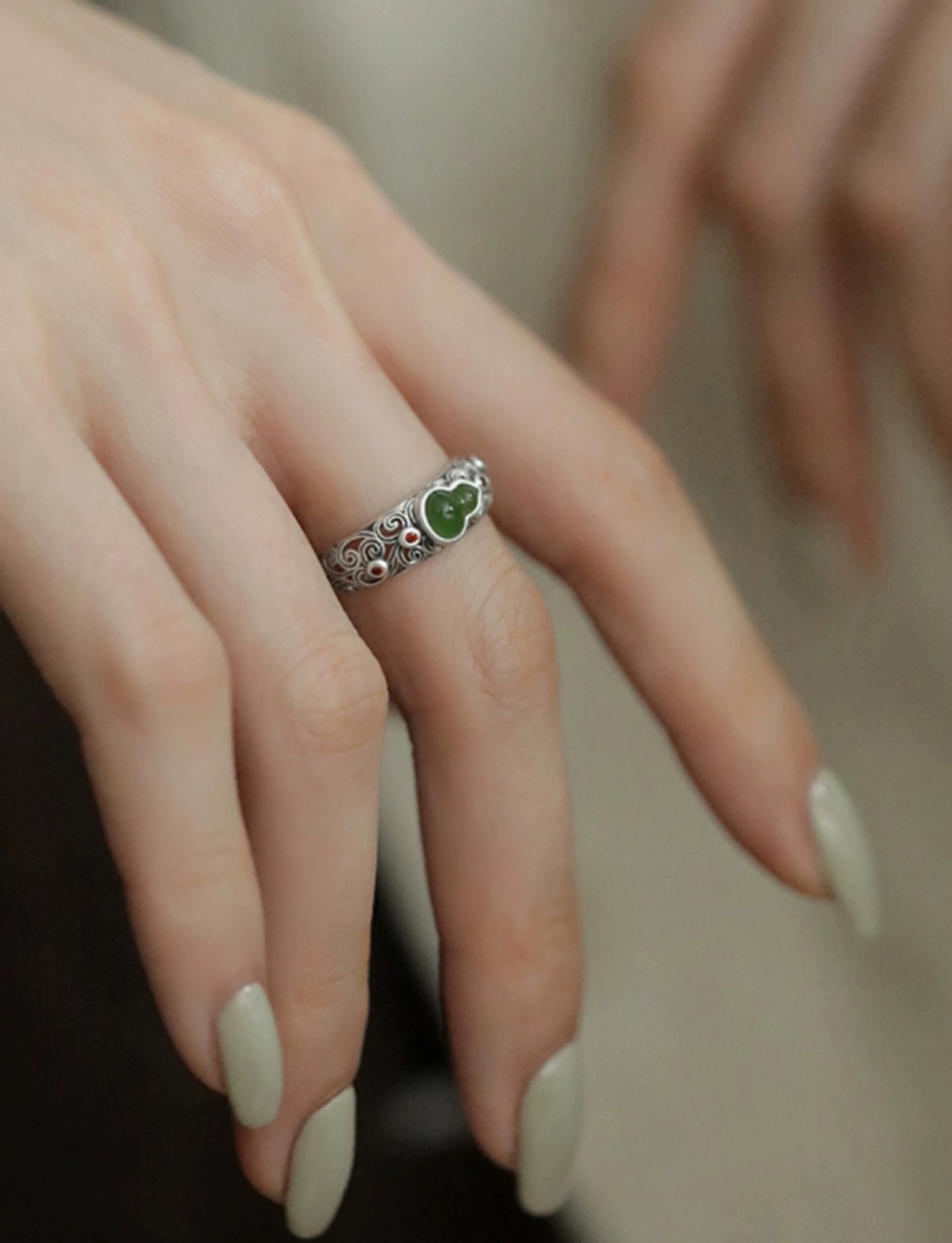 设计师手工制作镂空祥云平安葫芦戒指,葫芦是和田玉石,通体925银,镶嵌了红锆石,国风设计,平安葫芦寓意好。