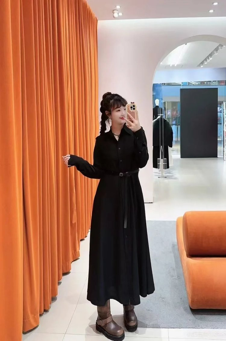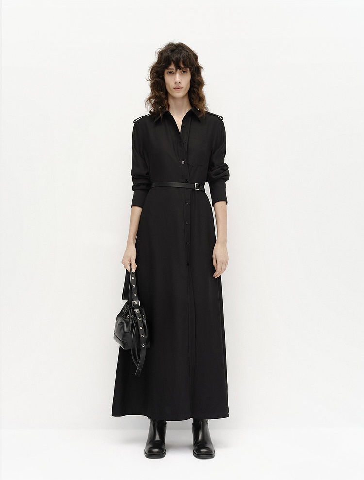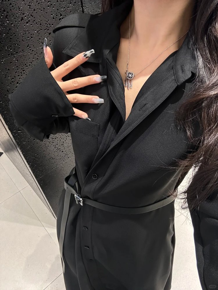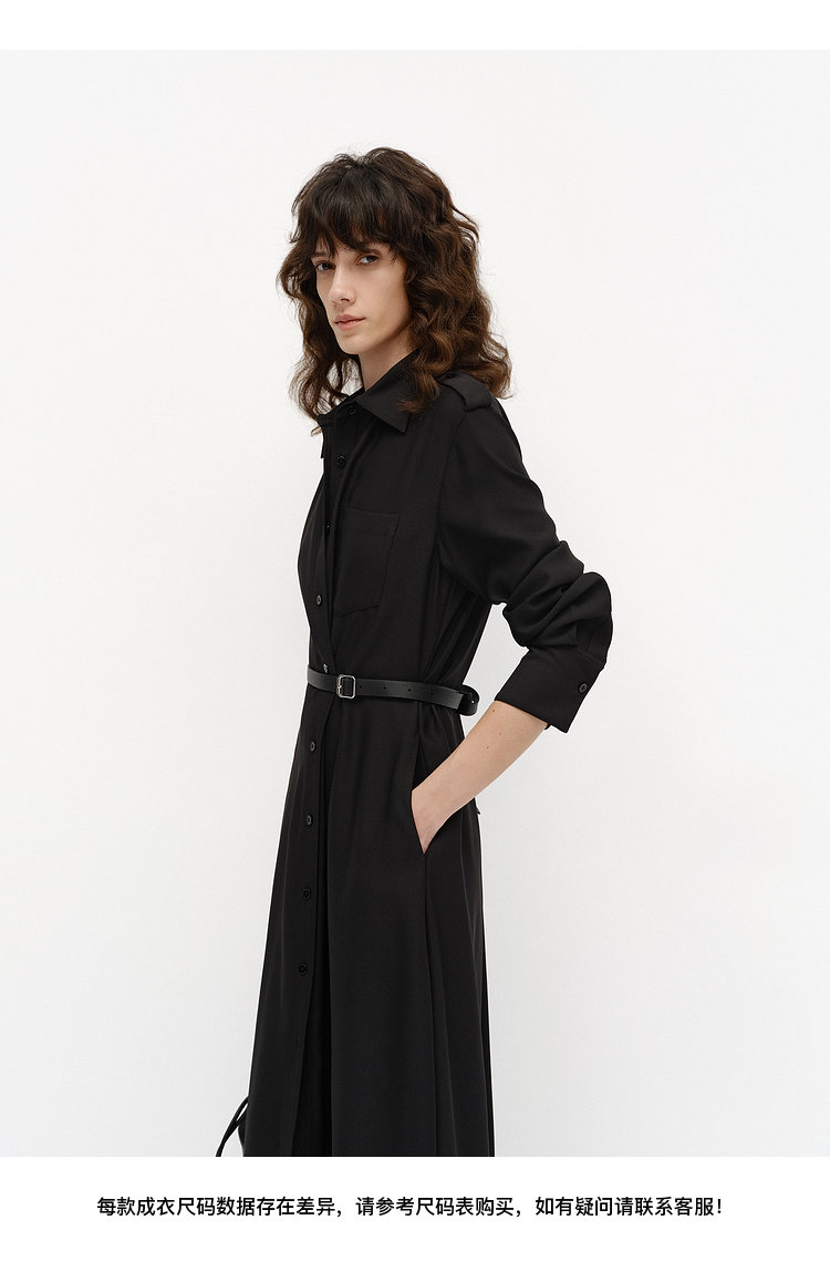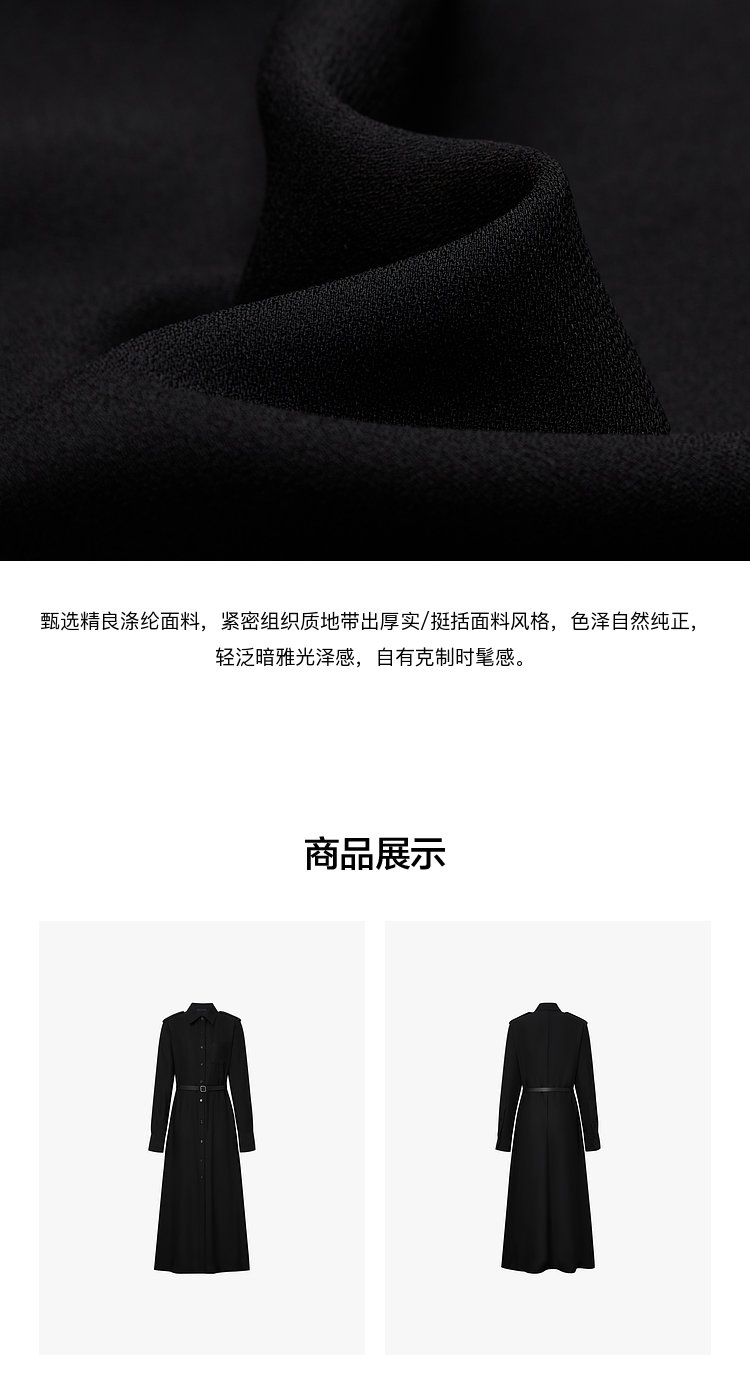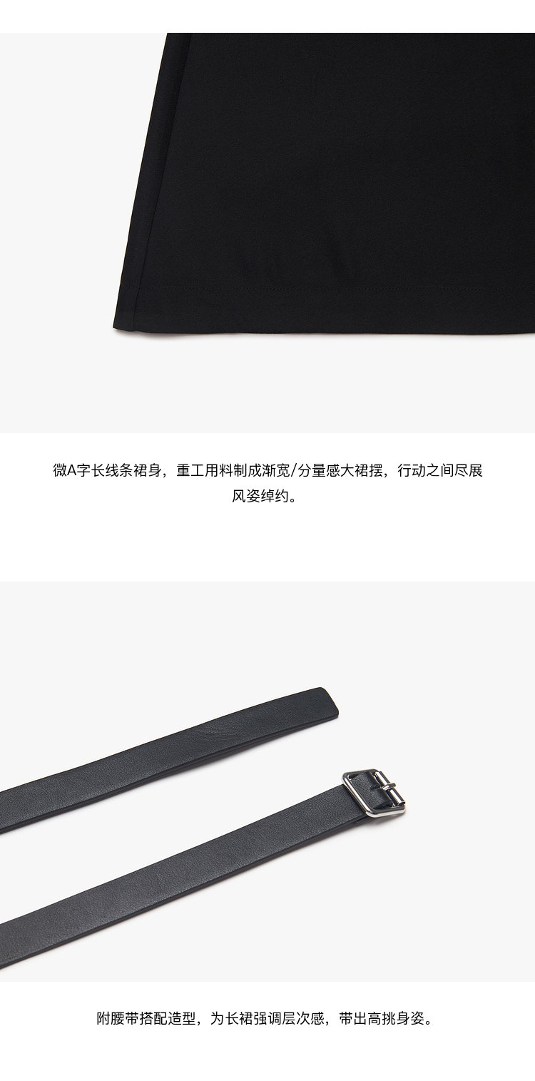 黑色挺括骨感长款高腰连衣裙 斜扣腰带衬衫裙 解锁高级感穿搭密码 不对称设计 精准收束腰线 微A字长线条裙身 分量感大裙摆 面料细腻垂坠