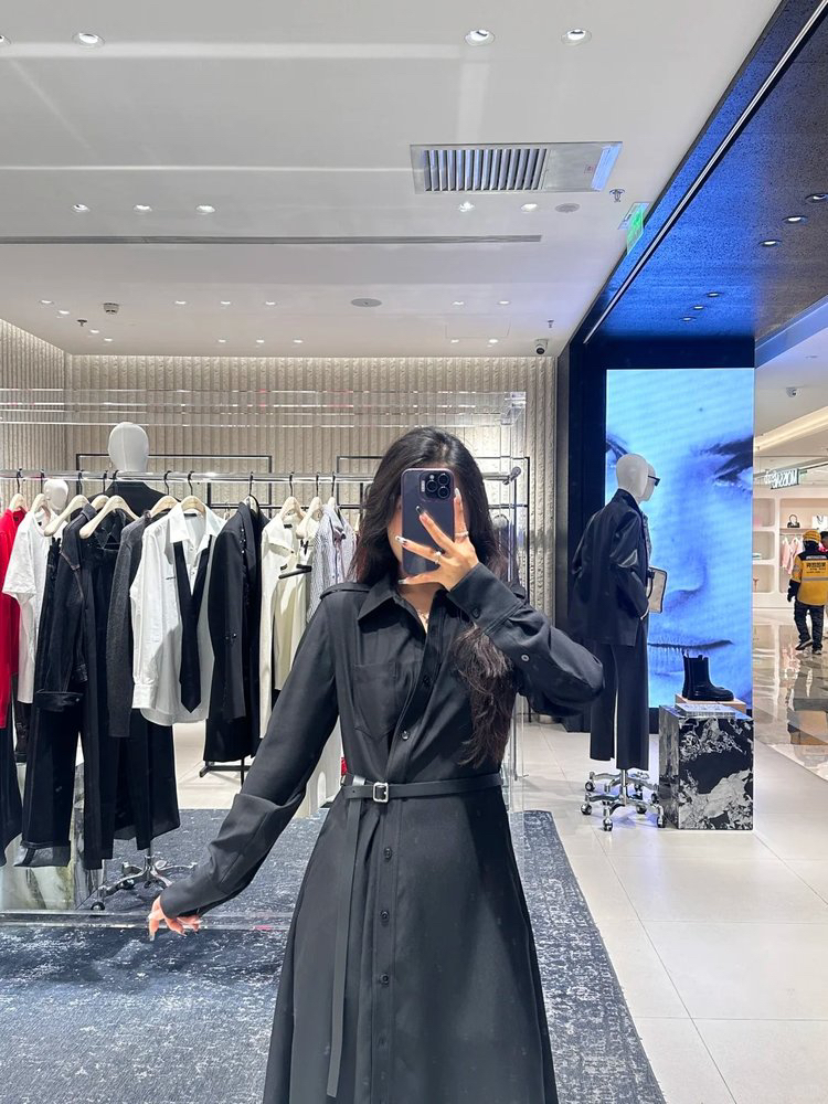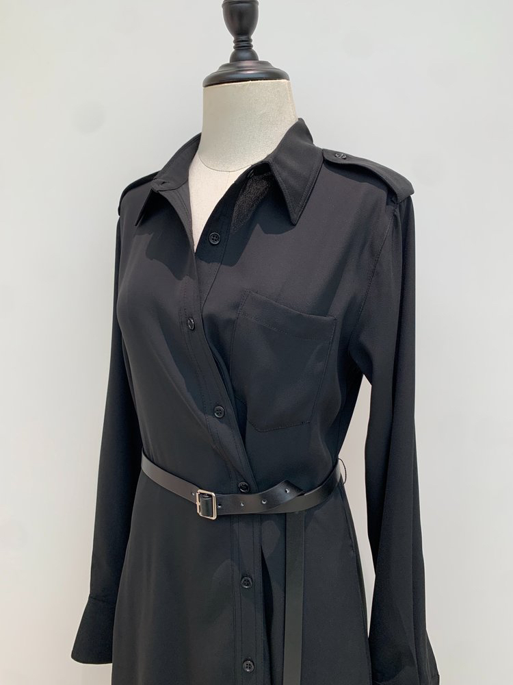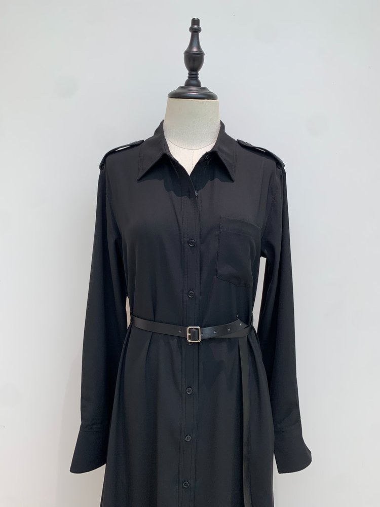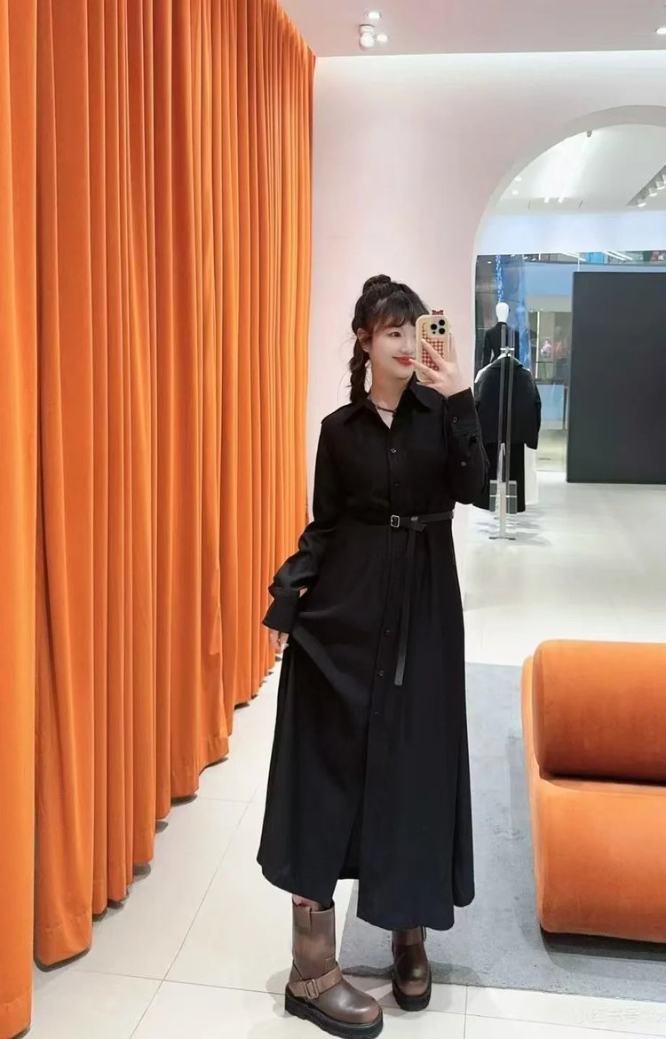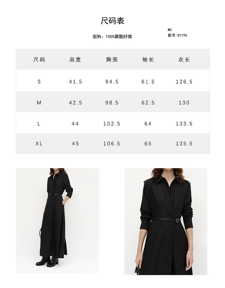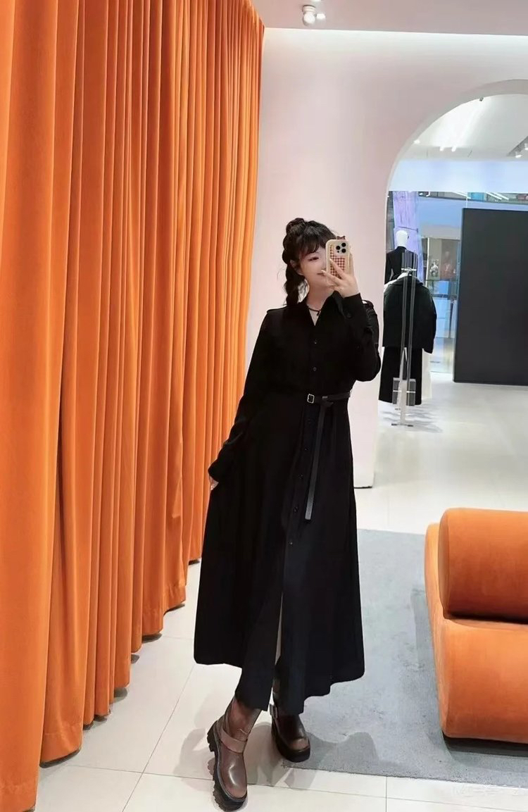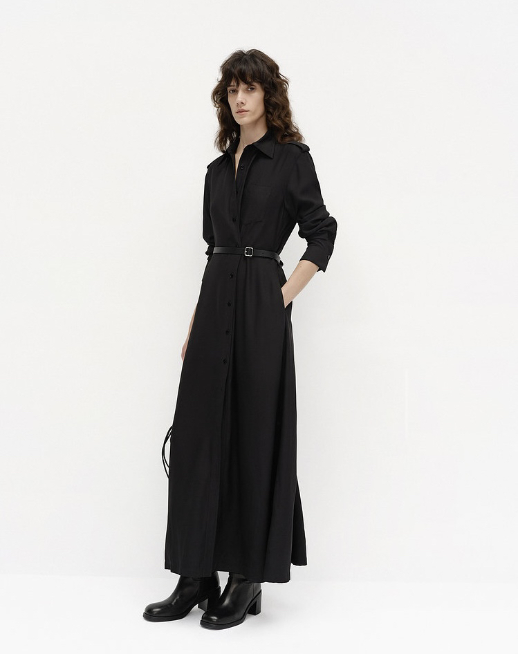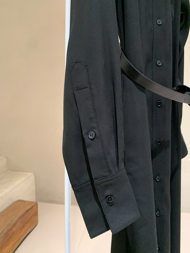 黑色挺括骨感长款高腰连衣裙 斜扣腰带衬衫裙 解锁高级感穿搭密码 不对称设计 精准收束腰线 微A字长线条裙身 分量感大裙摆 面料细腻垂坠