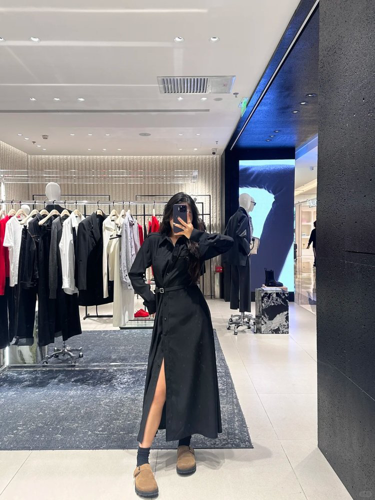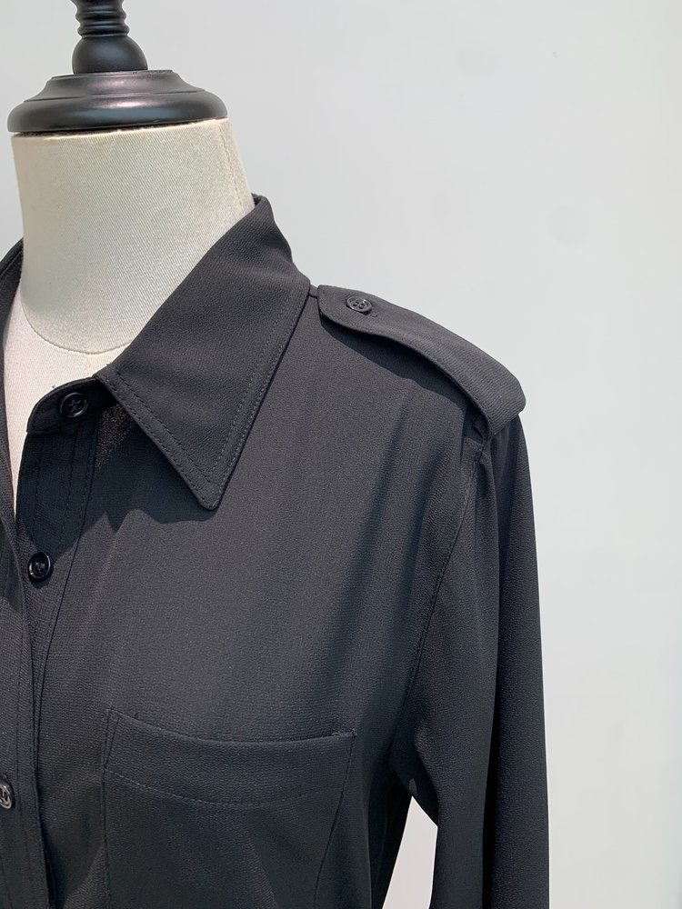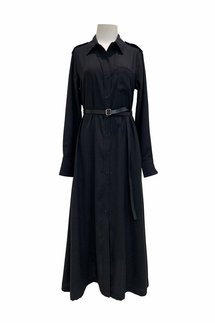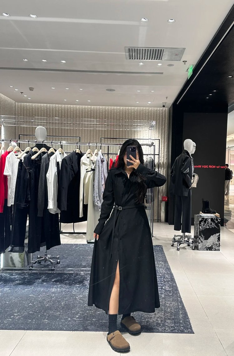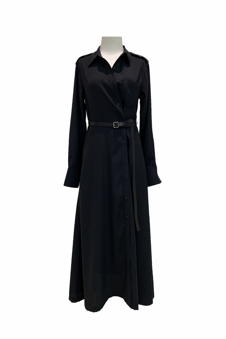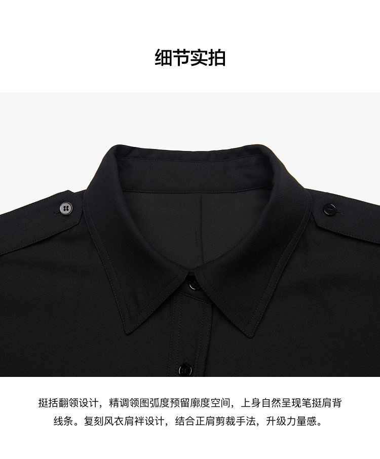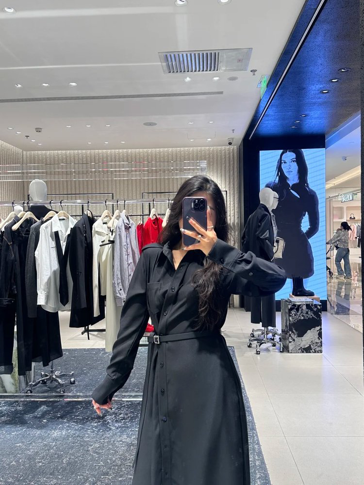 黑色挺括骨感长款高腰连衣裙 斜扣腰带衬衫裙 解锁高级感穿搭密码 不对称设计 精准收束腰线 微A字长线条裙身 分量感大裙摆 面料细腻垂坠