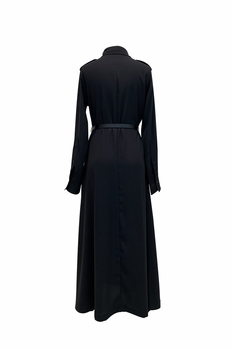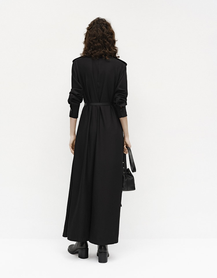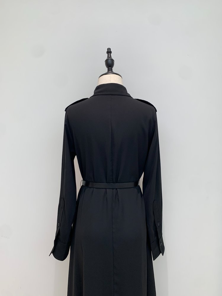 附腰带搭配造型,为长裙强调层次感,带出高挑身姿。复刻风衣肩袢设计,结合正肩剪裁手法,升级力量感。挺括翻领设计,精调领图弧度预留廓度空间,上身自然呈现笔挺肩背线条。