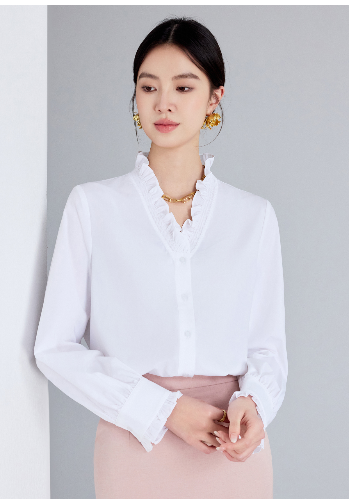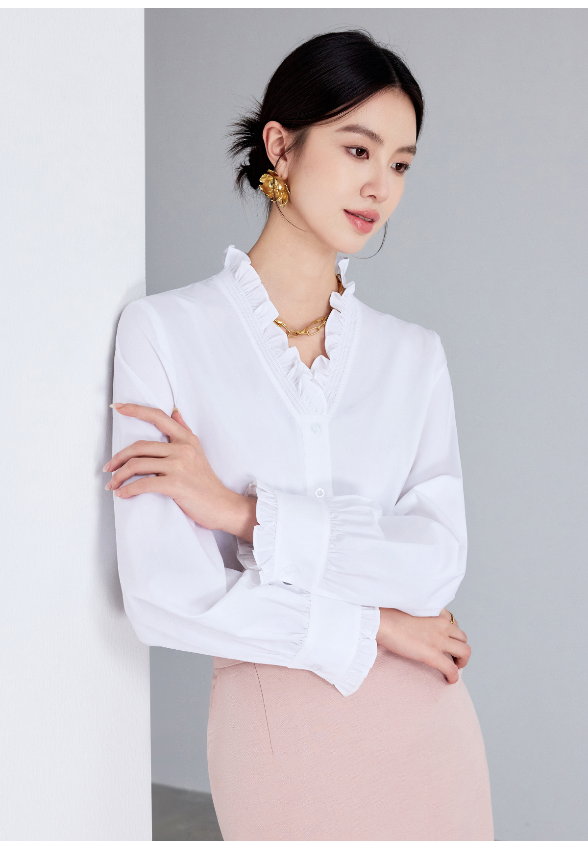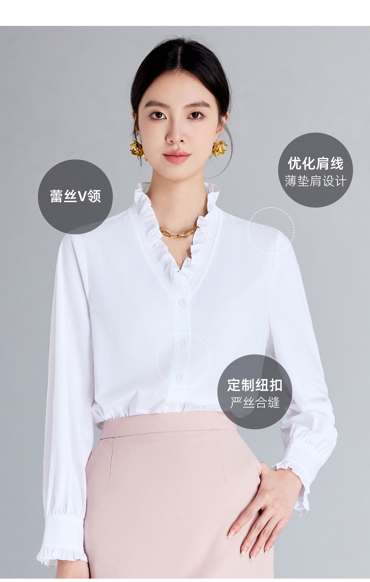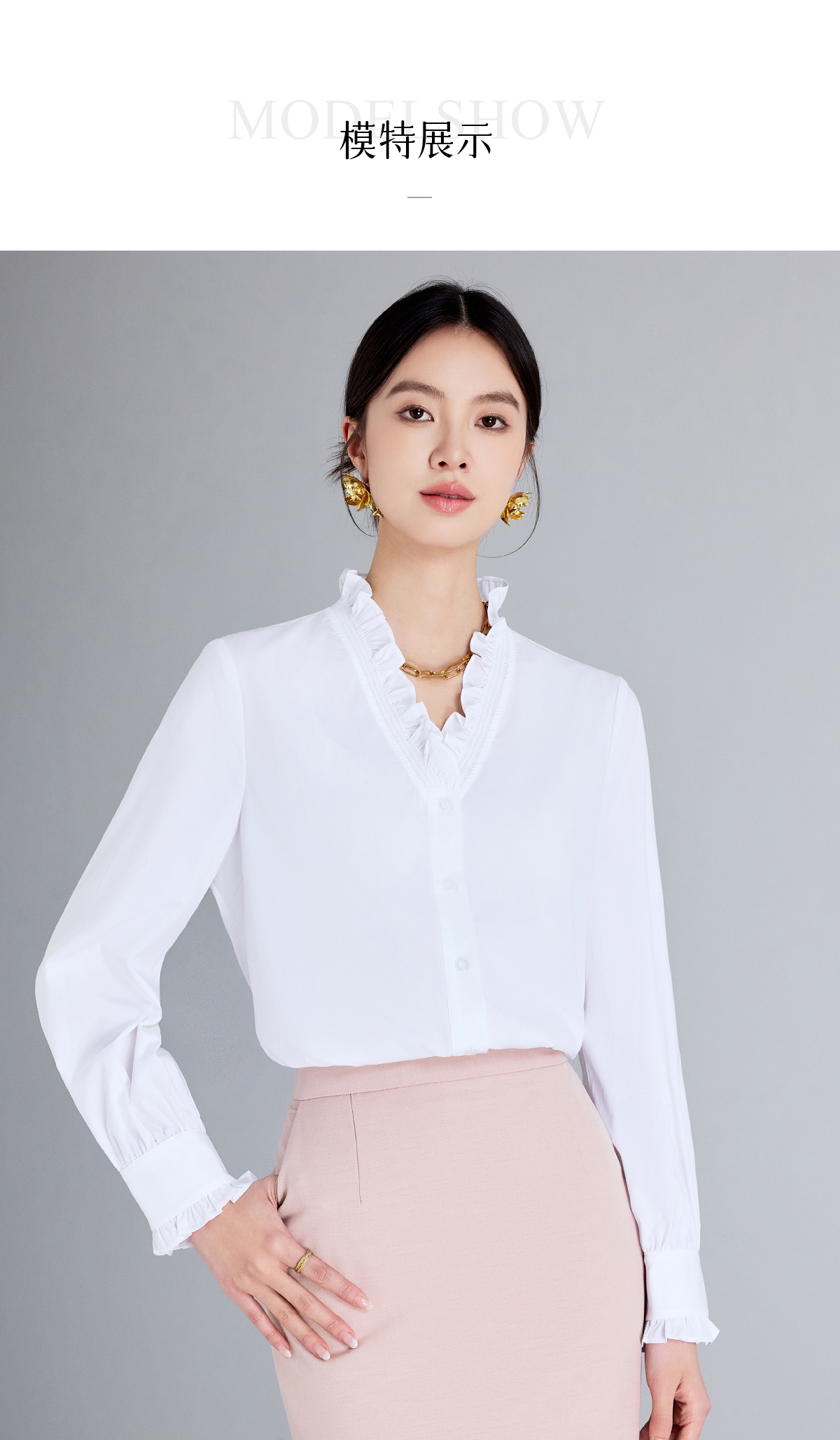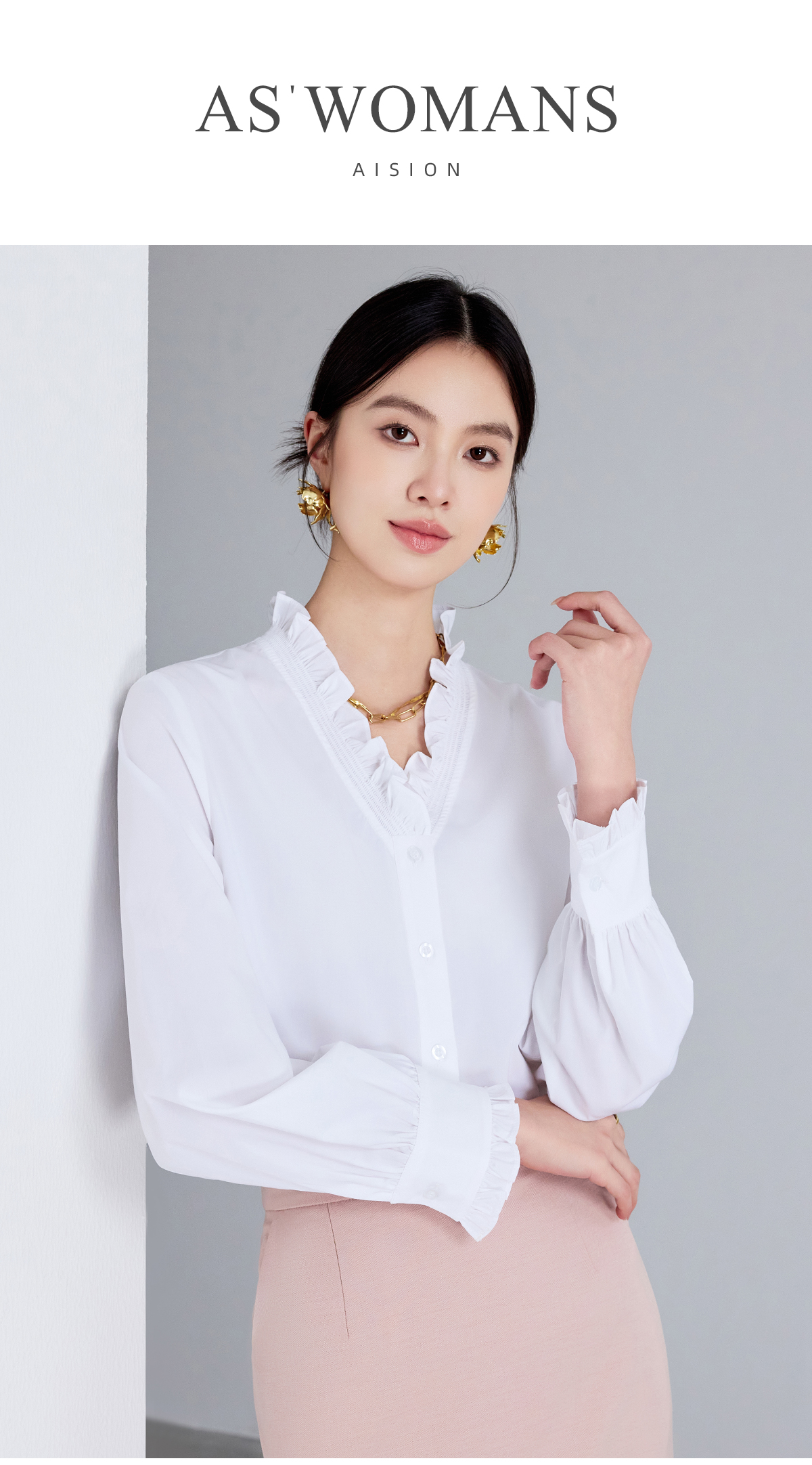 艾尚臣长袖衬衫女2025新款高级感精致V领木耳边通勤百搭法式衬衣