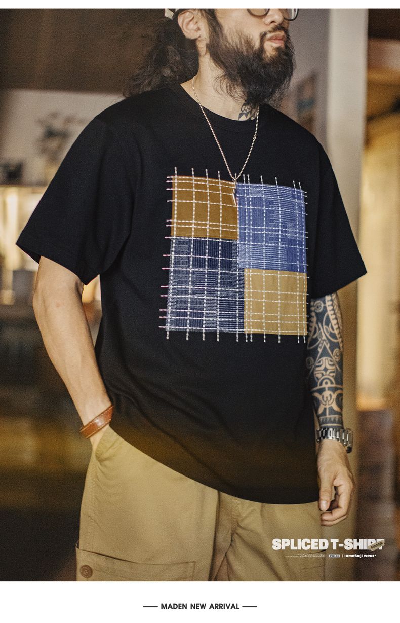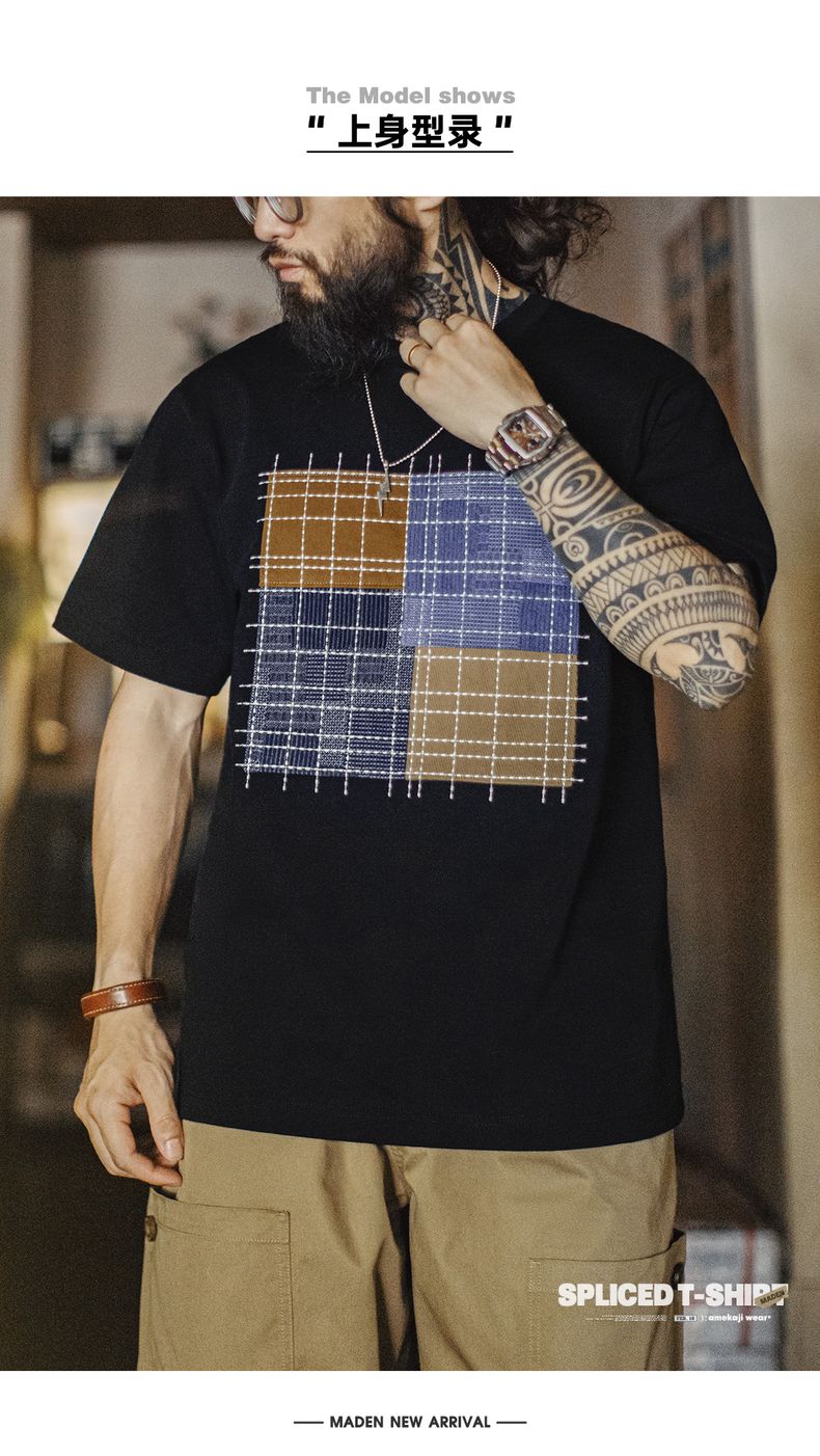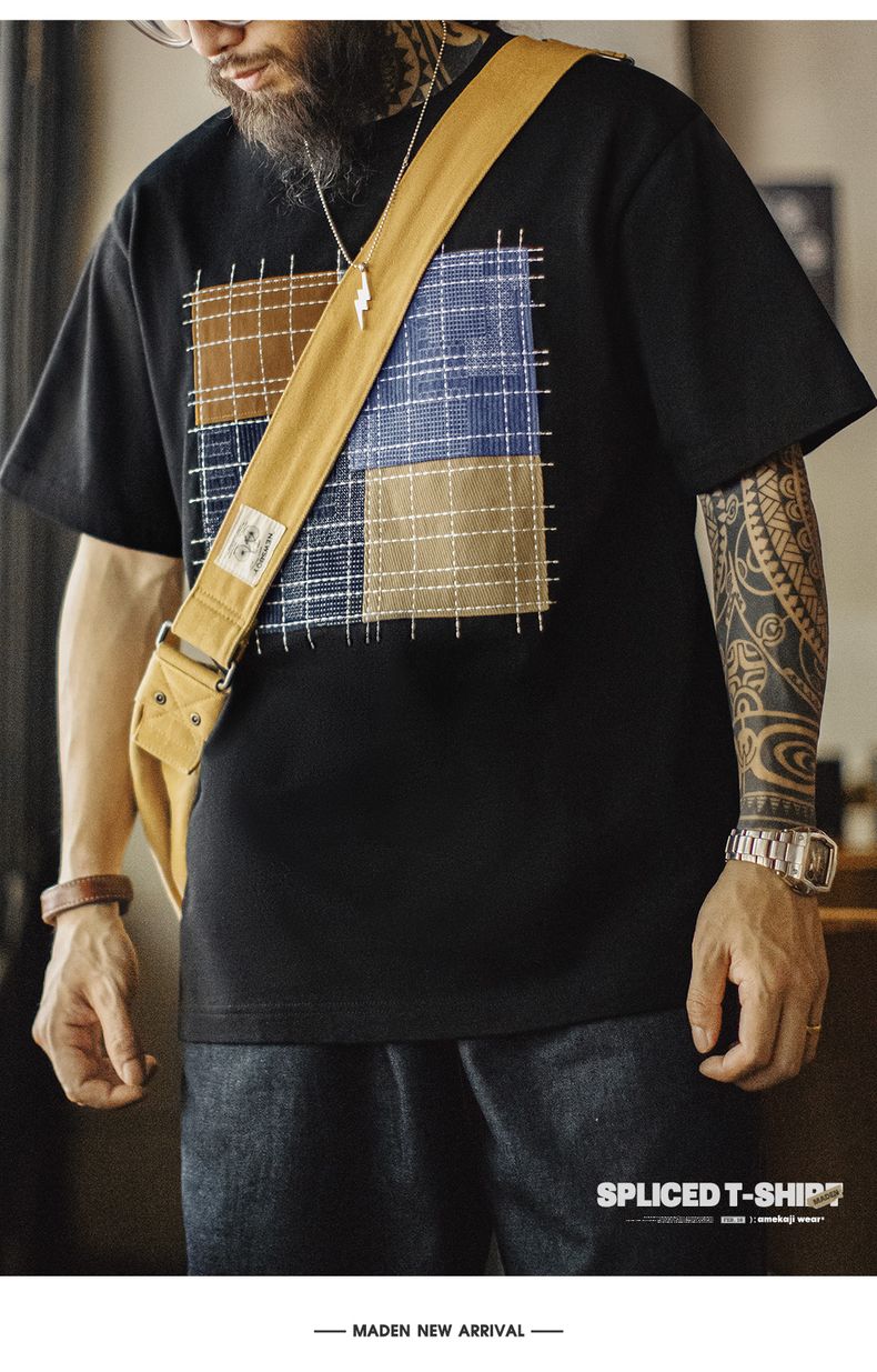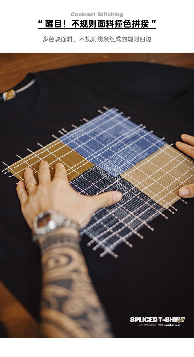 工装优选 日系复古撞色拼布短袖T恤纯棉透气设计感半袖Tee男夏