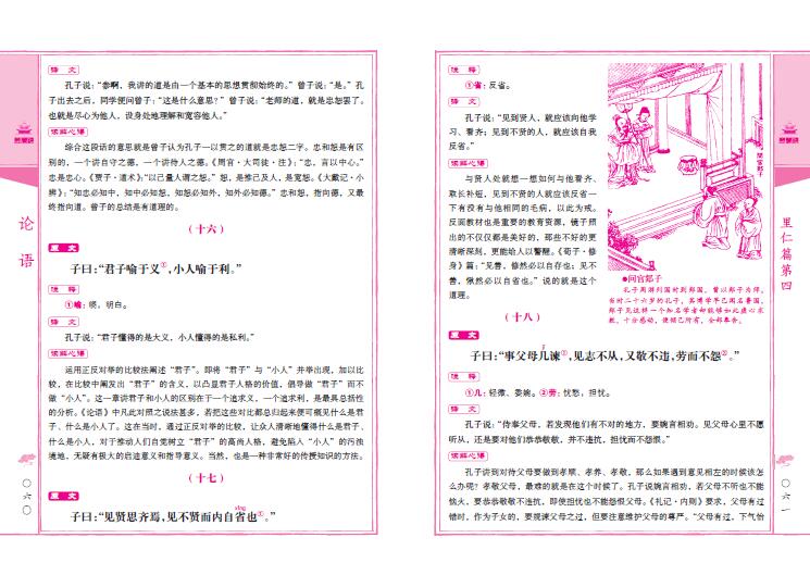 《论语》是我国先秦时期的一部语录体散文集,主要记载了孔子及其弟子的言行,比较集中地反映了孔子的思想。《论语》内容广博,涉及政治、教育、礼仪、经济、文学、天道观、认识论等方面,反映了孔子伦理体系基本的思想,这个体系的核心是;仁,实施;仁的手段和途径是;礼。《论语》中所记孔子循循善诱的教诲之言,或简单应答,点到即止;或启发论辩,侃侃而谈,富于变化,娓娓动人。