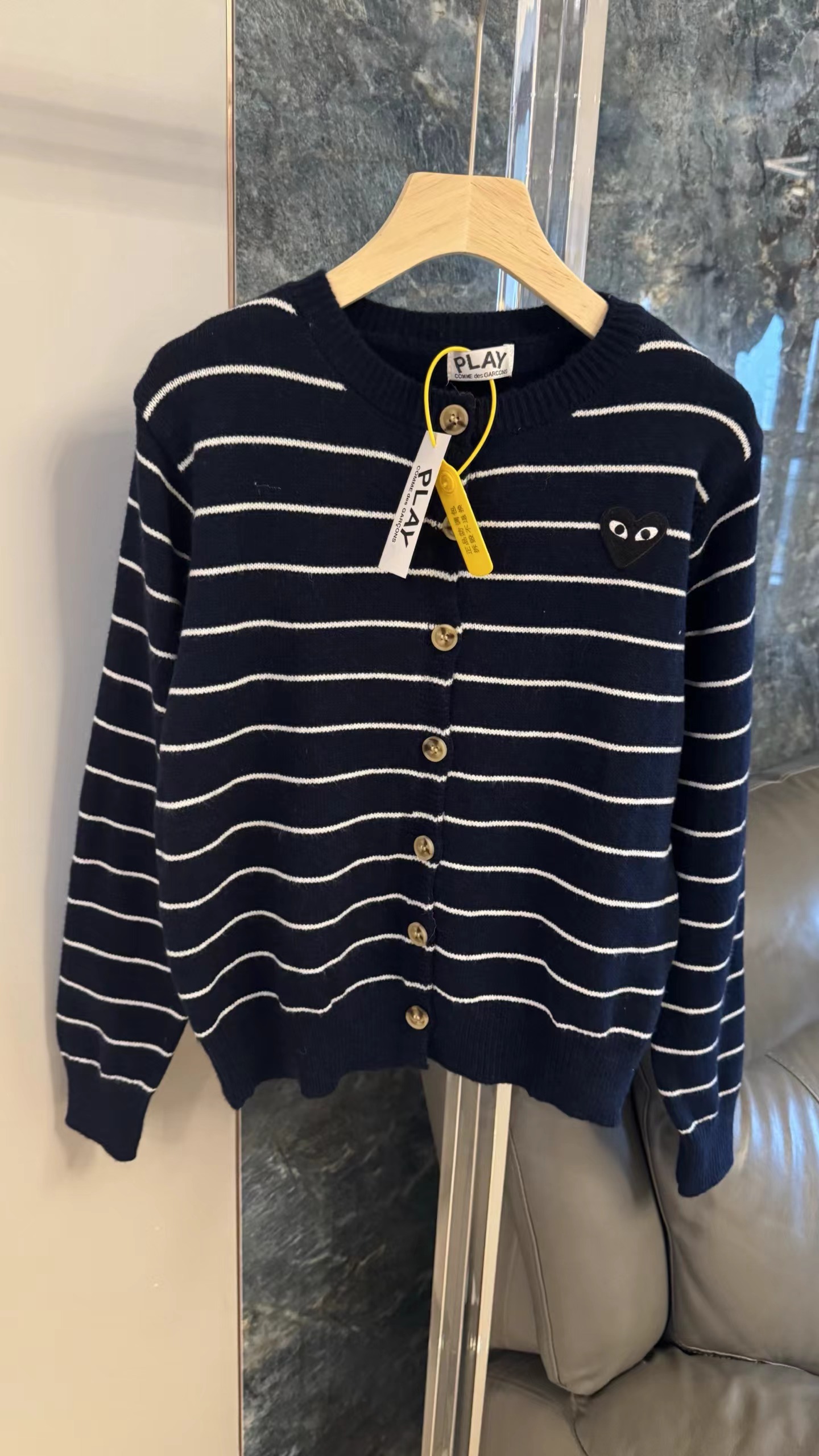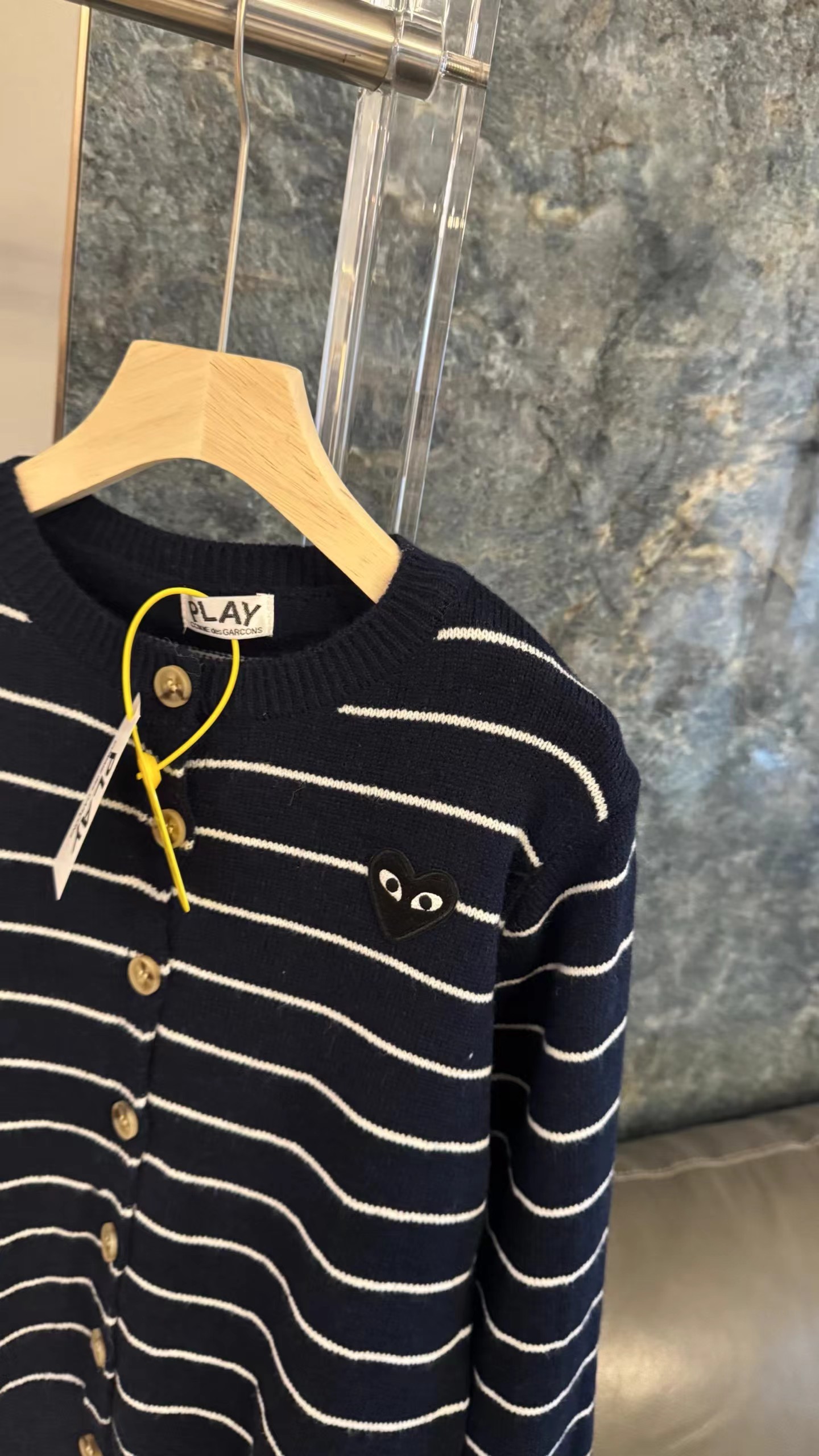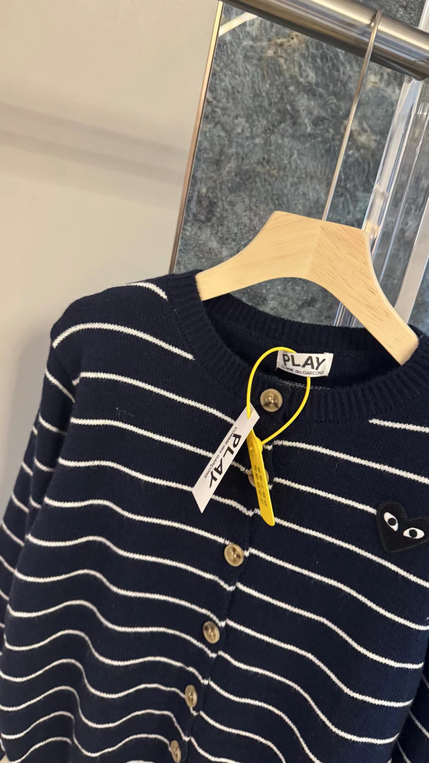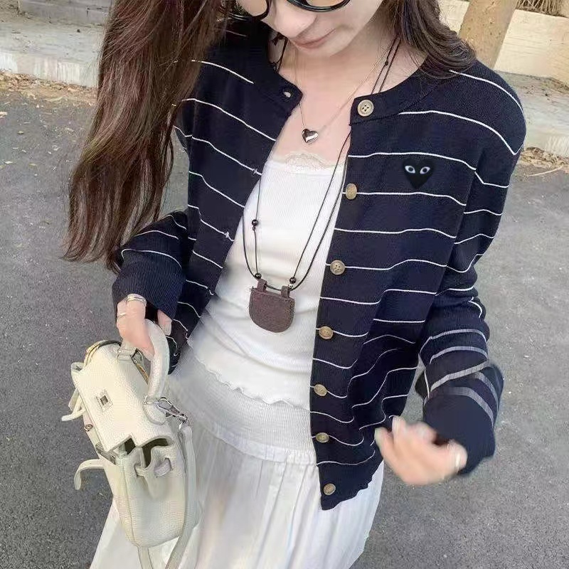 藏青条纹圆领针织开衫藏青色底+细白横条纹,低饱和色调,温柔又显气质,适配春夏过渡与初秋季节。微宽松直筒版型,不挑身材,既能修饰身形又保留松弛感,日常穿着舒适自在。圆领设计,简约利落,可半开扣穿法,露出内搭打造层次感。细腻针织面料,纹理轻薄透气,适合气温多变的季节,触感柔软亲肤。单排圆形木色纽扣,质感温润,与藏青底色形成对比,增添复古细节。左胸位置有标志性黑色爱心刺绣,爱心内带眼睛图案,提升辨识度与潮流感。长袖设计,袖口微收,贴合手腕,兼顾美观与实用性。
