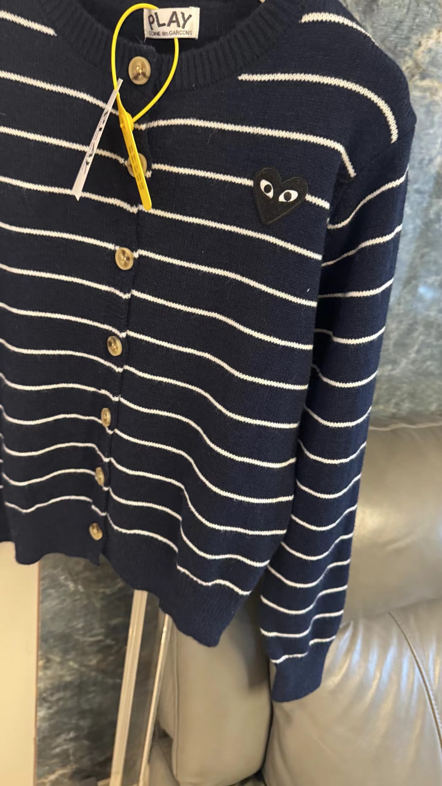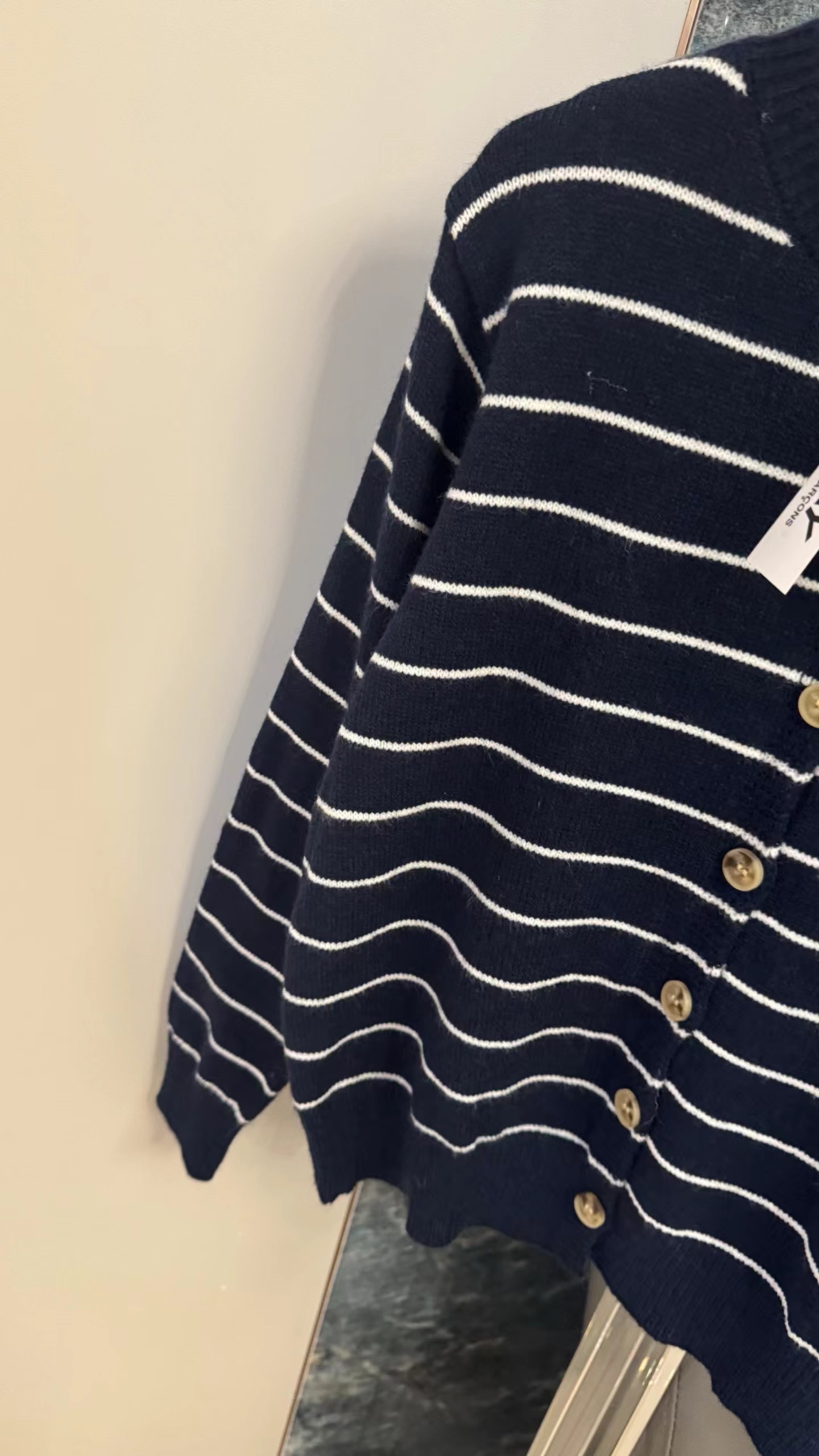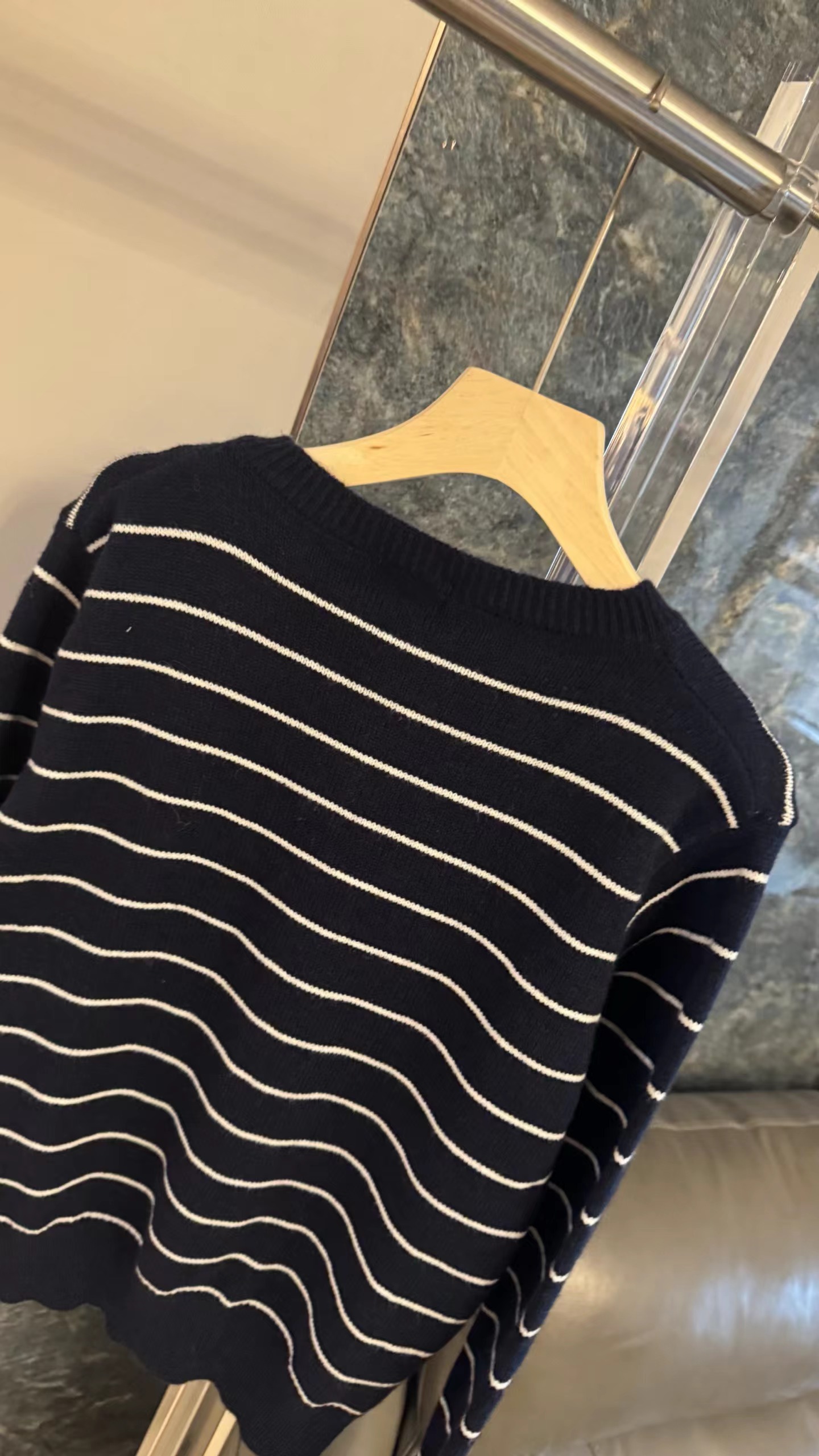 藏青条纹圆领针织开衫藏青色底+细白横条纹,低饱和色调,温柔又显气质,适配春夏过渡与初秋季节。微宽松直筒版型,不挑身材,既能修饰身形又保留松弛感,日常穿着舒适自在。圆领设计,简约利落,可半开扣穿法,露出内搭打造层次感。细腻针织面料,纹理轻薄透气,适合气温多变的季节,触感柔软亲肤。单排圆形木色纽扣,质感温润,与藏青底色形成对比,增添复古细节。左胸位置有标志性黑色爱心刺绣,爱心内带眼睛图案,提升辨识度与潮流感。长袖设计,袖口微收,贴合手腕,兼顾美观与实用性。