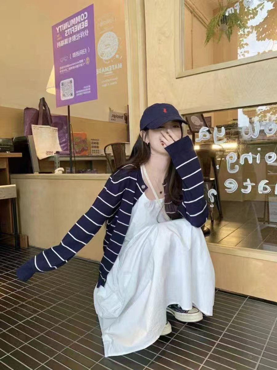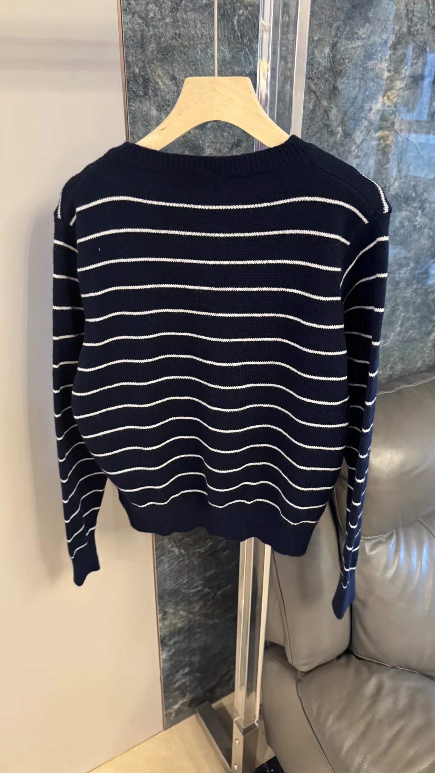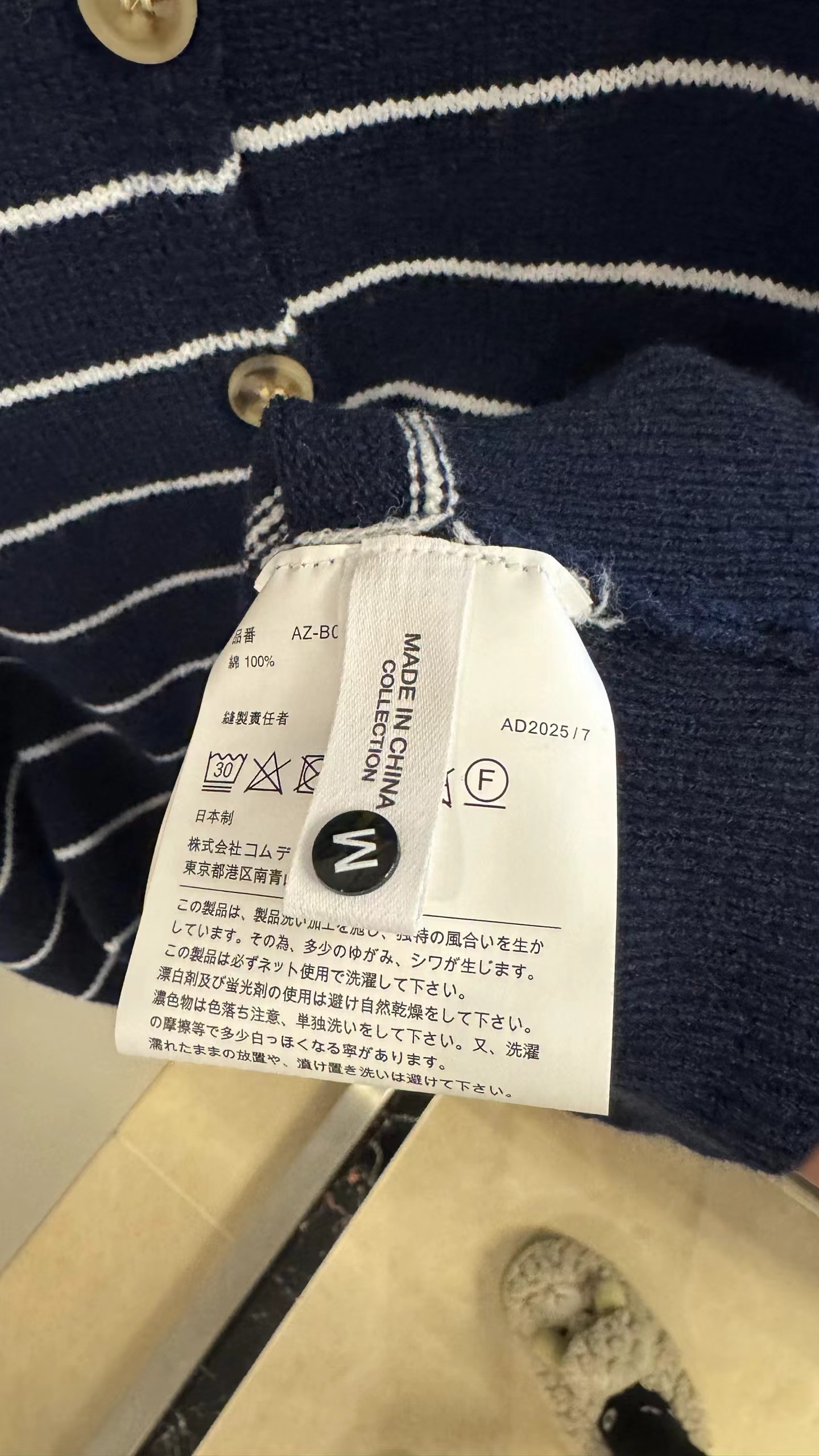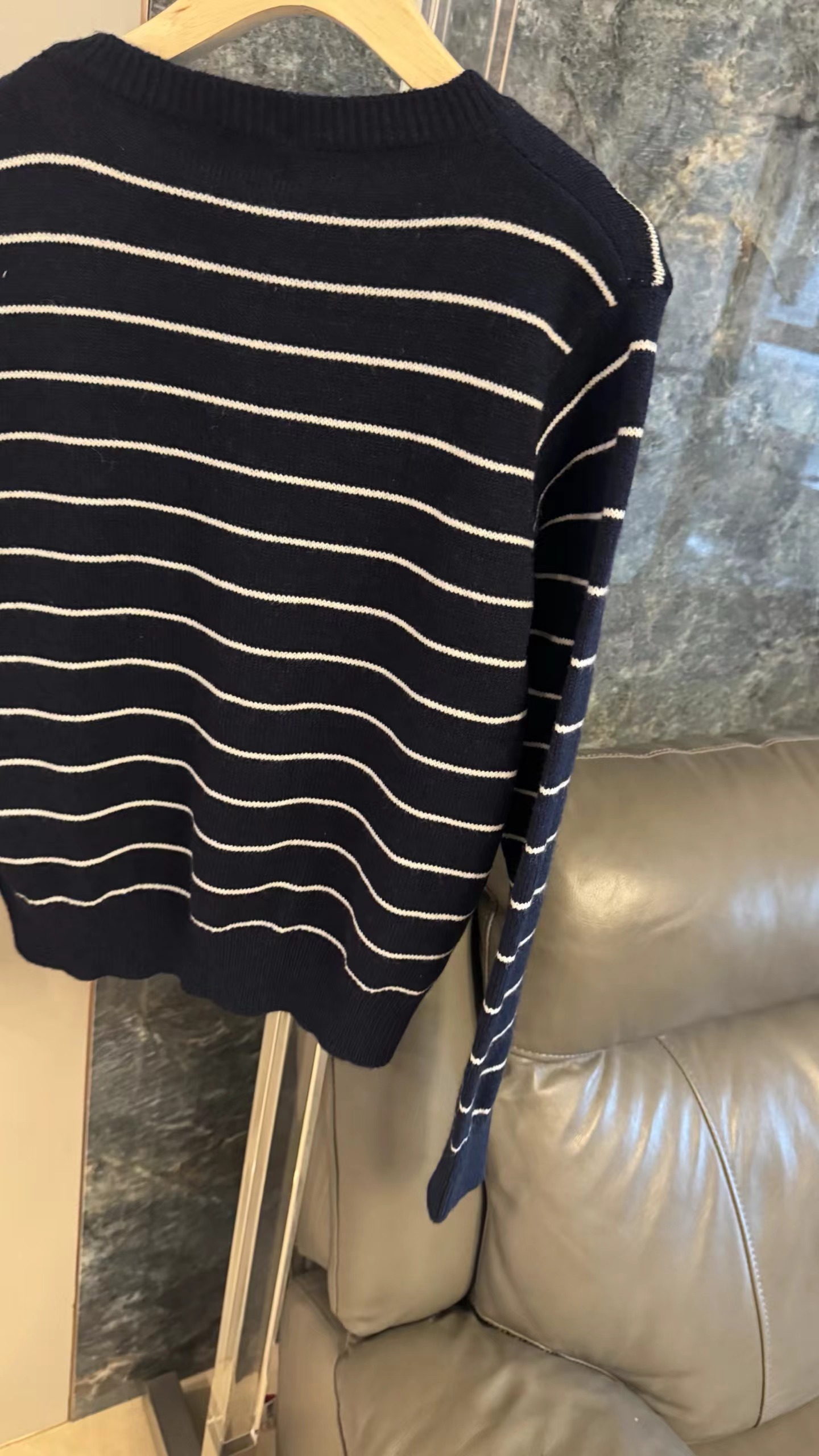 藏青条纹圆领针织开衫藏青色底+细白横条纹,低饱和色调,温柔又显气质,适配春夏过渡与初秋季节。微宽松直筒版型,不挑身材,既能修饰身形又保留松弛感,日常穿着舒适自在。圆领设计,简约利落,可半开扣穿法,露出内搭打造层次感。细腻针织面料,纹理轻薄透气,适合气温多变的季节,触感柔软亲肤。单排圆形木色纽扣,质感温润,与藏青底色形成对比,增添复古细节。左胸位置有标志性黑色爱心刺绣,爱心内带眼睛图案,提升辨识度与潮流感。长袖设计,袖口微收,贴合手腕,兼顾美观与实用性。