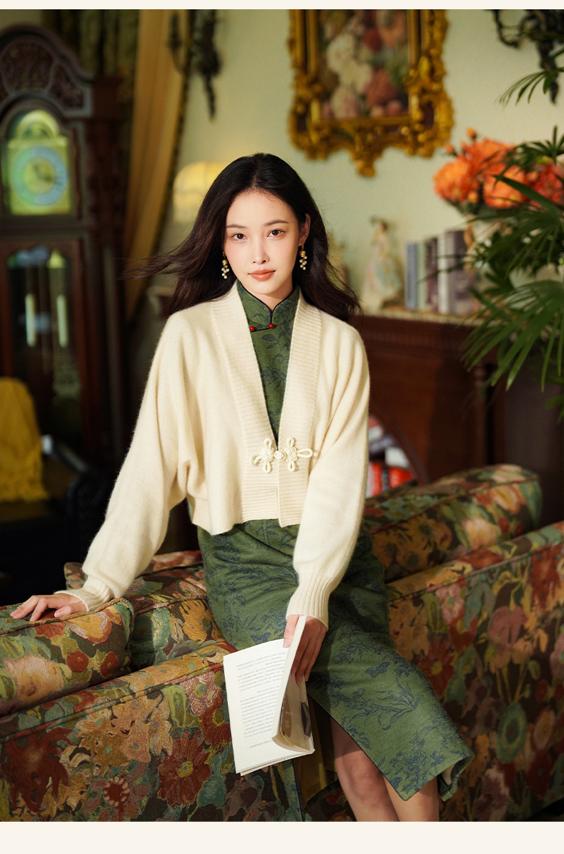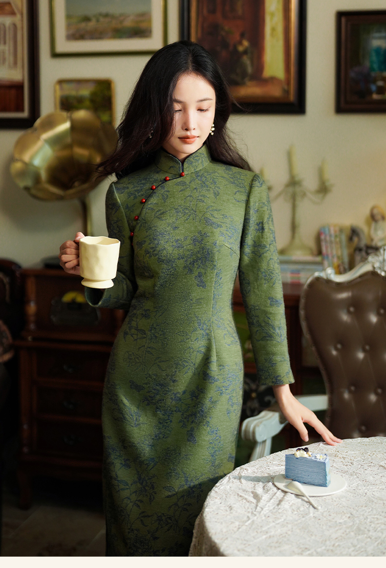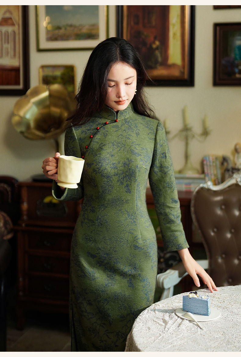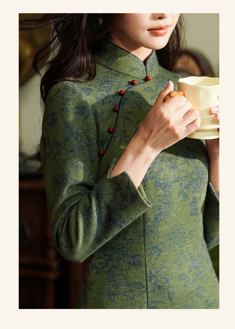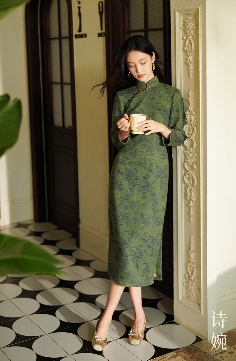 逸红颜诗婉2025冬新款加厚磨毛针织牡丹印花新中式日常素雅旗袍女