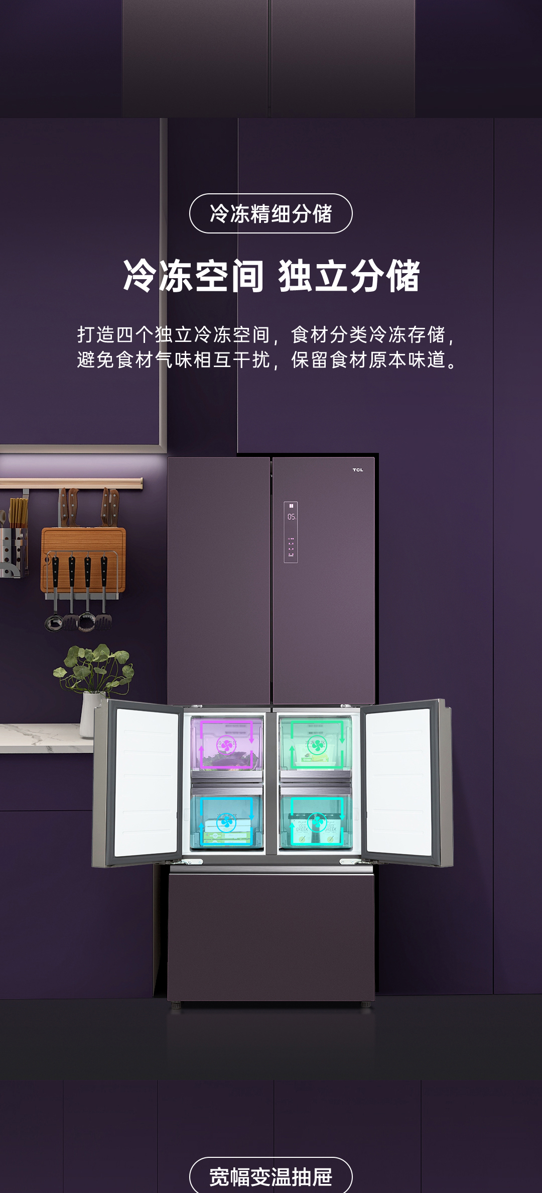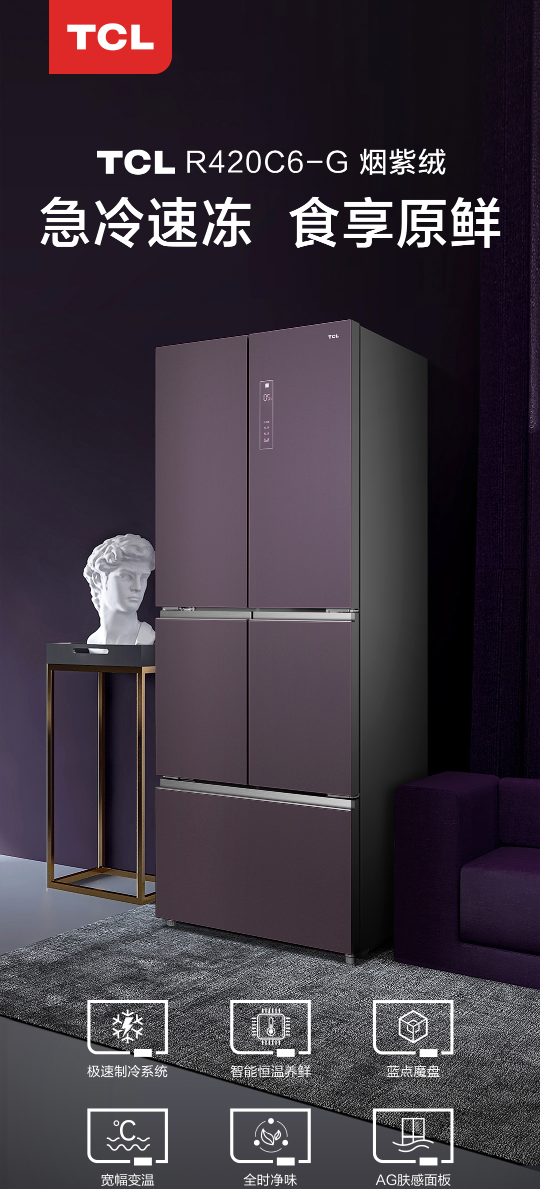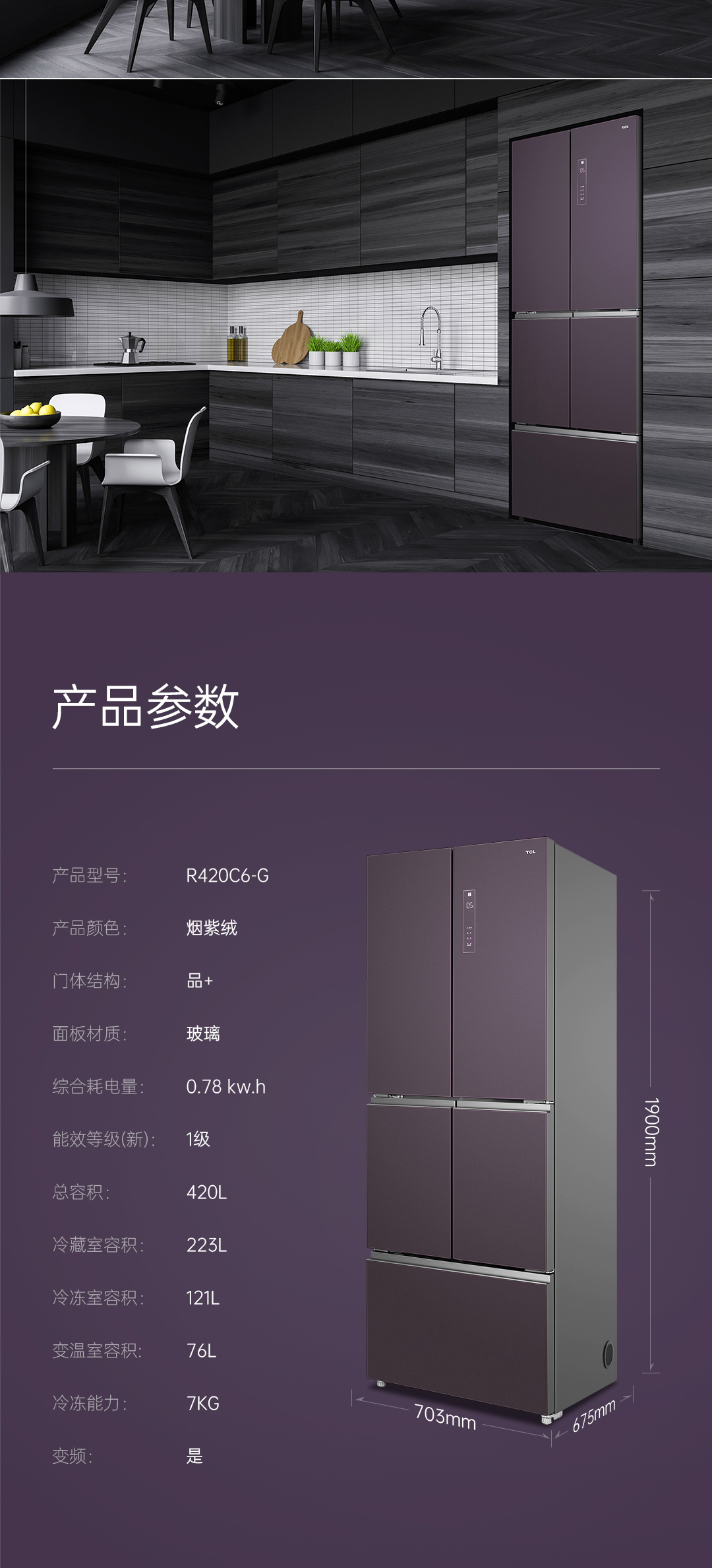 【TCL冰箱】TCL R420C6-G烟紫绒 420升急冷速冻法式多门冰箱
