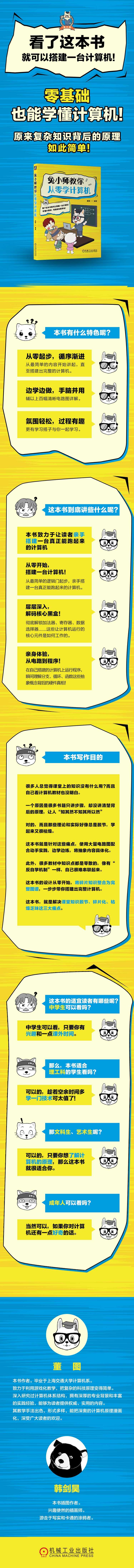 兔小师是书中的虚拟卡通形象。为了让教学方式生动有趣,作者设计了一个导师加三个学生共同学习的场景,包括兔小师(兔子老师)、苗小萌(小猫)、汪小新(小狗)、姬小菜(小鸡),用轻松诙谐的故事化课堂,唤醒每一位读者的探索欲。本书首先介绍了计算机基本概念、二进制原理、逻辑门、组合逻辑、计算单元、记忆单元、存储器等核心知识,接着介绍了手动计算机系统、单周期计算机系统、时序电路、多周期计算机系统、汇编程序、中断、I/O设备等进阶内容。全书逻辑严密,层层递进,将抽象的计算机理论、数学计算与编程底层逻辑转化为具象的认知框架,帮助读者建立系统而完整的知识体系。通过阅读本书,读者不仅能轻松掌握计算机的核心原理,更能培养出严谨的逻辑思维能力,为未来学习与工作中应对各类计算机相关问题打下坚实基础。
