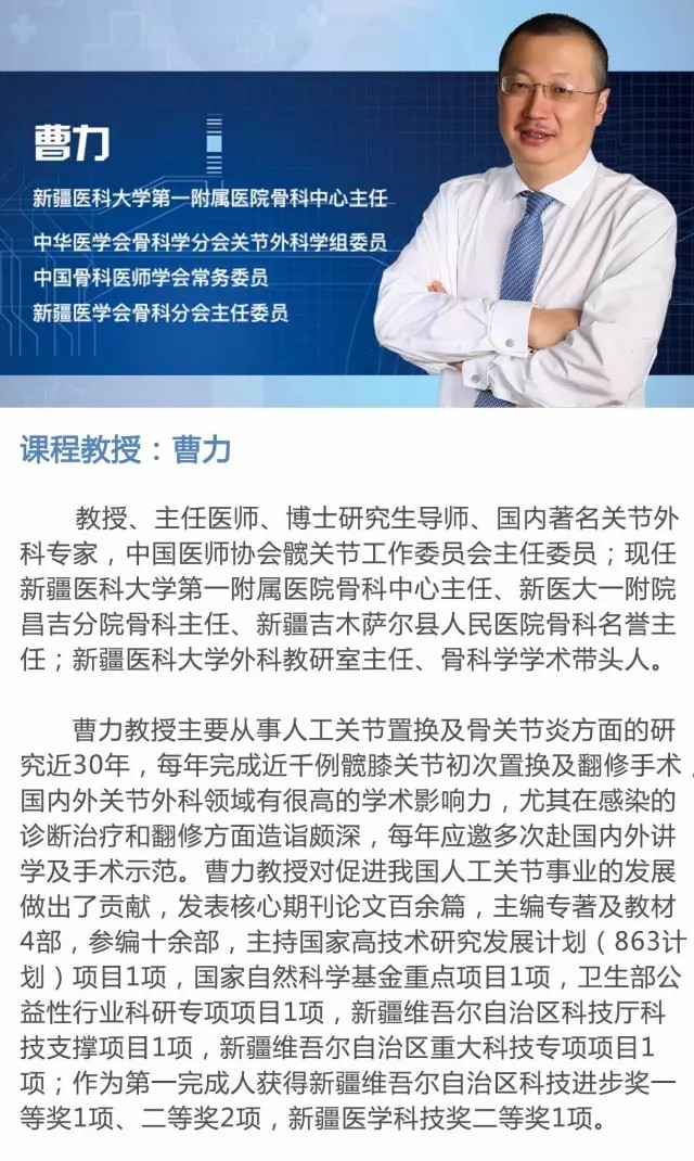 视频课程由新疆医科大学第一附属医院骨科中心主任曹力教授主讲,曹力教授专场授课凝聚关节外科精髓,以手术为核心讲解医生最关注的临床疑问,注重实战导向性系统的基础理论讲述与实际病例相结合。