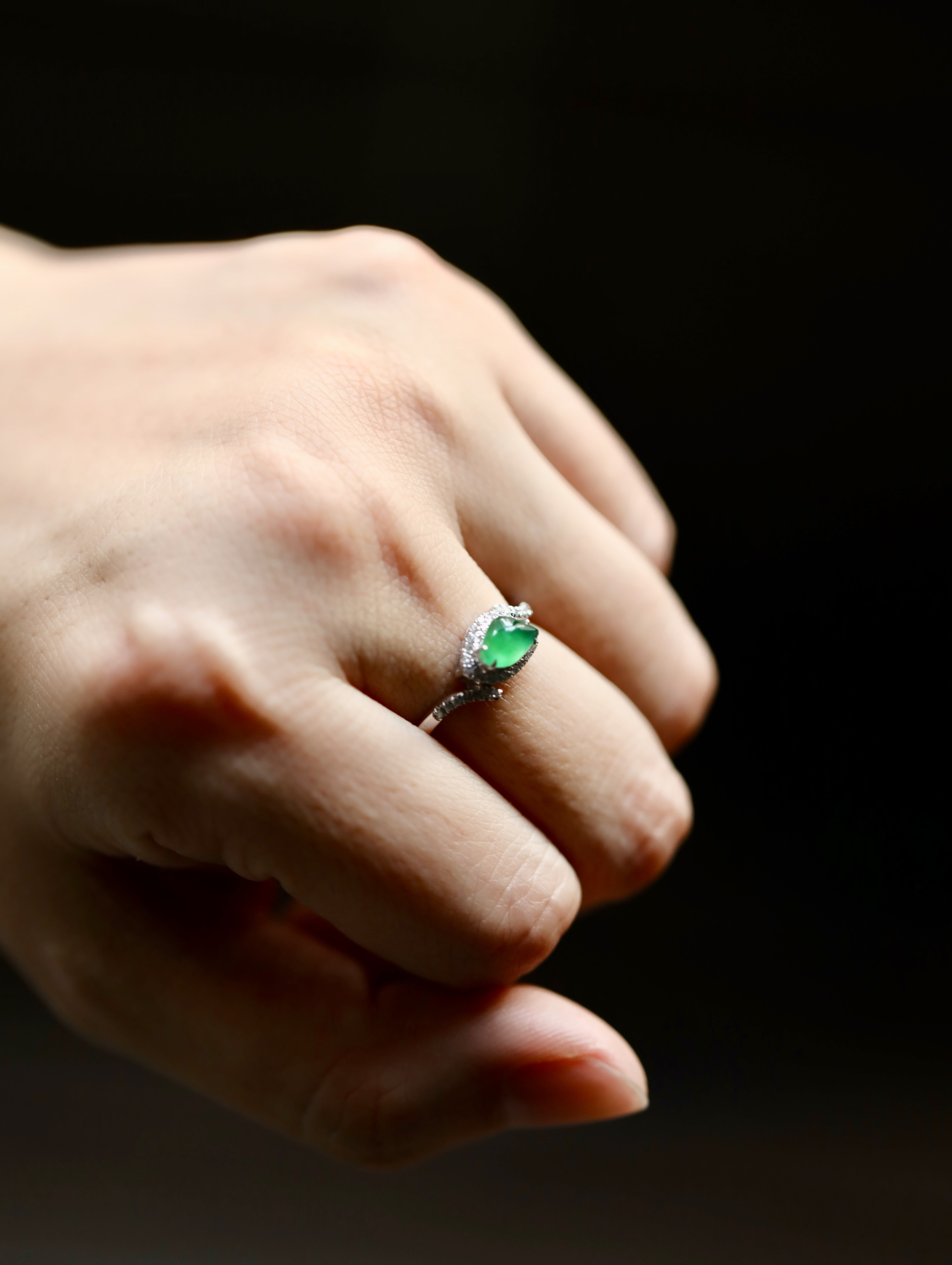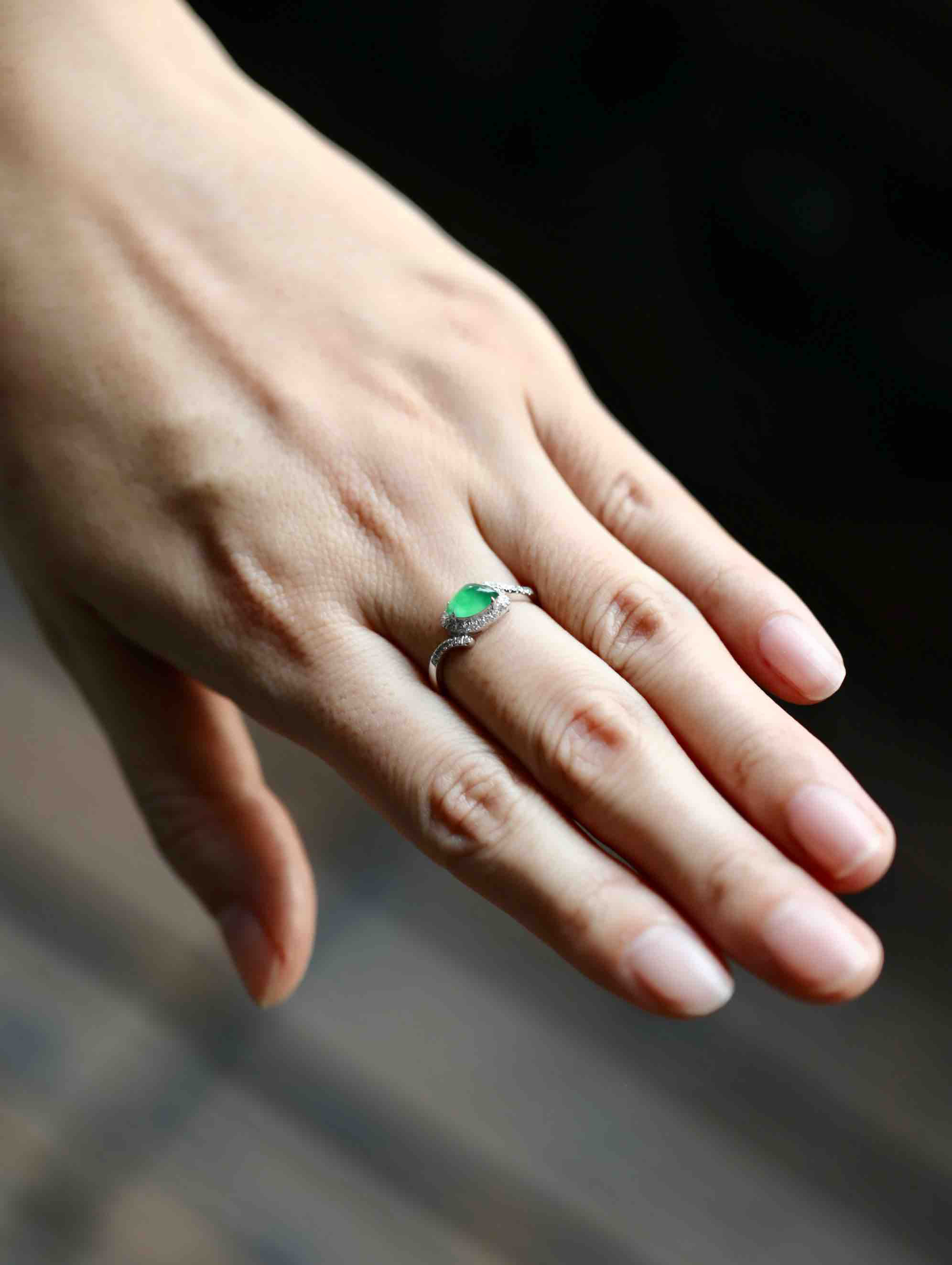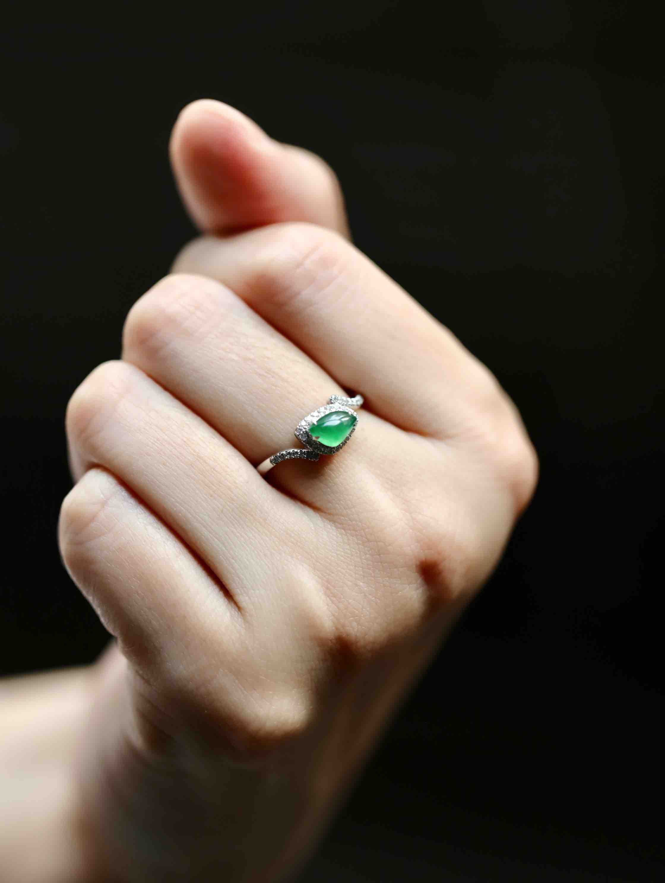 高冰种阳绿翡翠戒指18k白金钻石镶嵌
